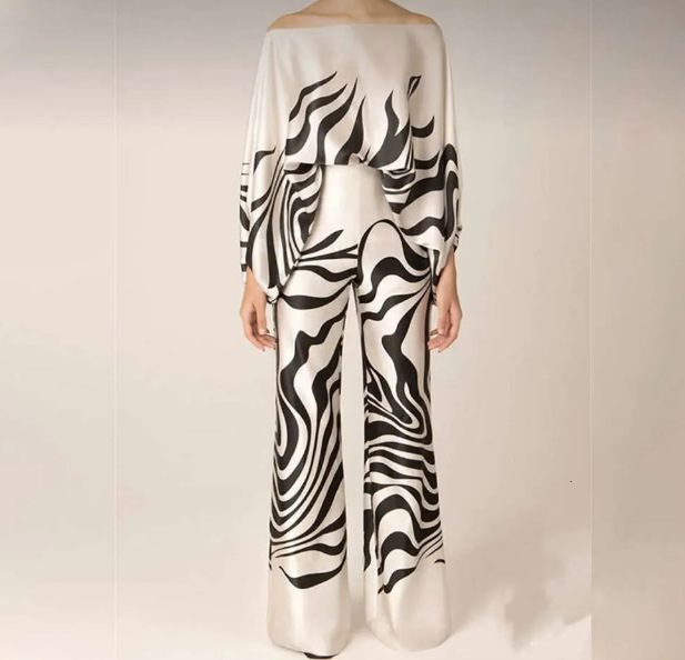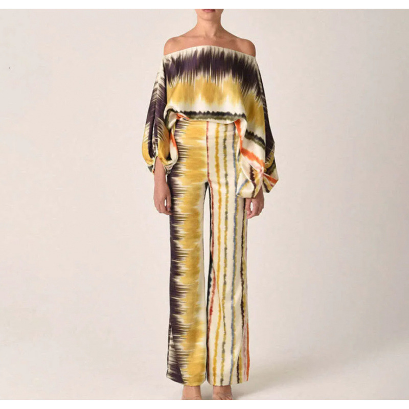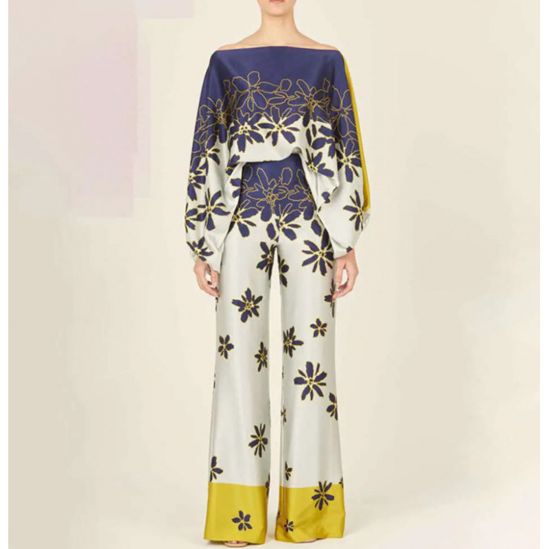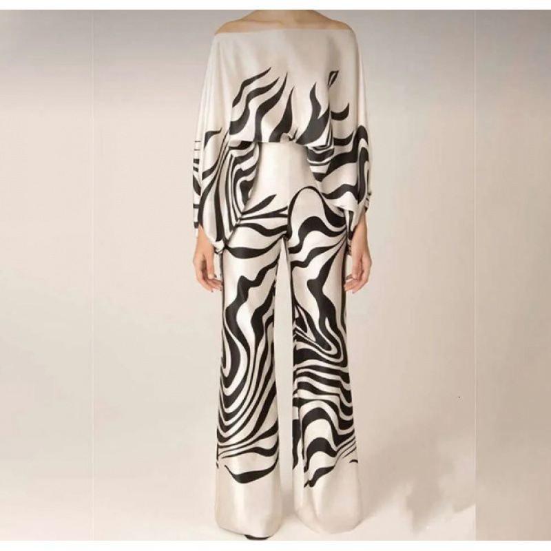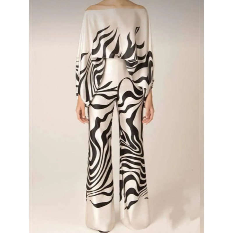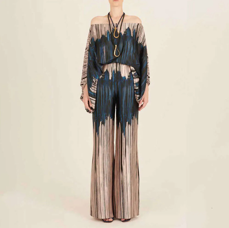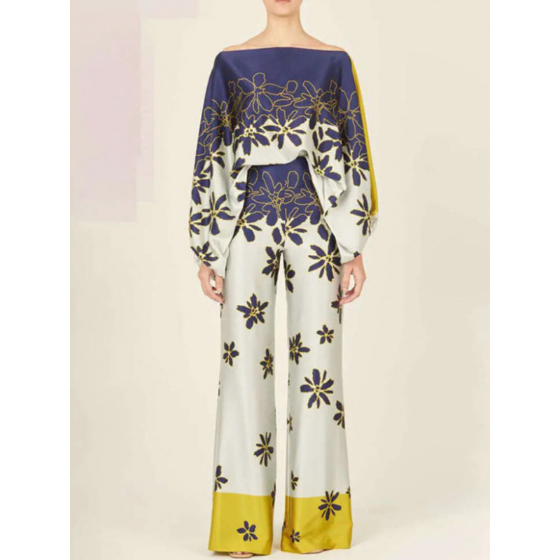 국경 간 봄과 가을 새로운 유럽과 미국 여성의 인쇄 된 둥근 목 느슨한 가슴 소매 허리 넓은 다리 바지 패션 캐주얼 세트