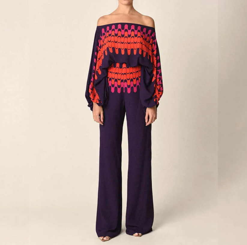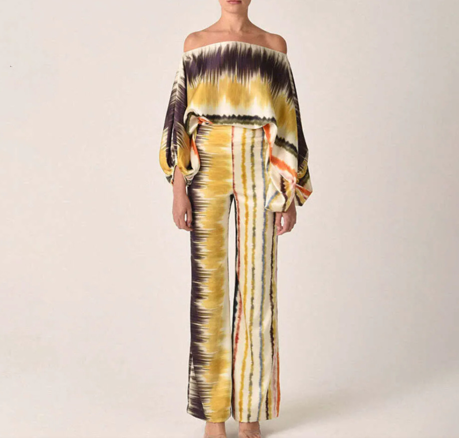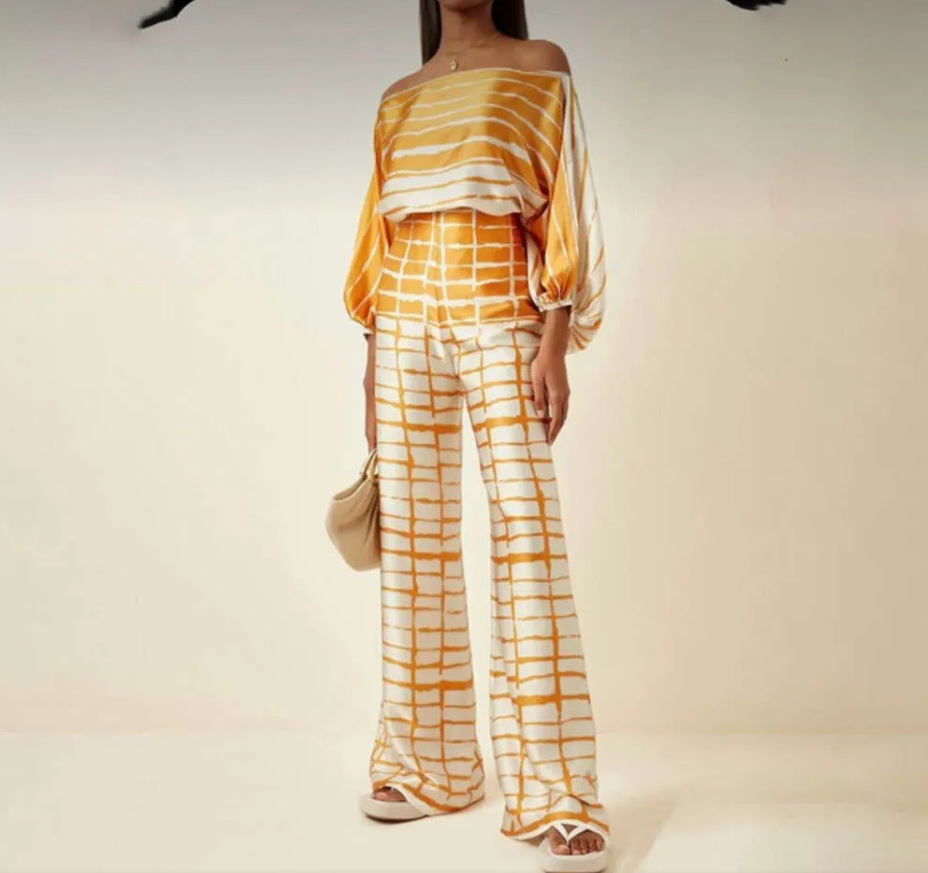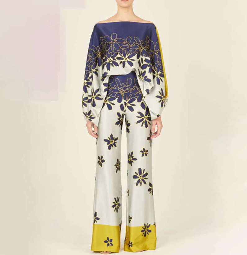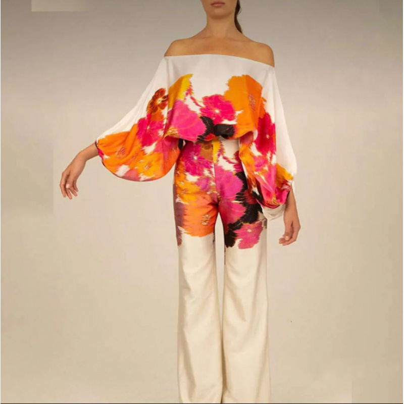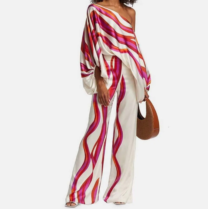 국경 간 봄과 가을 새로운 유럽과 미국 여성의 인쇄 된 둥근 목 느슨한 가슴 소매 허리 넓은 다리 바지 패션 캐주얼 세트