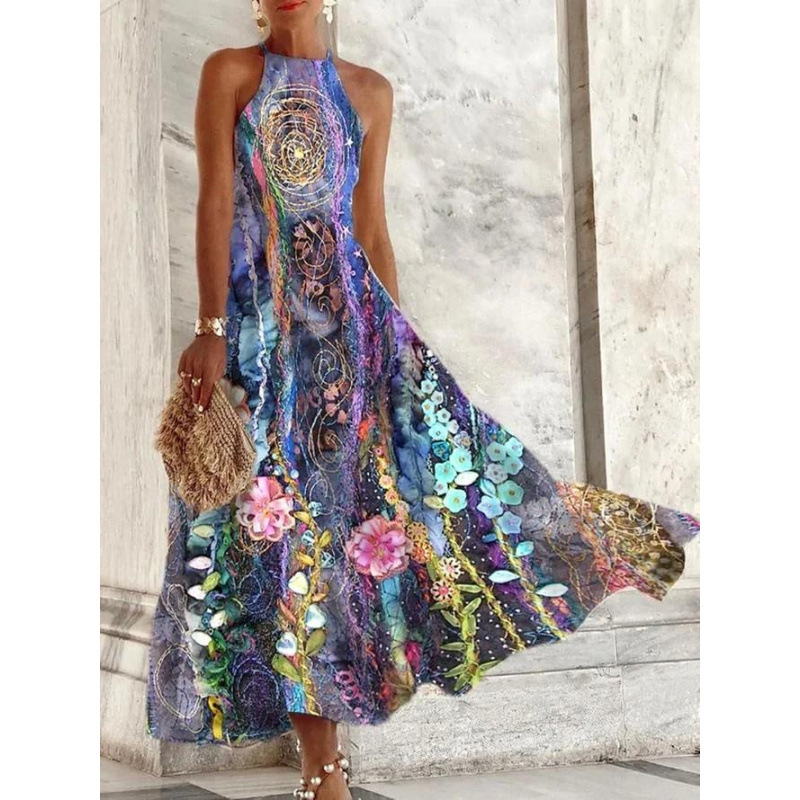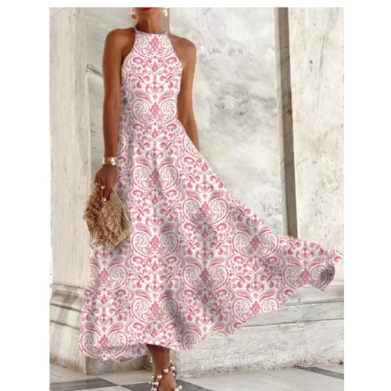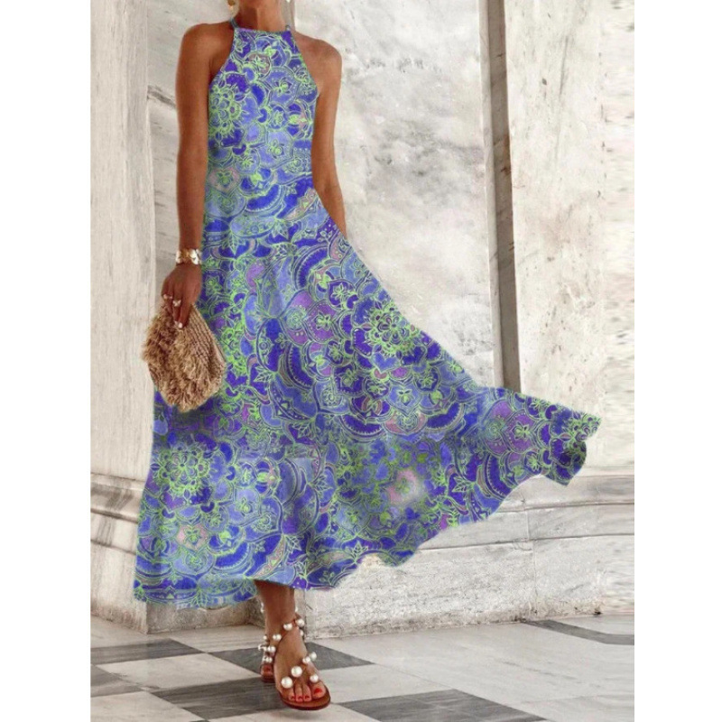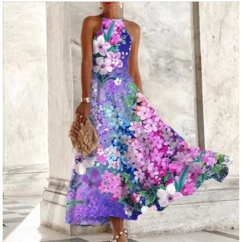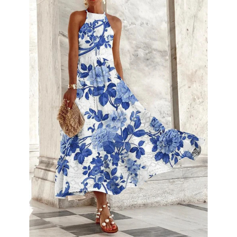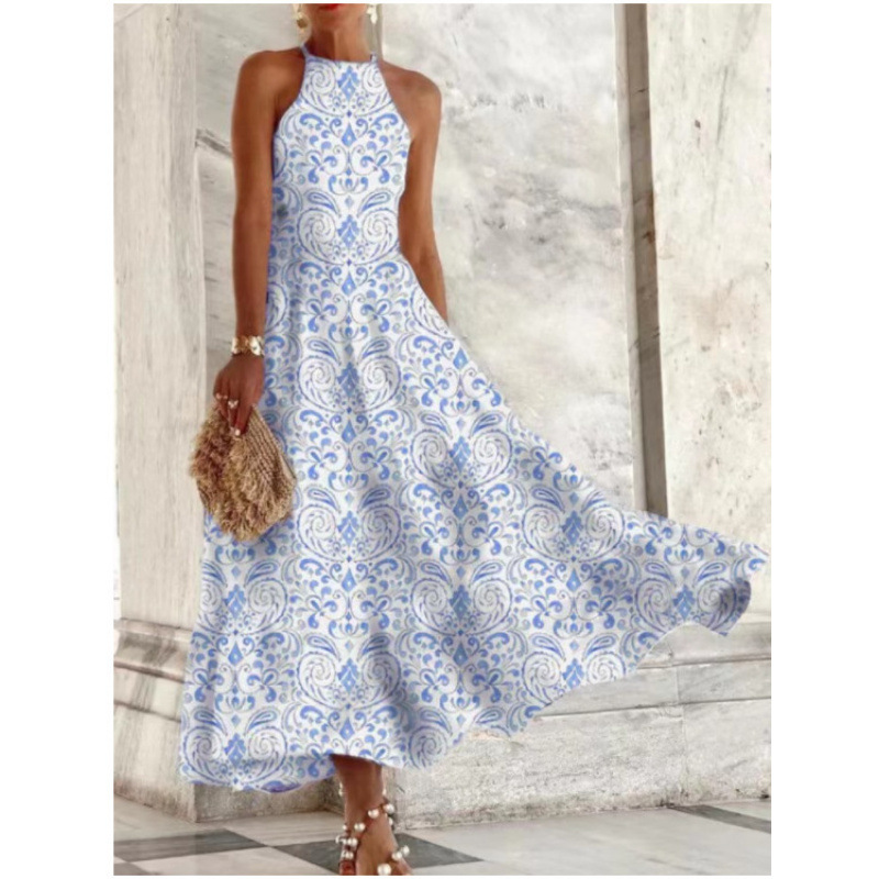 2023 국경을 넘는 아마존 독립 역 새로운 민소매 여성 원피스 파란색과 흰색 도자기 색상 긴 편안한 원피스스토어 가기