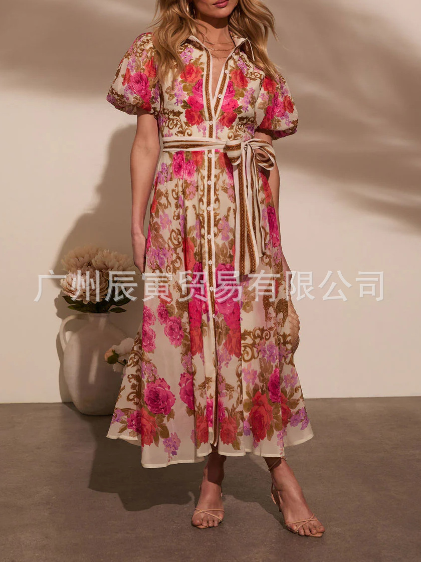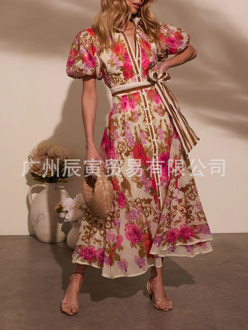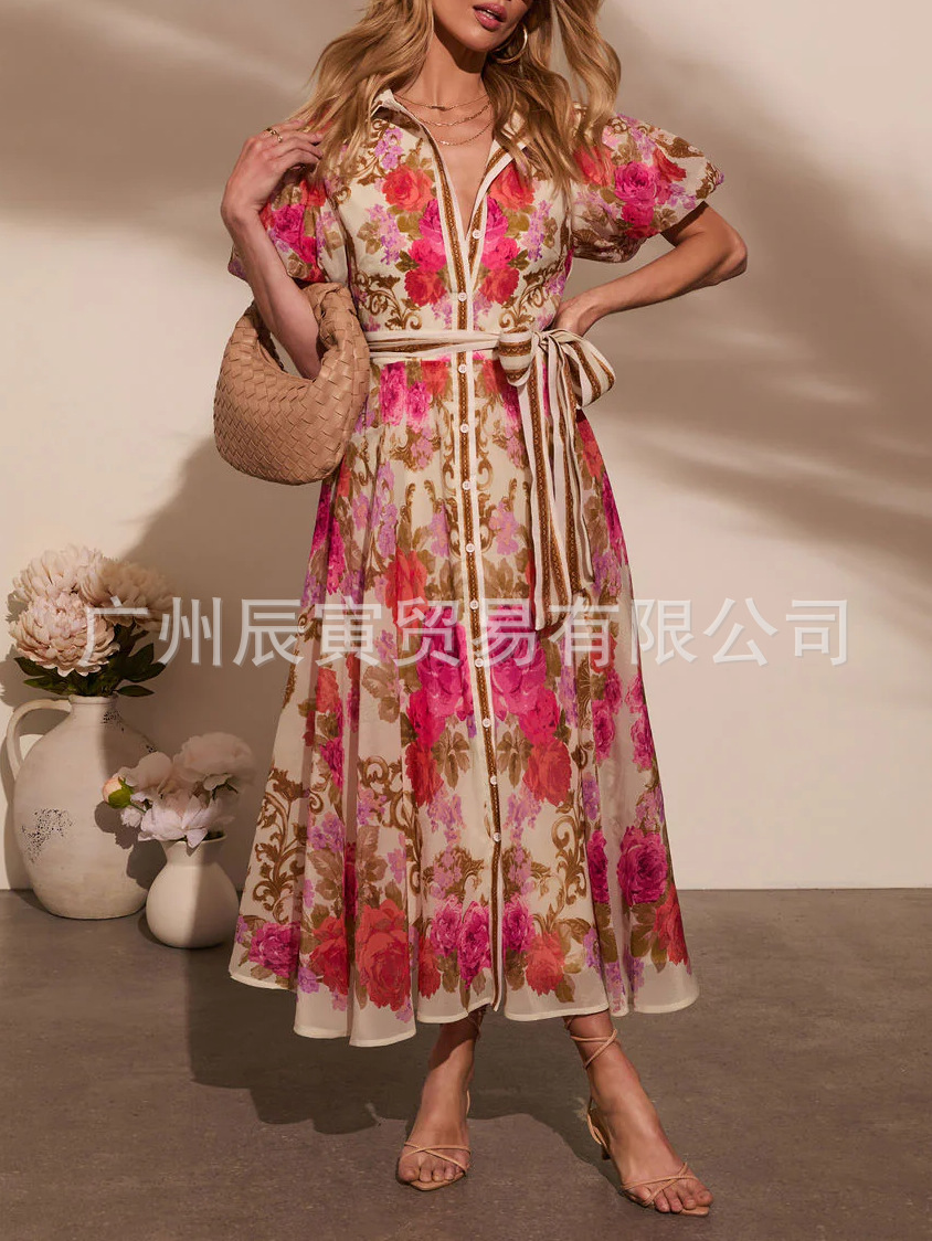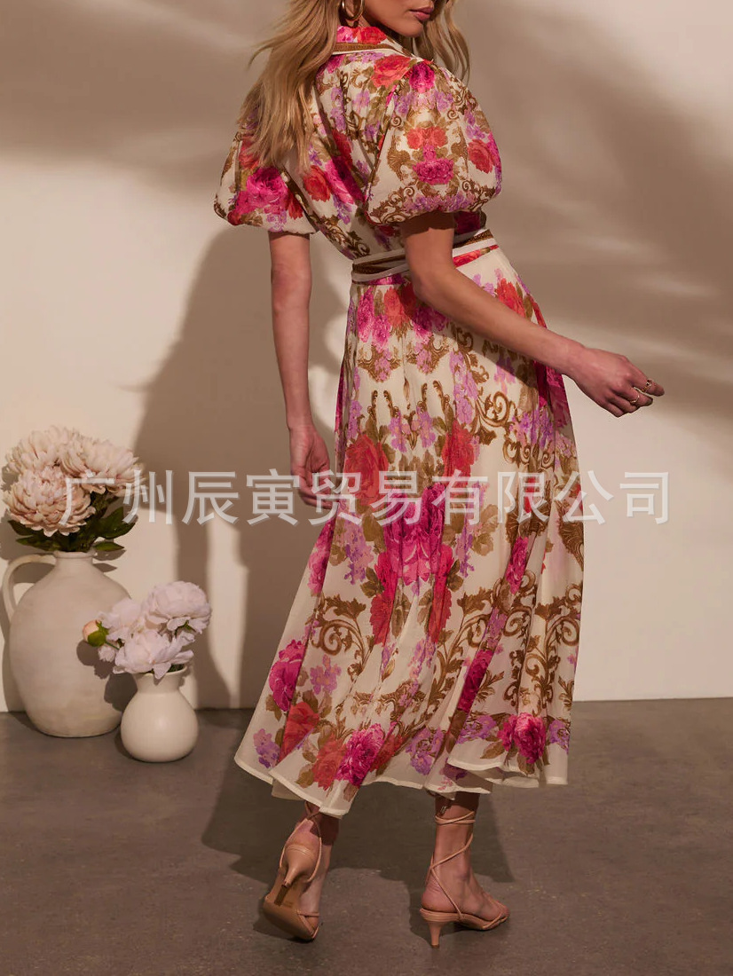 Ins 새로운 유럽과 미국 여성의 여름 원피스 우아한 프랑스 스타일 새틴 로즈 프린트 버클 롱 원피스