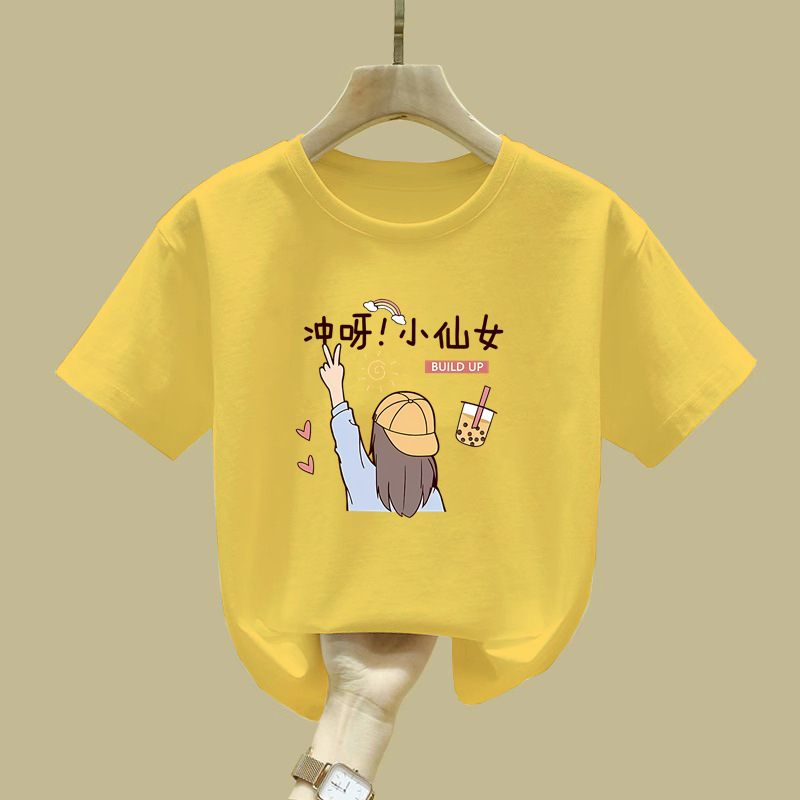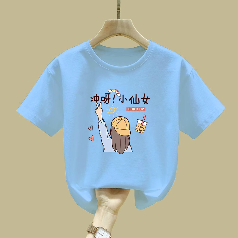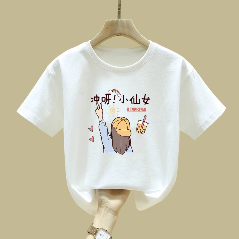 2081 #100 면 어린이 반팔 티셔츠 소녀 2025 년 여름 새로운 바닥 셔츠 큰 어린이 서양식 조수스토어 가기