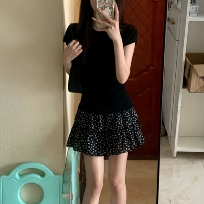 碎花复古甜美半身裙蛋糕2024夏季高腰小个子显瘦黑色蓬蓬短裙