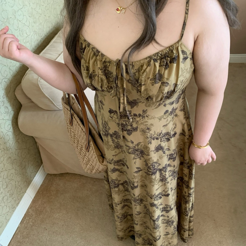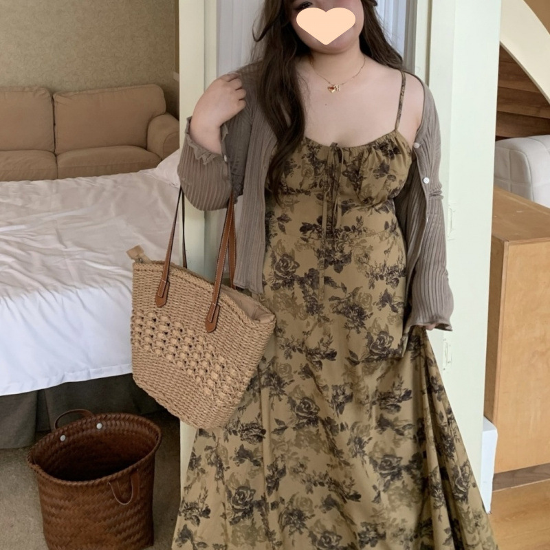 플러스 사이즈 여성의 뚱뚱한 가을 새로운 프랑스 스타일 빈티지 타이트 허리 배꼽이 슬리밍 슬링 꽃 원피스 원피스스토어 가기