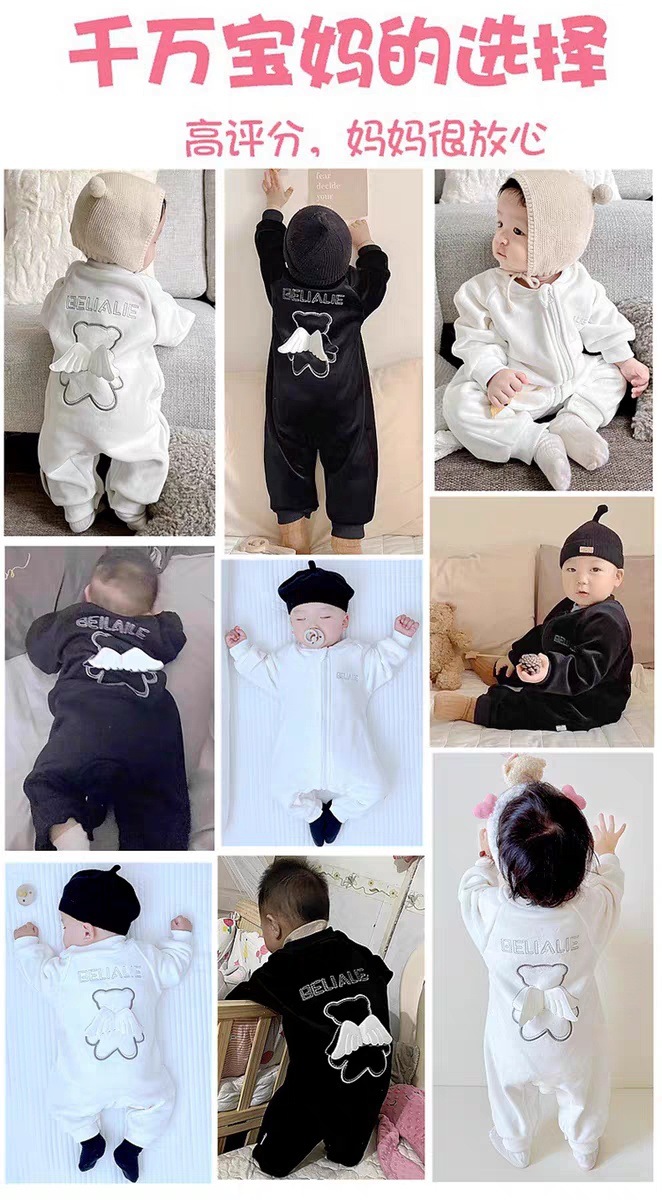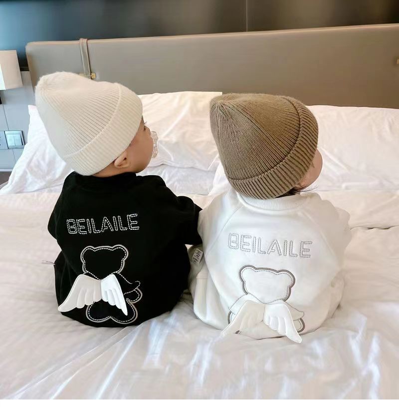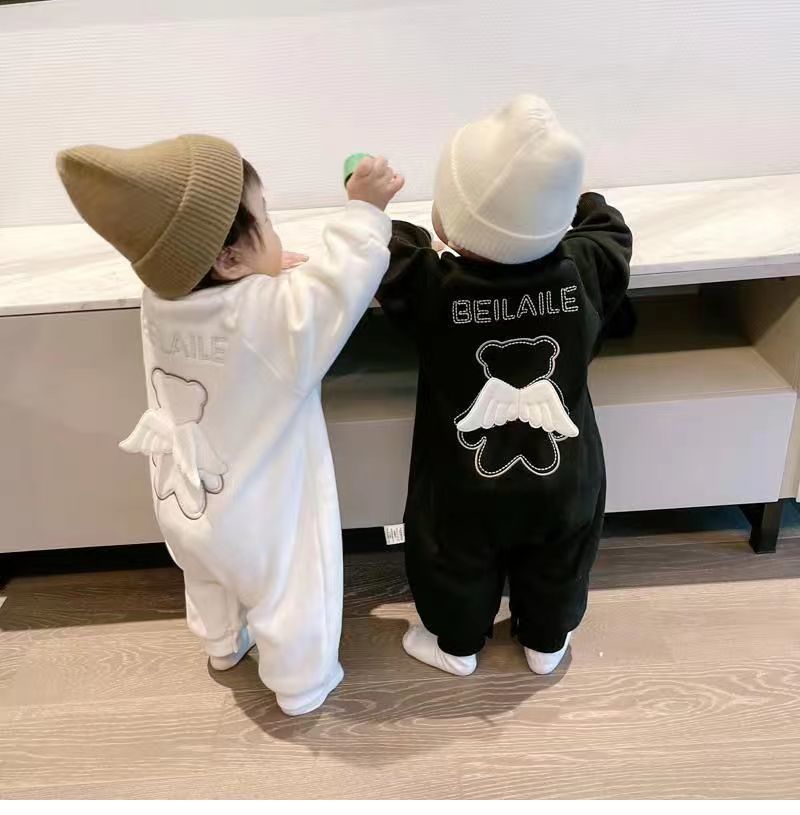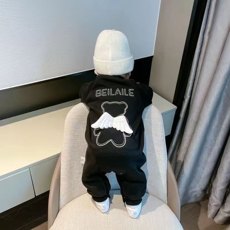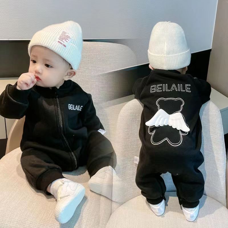 • 검은 입체 날개 천사 곰 자수 긴 소매 점프 슈트 봄, 가을