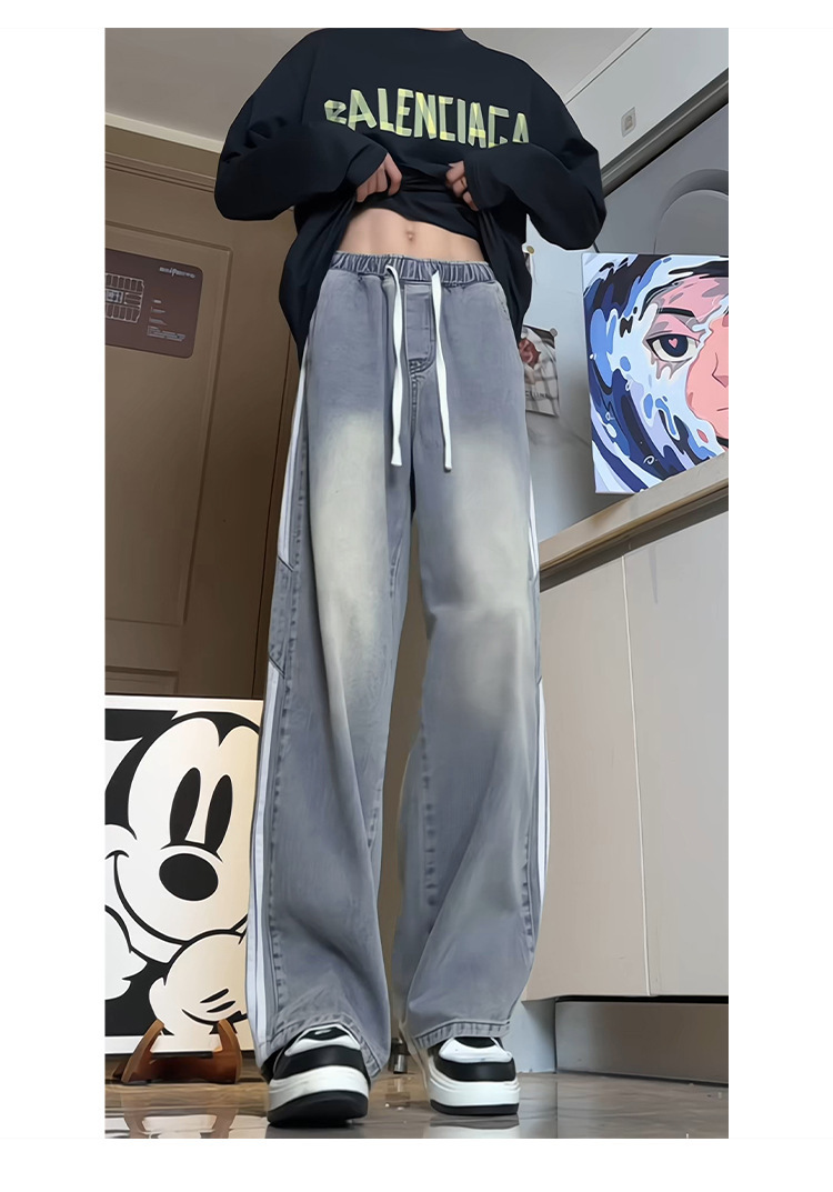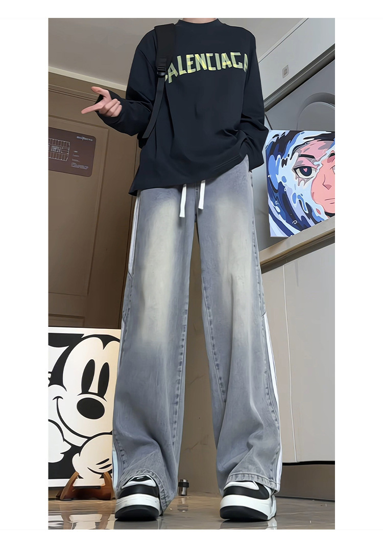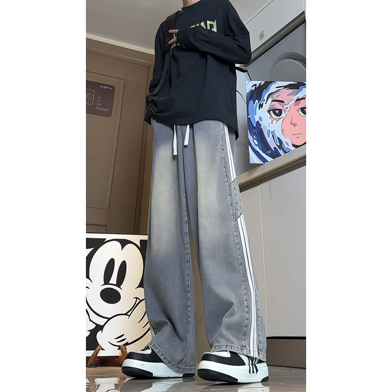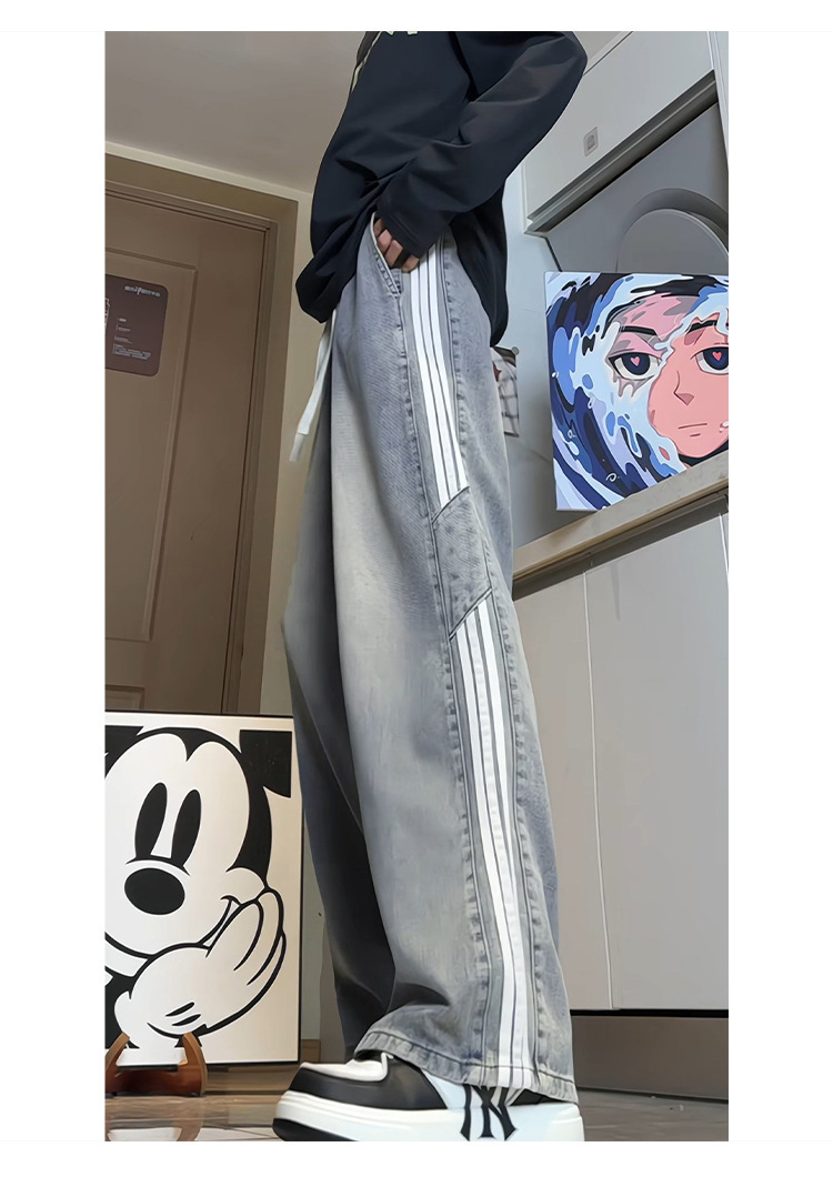 미국식 3 바 스트라이프 청바지 남성용 틈새 디자인 감각 하이 스트리트 분위기 바지 스트레이트 느슨한 와이드 레그 팬츠 패션스토어 가기