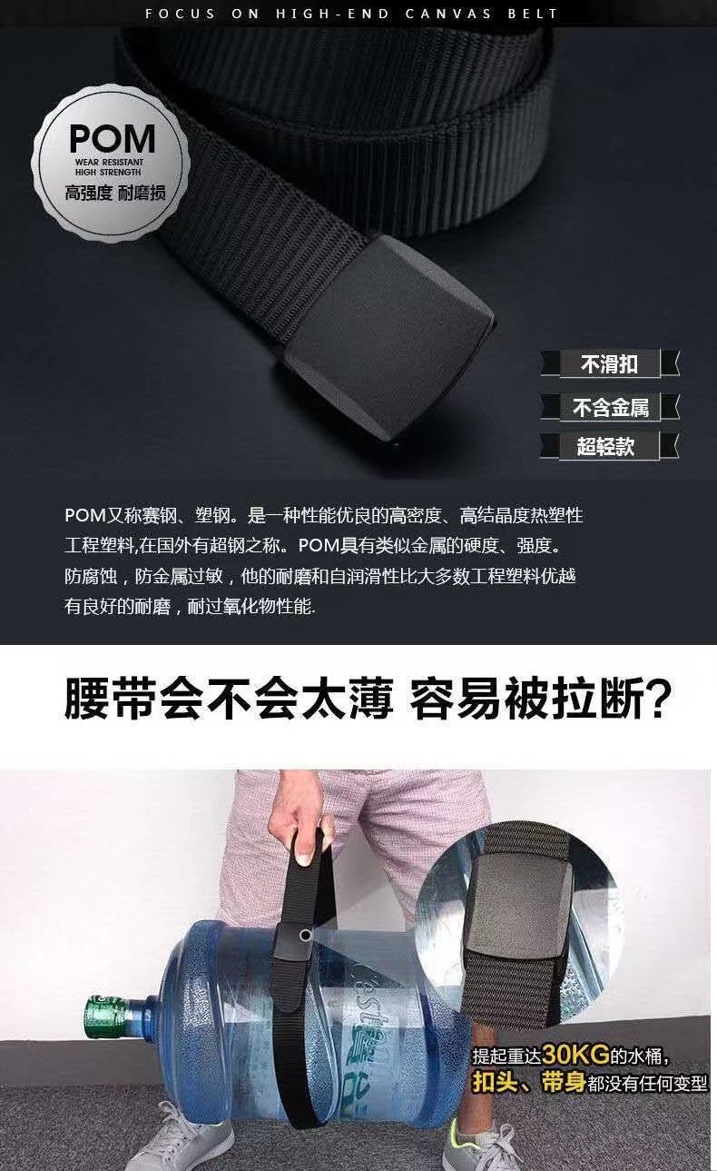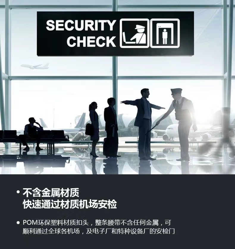 防过敏,可以过安检门!可以用到220斤左右,扣头材质POM(俗称钢扣),是一种韧性接近钢材的塑料!扣头可承受30KG的拉力,脚踩不坏,汽车压不碎!带身材质:轻薄尼龙材质,高强度,耐磨!不含任何金属 轻量化无负担 快速通过机场安检