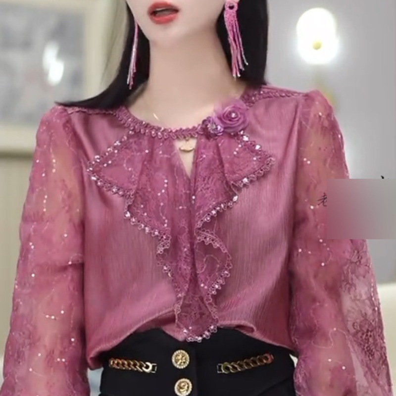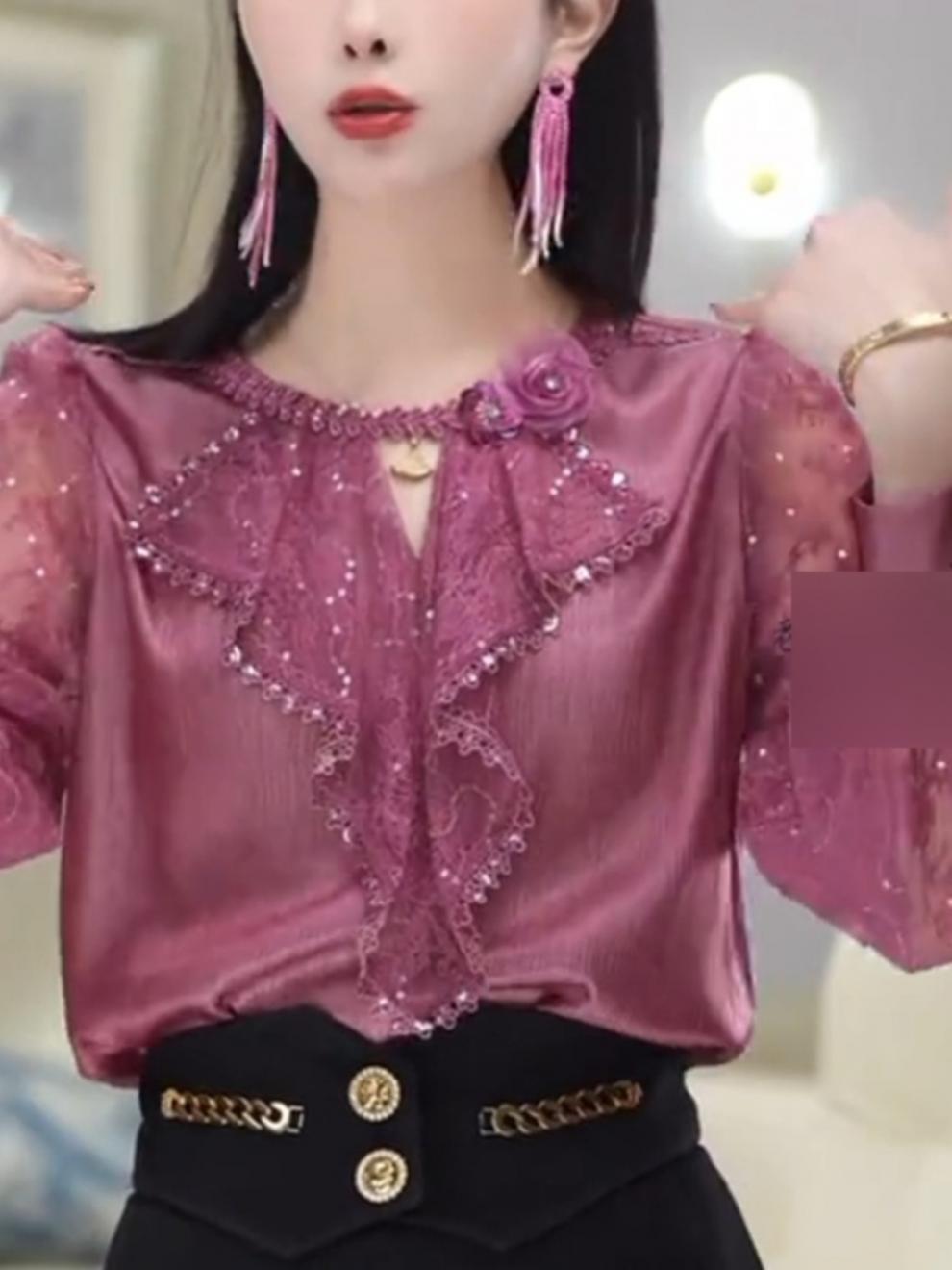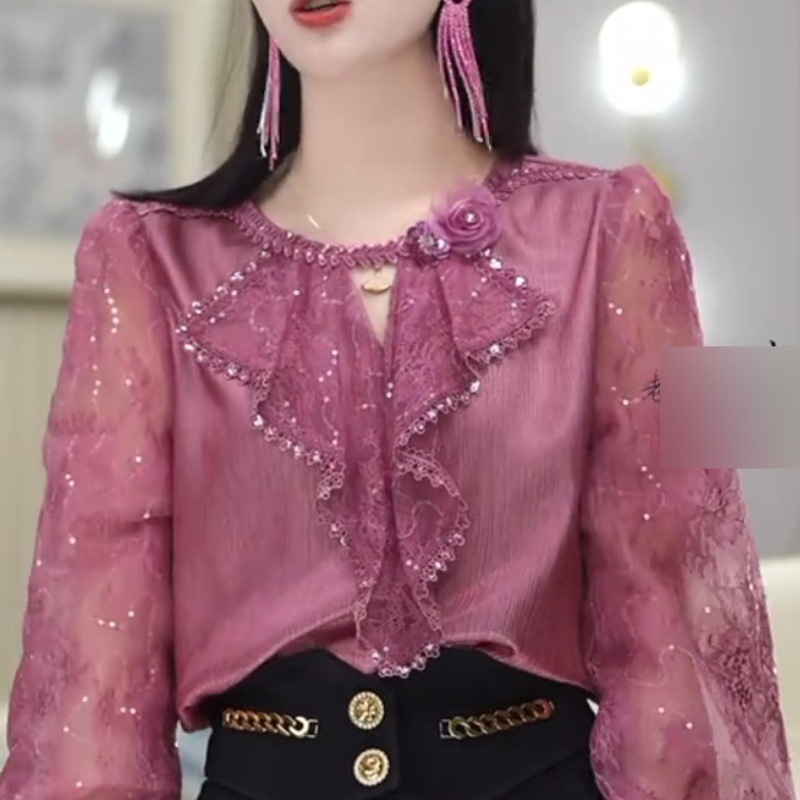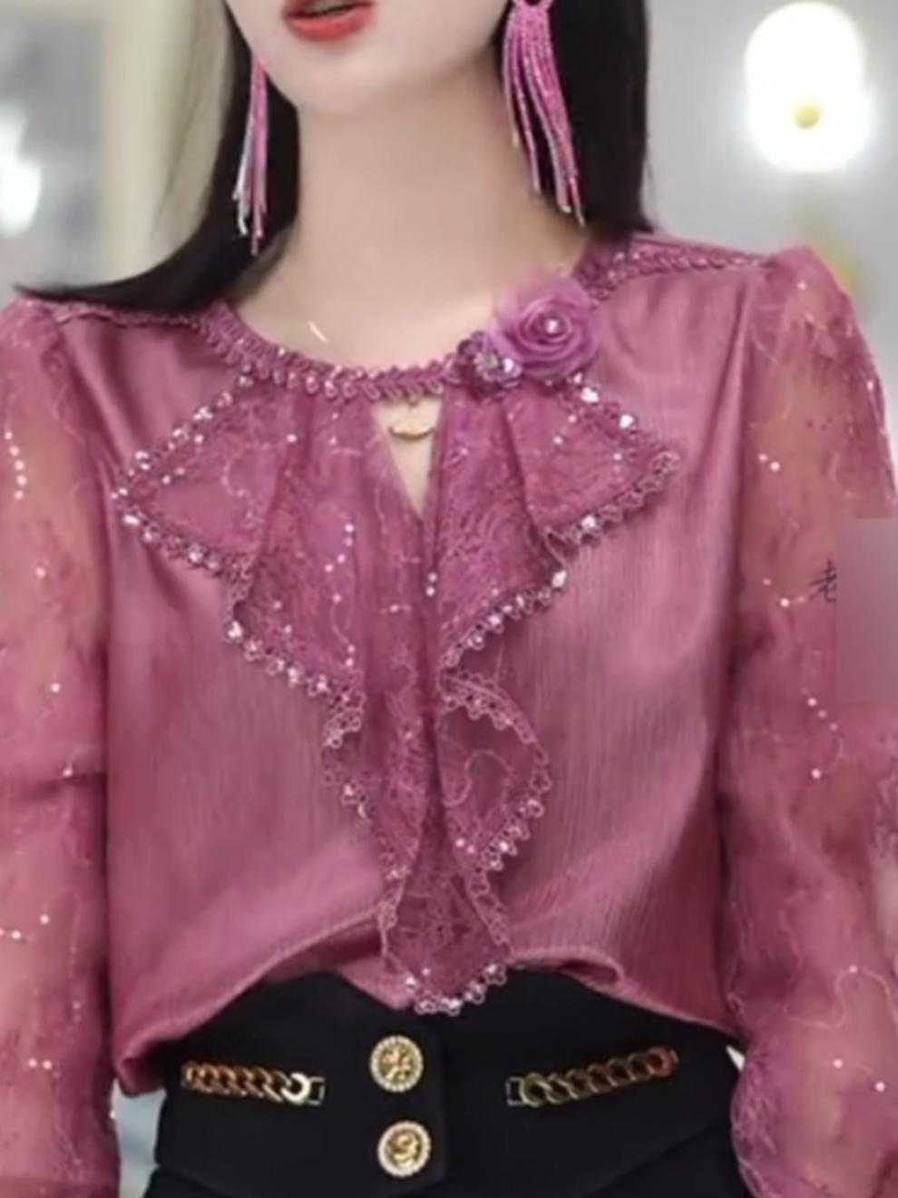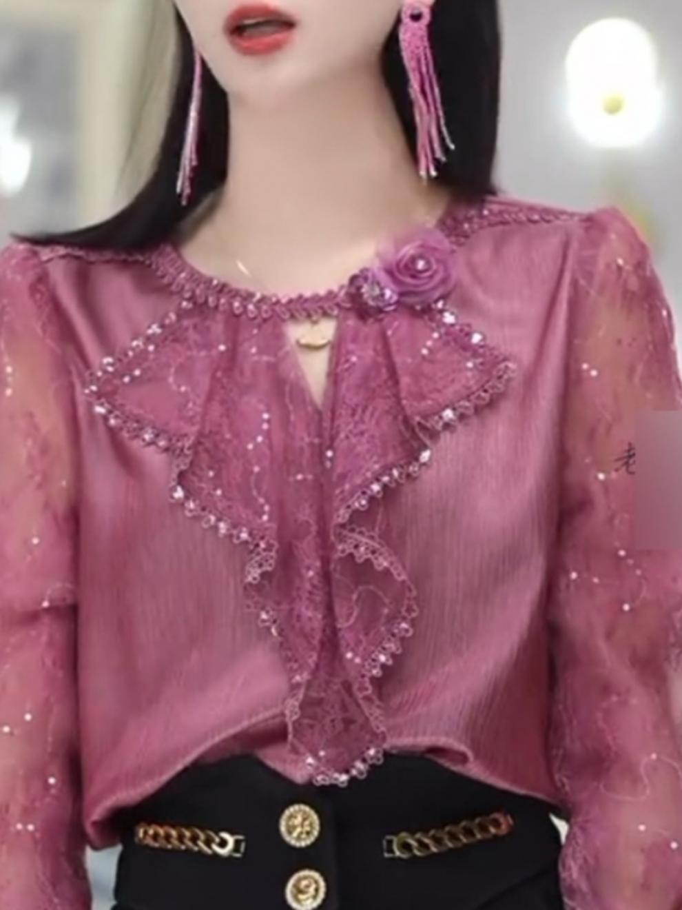 가을 2024 새로운 둥근 목 부드러운 긴 소매 셔츠 여성의 새로운 서양 스타일 작은 셔츠 플러스 사이즈 통통녀 느슨한 최고 여성스토어 가기