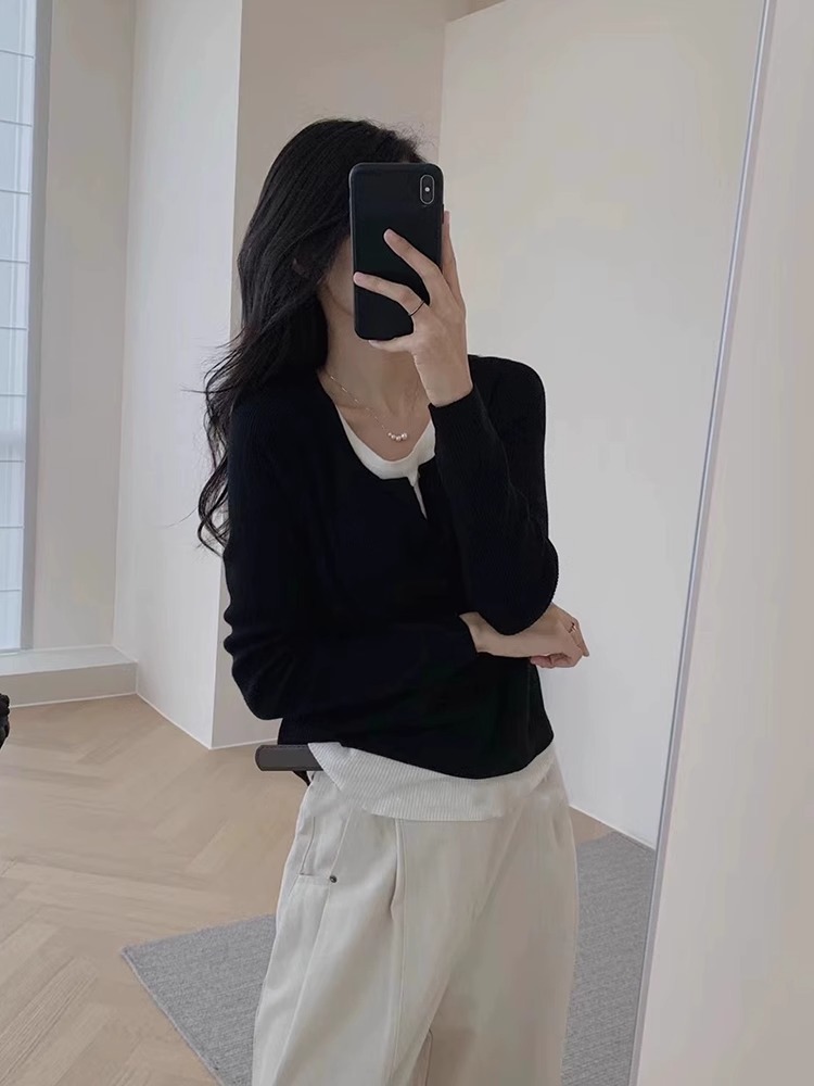 검은 가짜 투피스 어깨 긴팔 티셔츠베이스 셔츠 여성의 봄과 가을 새로운 디자인 센스 틈새 슬림 핏 이너 탑스토어 가기