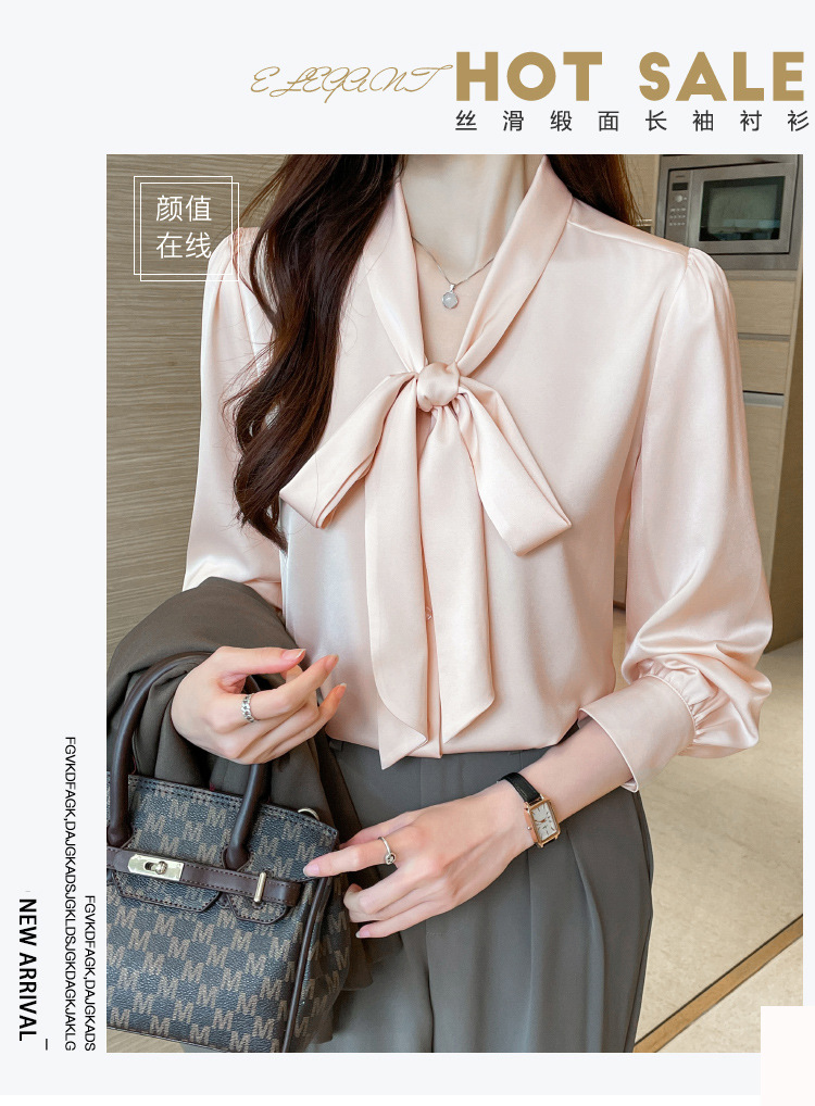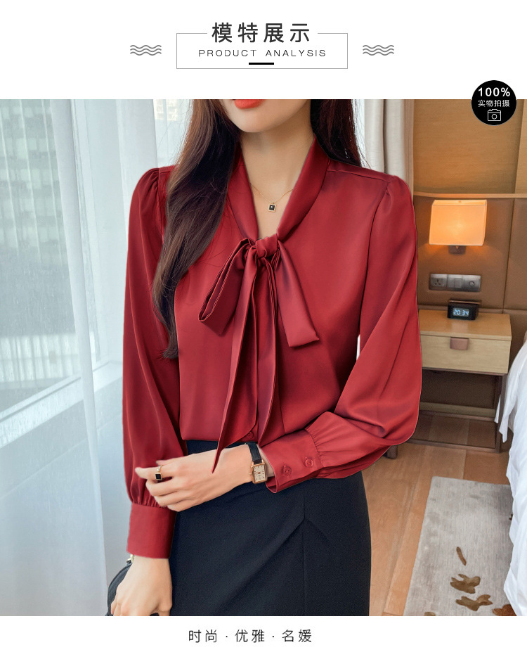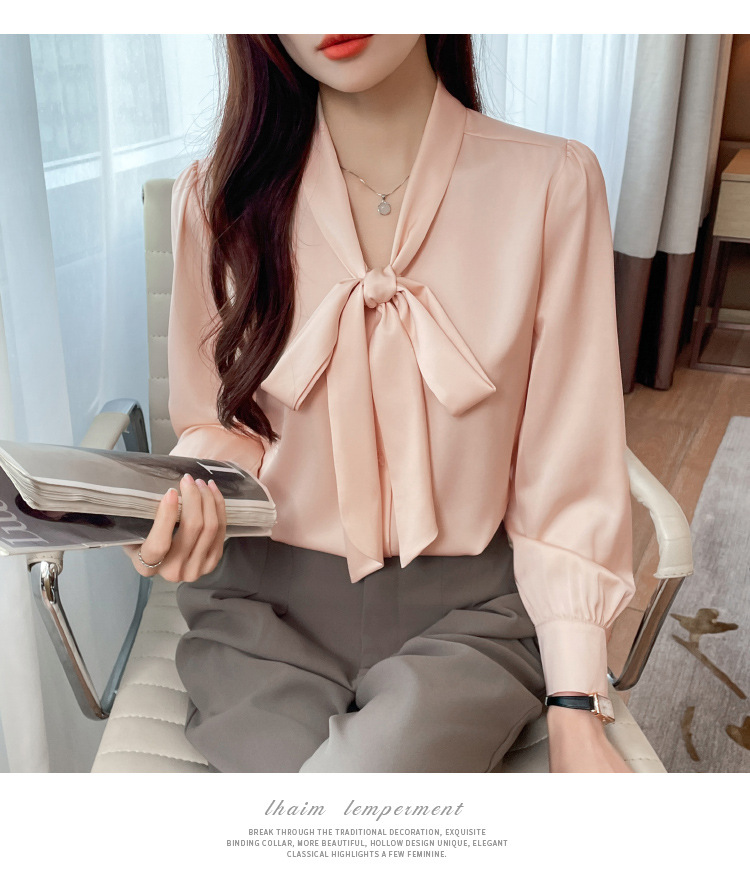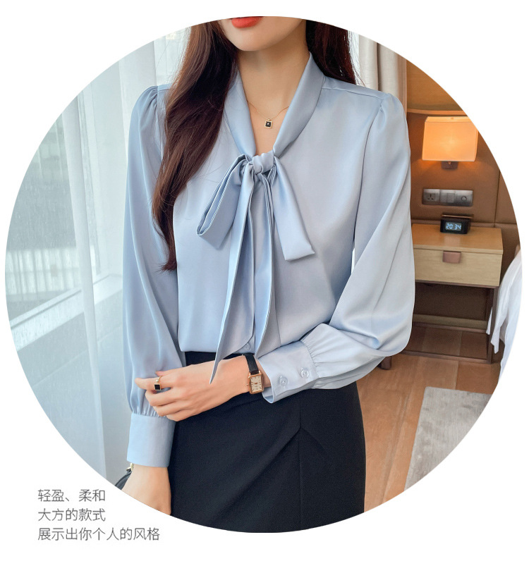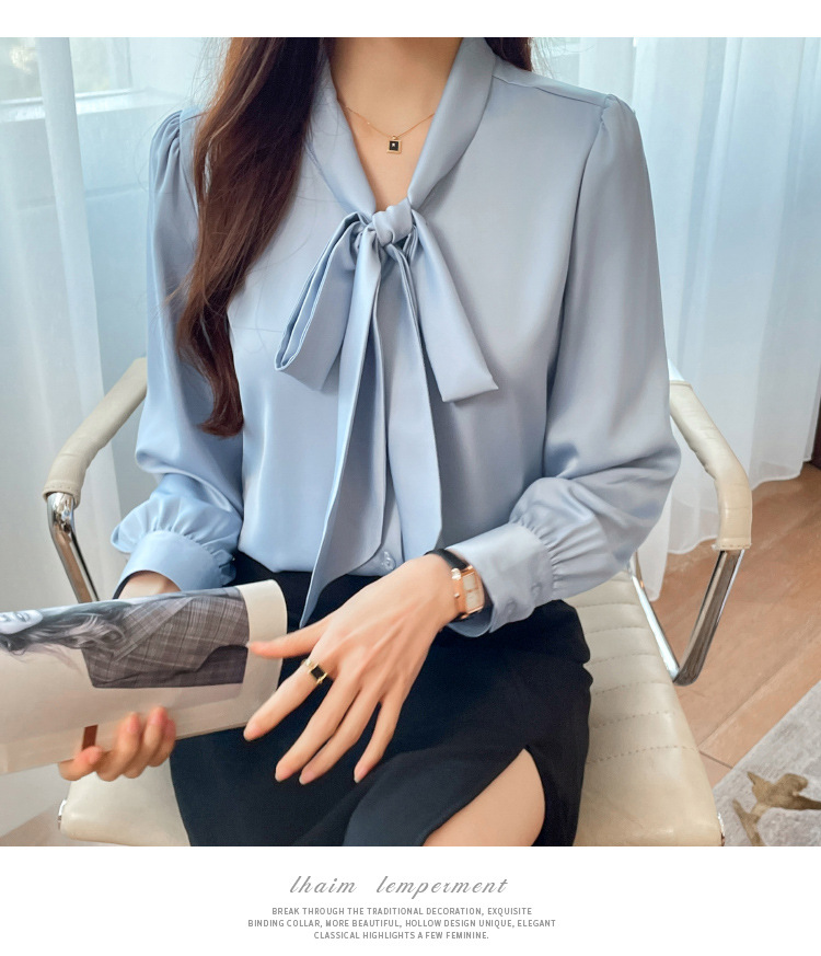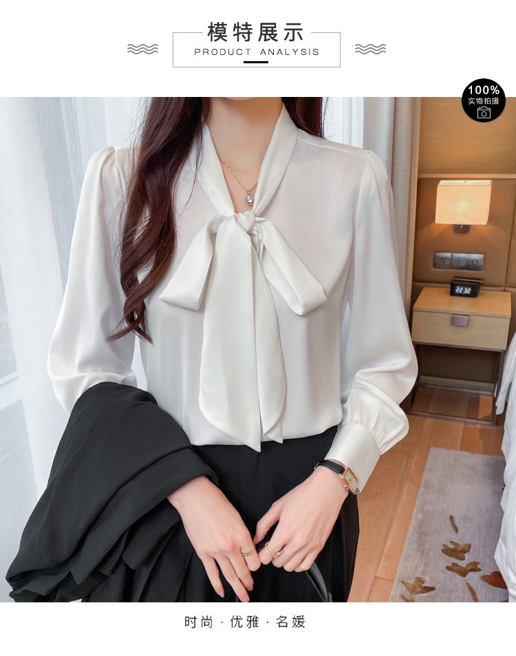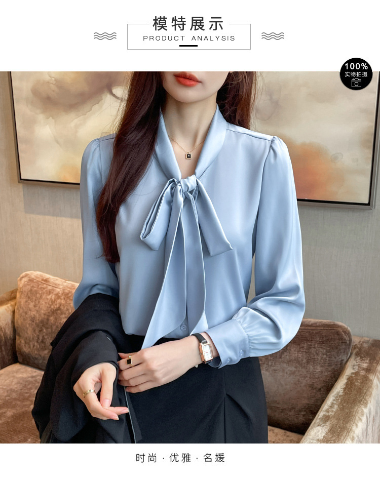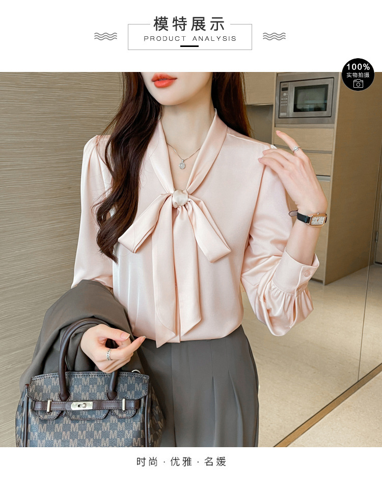 진짜 샷 활 새틴 긴 소매 셔츠 여자의 봄 통근 경력 인터뷰 셔츠 우아한 리본 탑스토어 가기