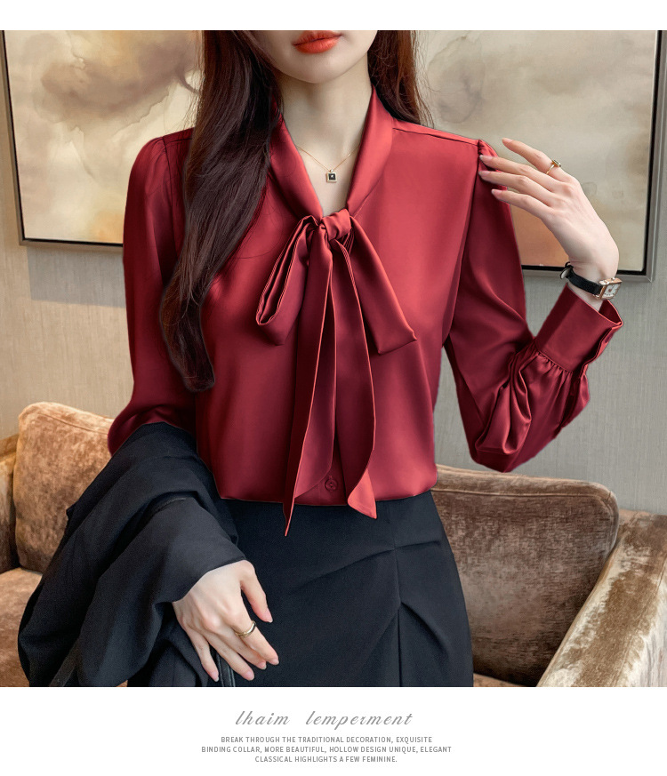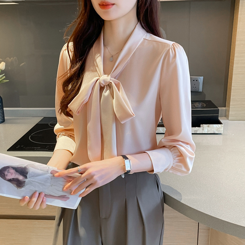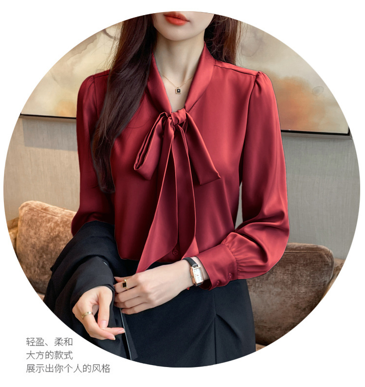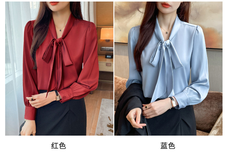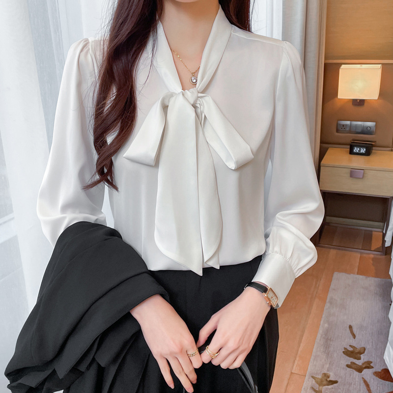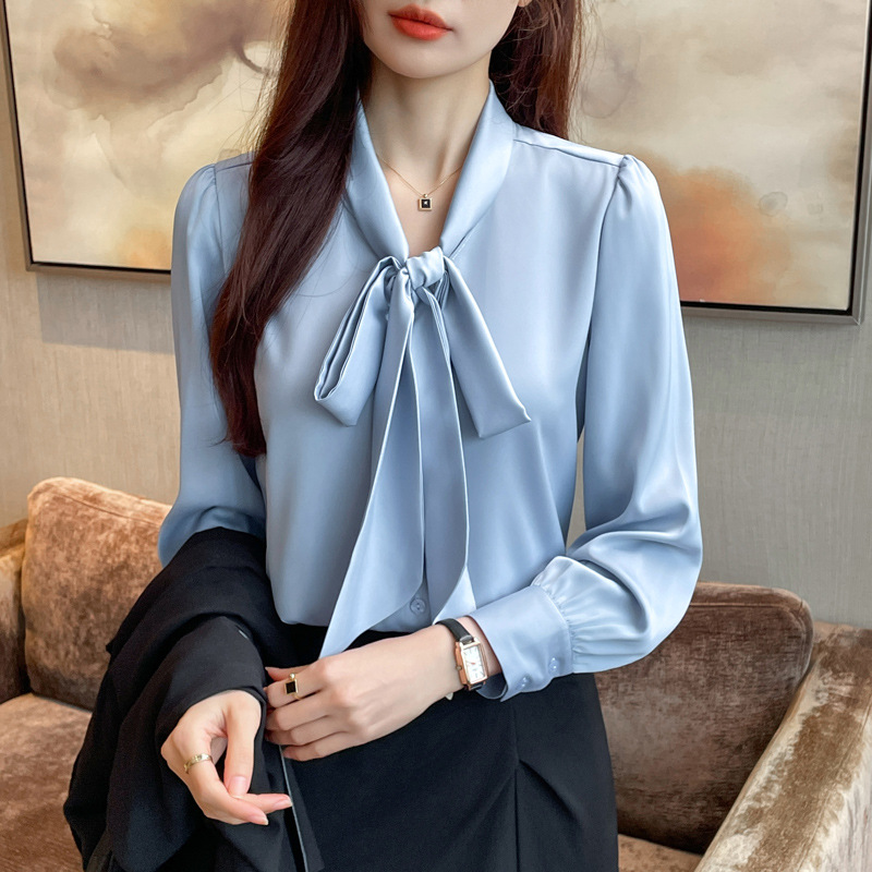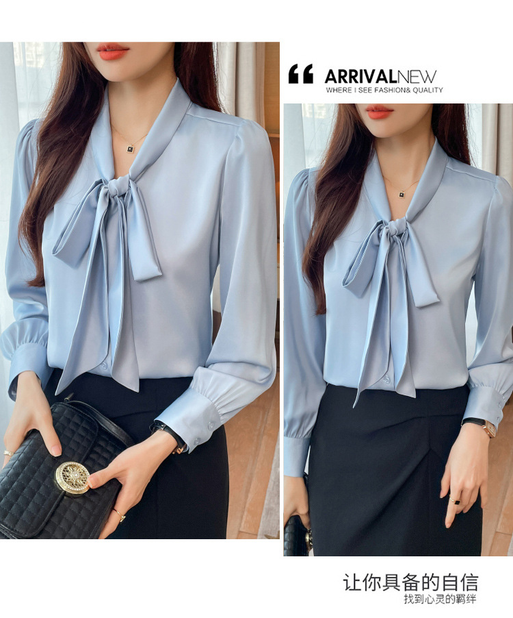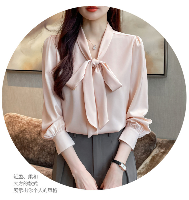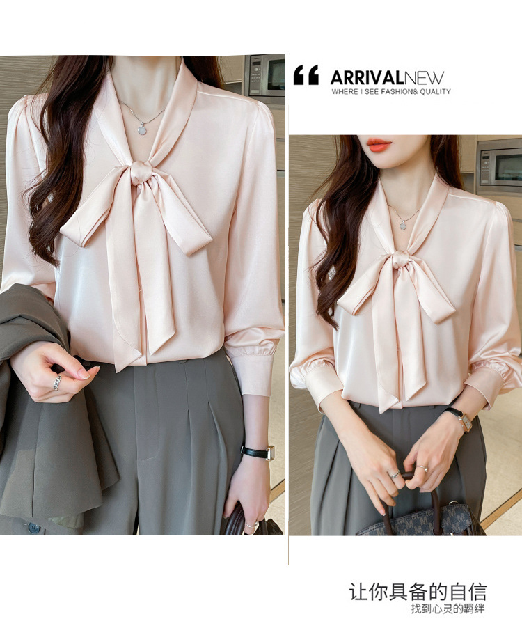 진짜 샷 활 새틴 긴 소매 셔츠 여자의 봄 통근 경력 인터뷰 셔츠 우아한 리본 탑스토어 가기