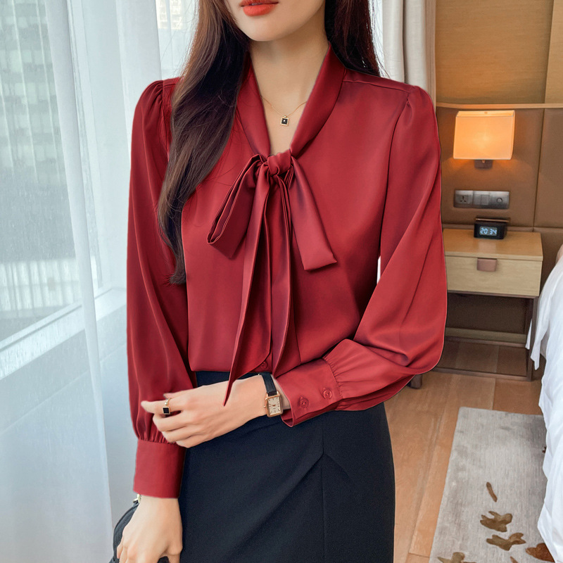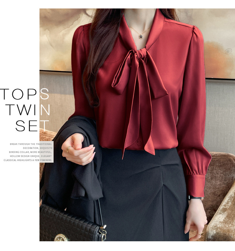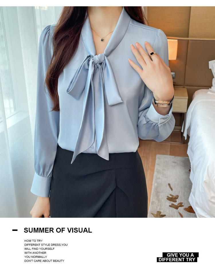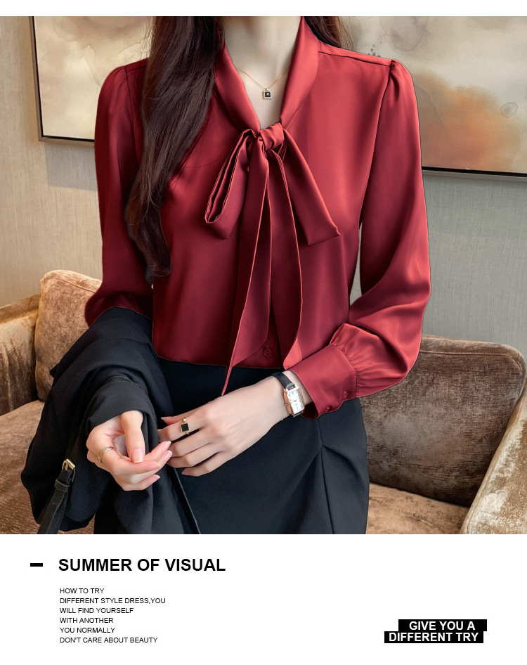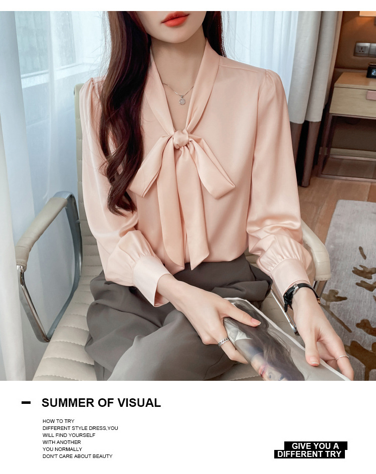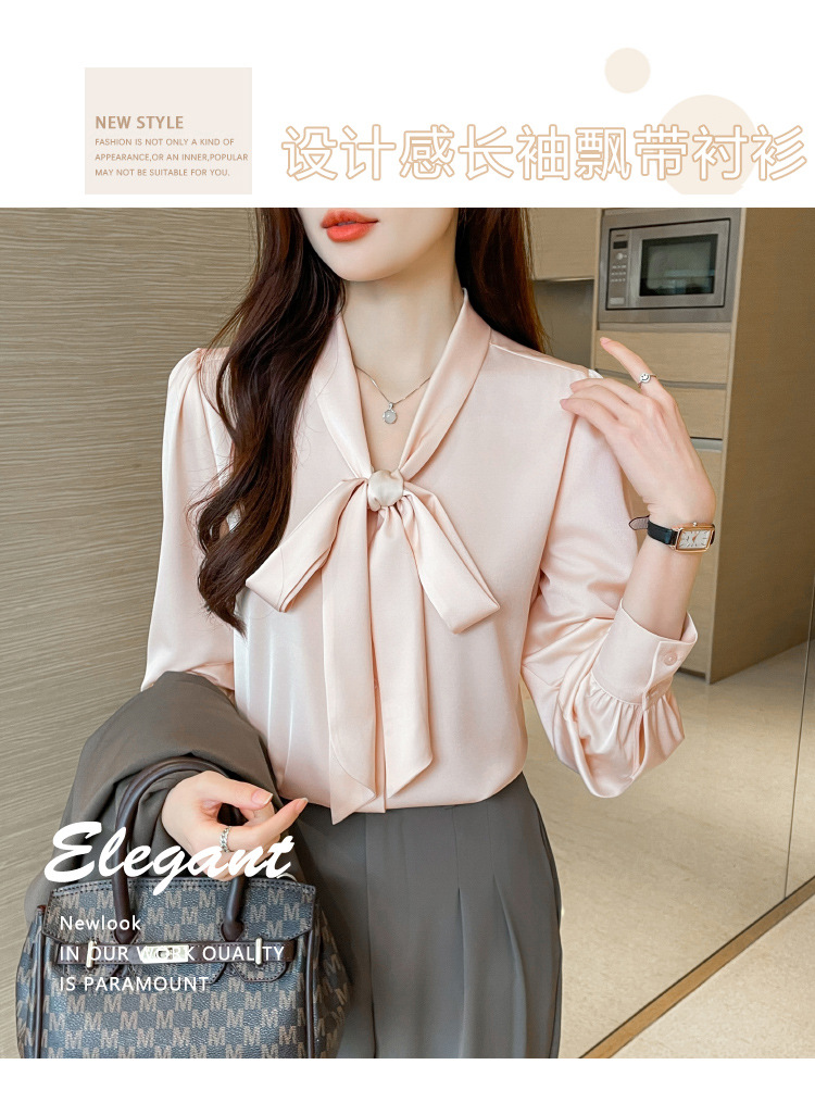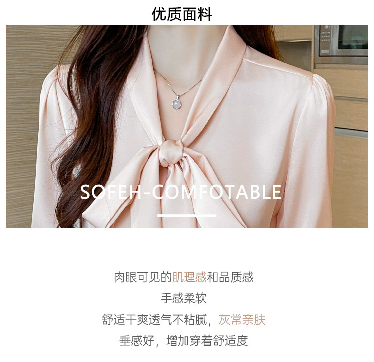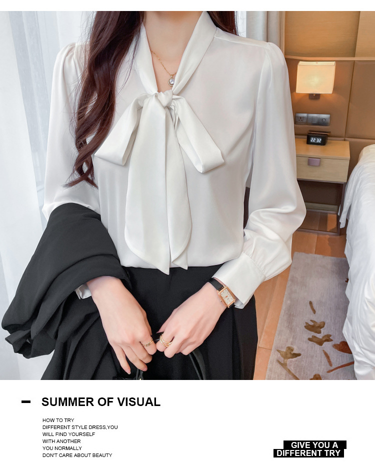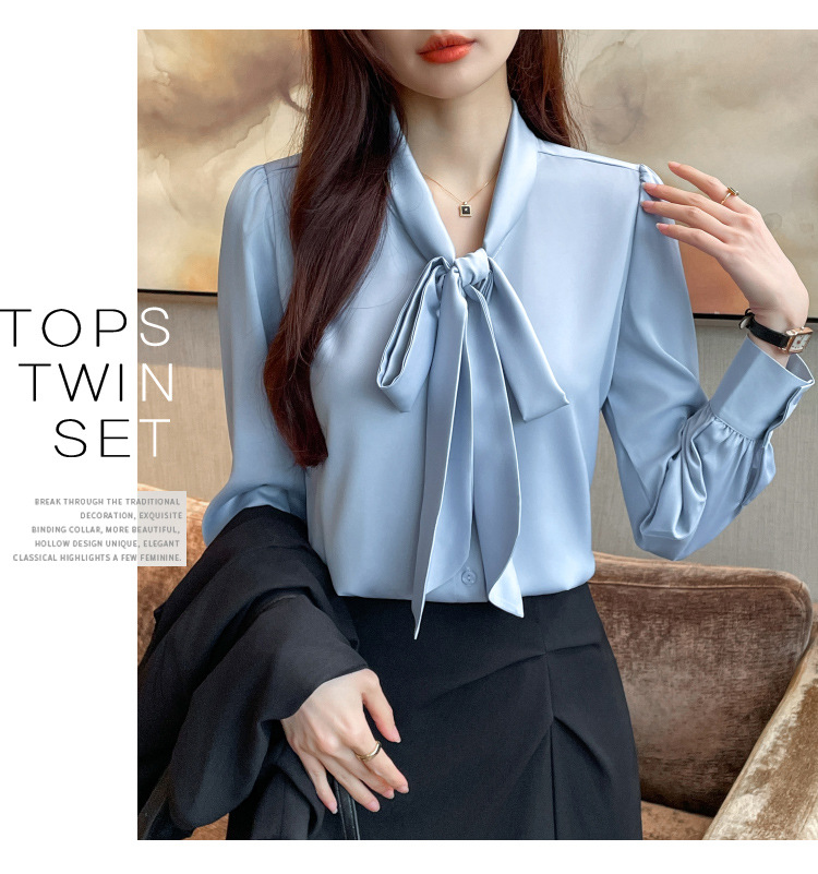 진짜 샷 활 새틴 긴 소매 셔츠 여자의 봄 통근 경력 인터뷰 셔츠 우아한 리본 탑스토어 가기