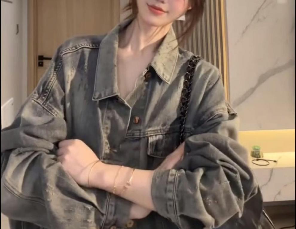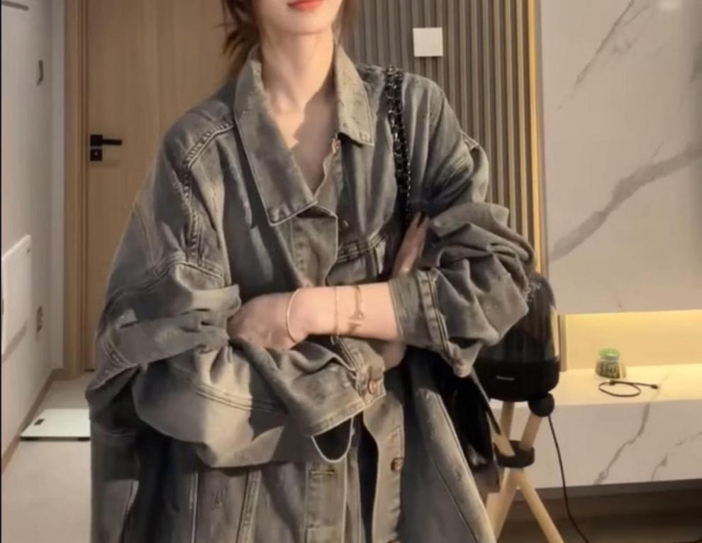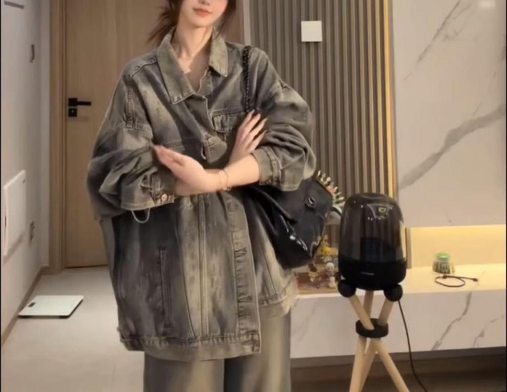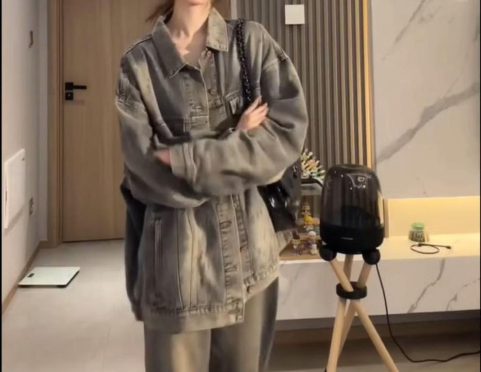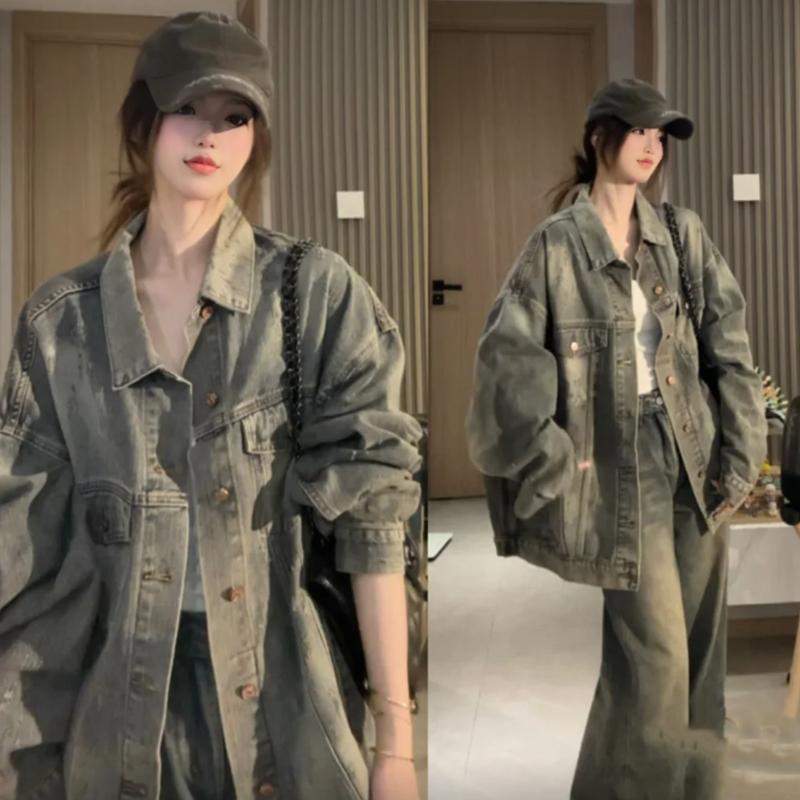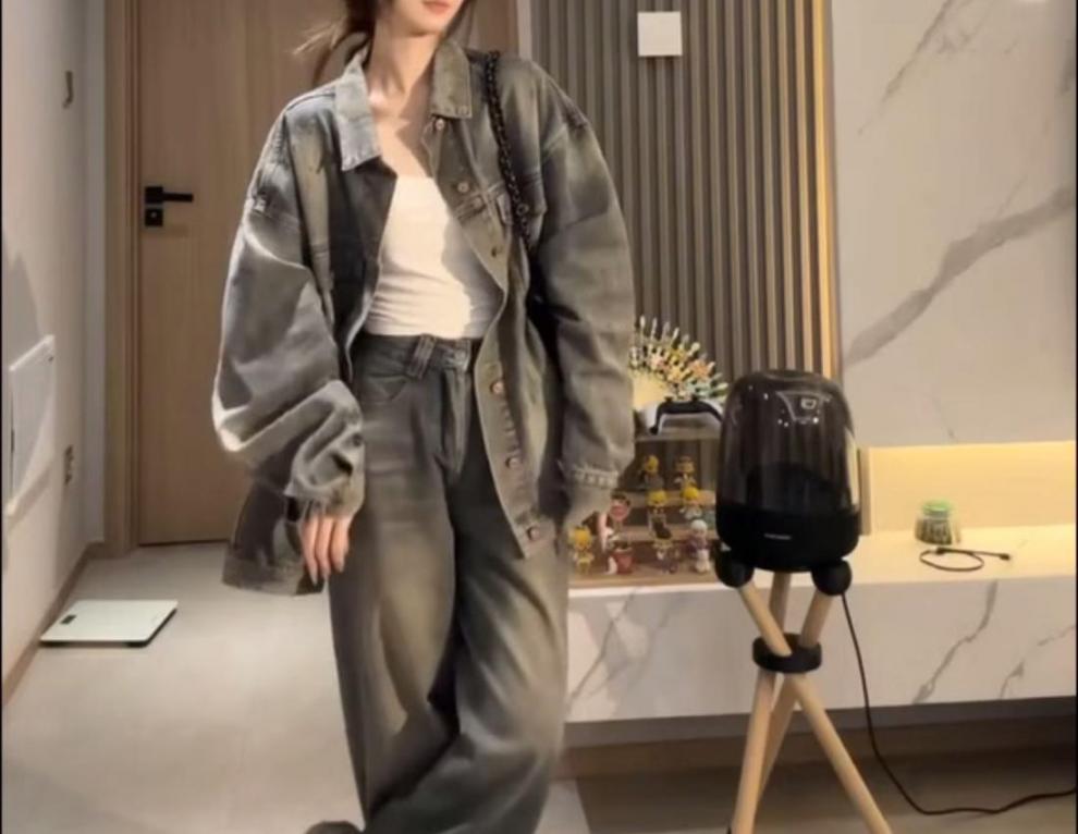 플러스 사이즈 통통녀 가을 착용 세트 데님 재킷 유행 느슨한 게으른 스타일 넓은 다리 바지 두 조각 세트스토어 가기