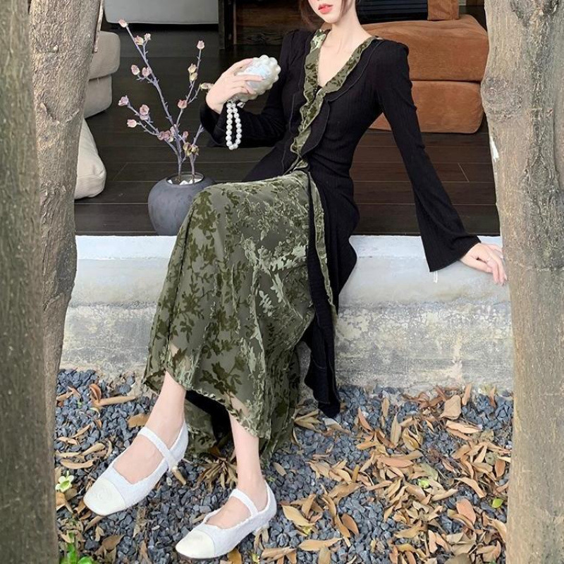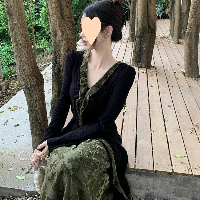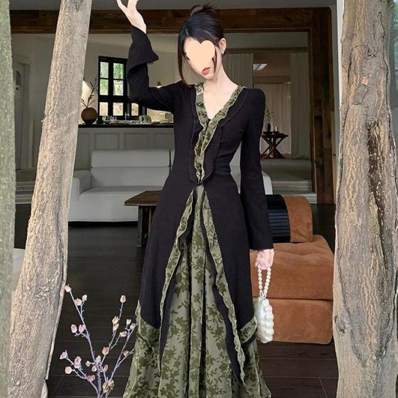 플러스 사이즈 통통한 새로운 중국식 세트 목걸이 긴 소매 카디건 여성용 가을 2 종 봄 허리 스커트 세트스토어 가기