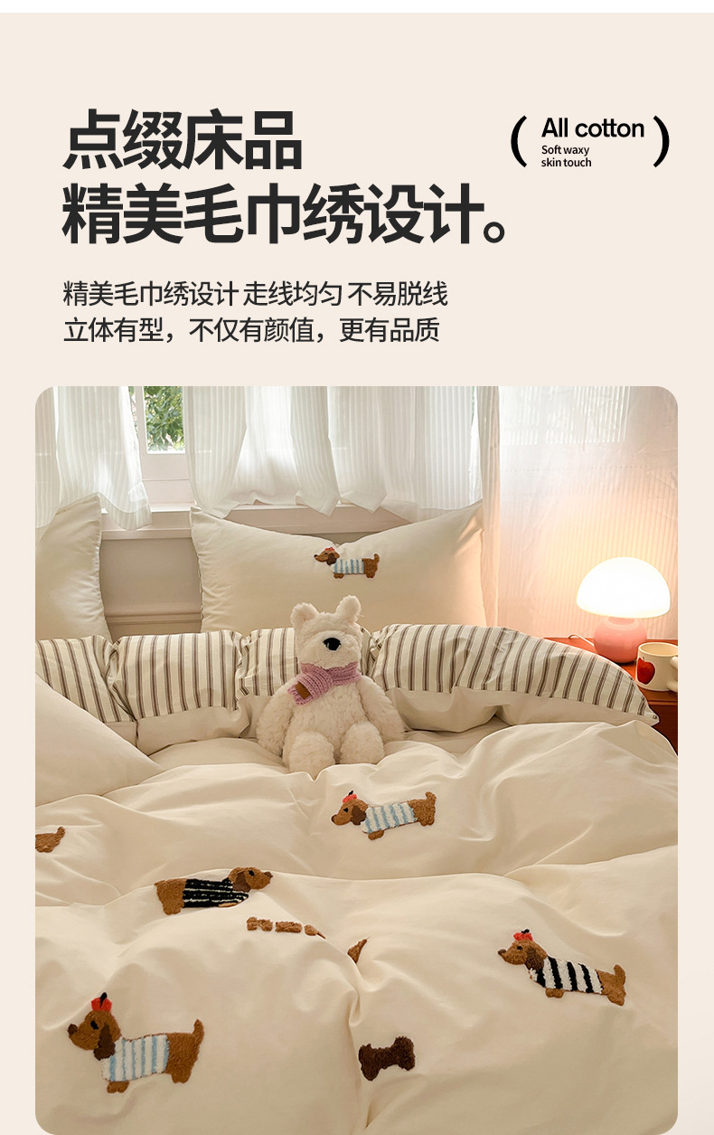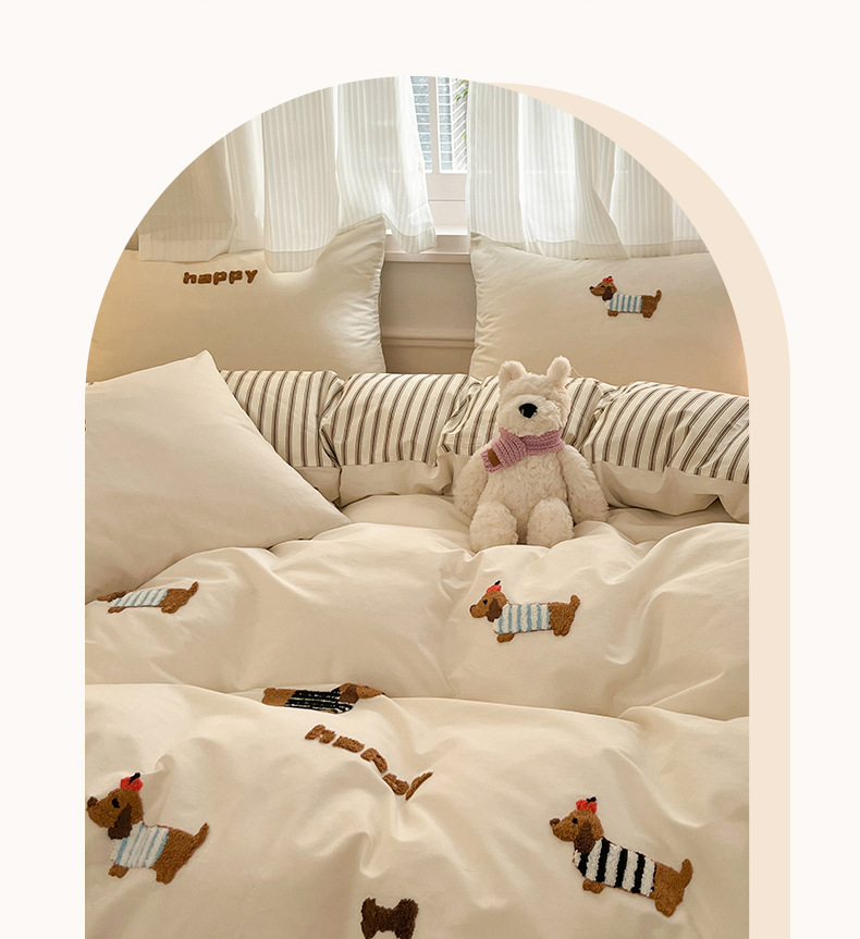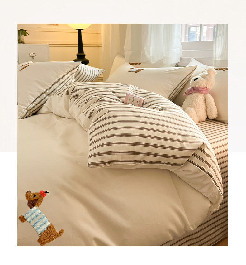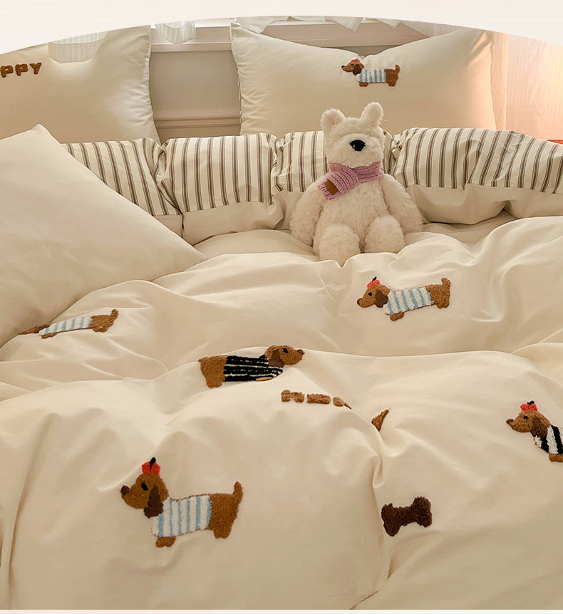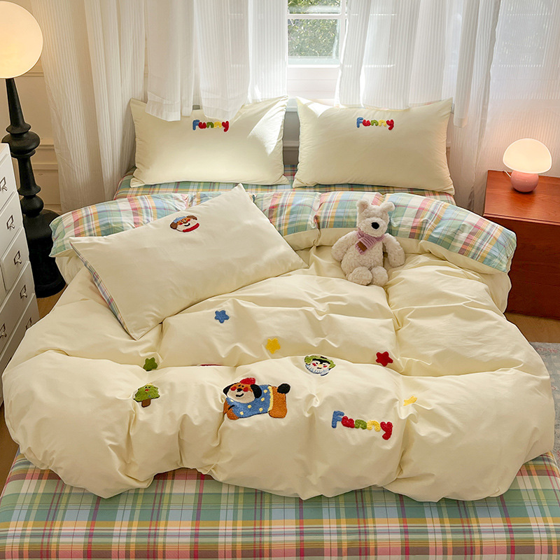 작은 신선한 면 4 조각 만화 귀여운 면 수건 자수 퀼트 침대 시트 기숙사 3 피스 침구