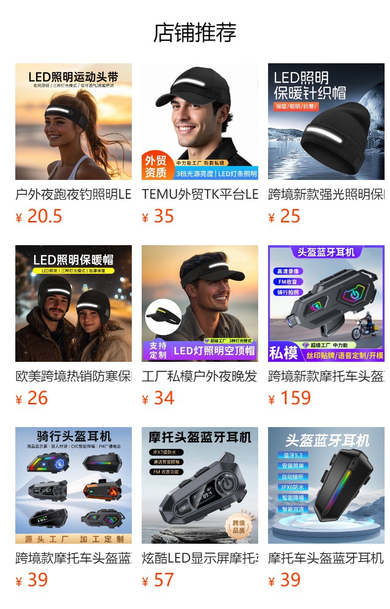 대외 무역 TEMU, TK 플랫폼 LED 라이트 바 빛나는 모자 야외 밤 강한 조명 태양 램프 캡스토어 가기
