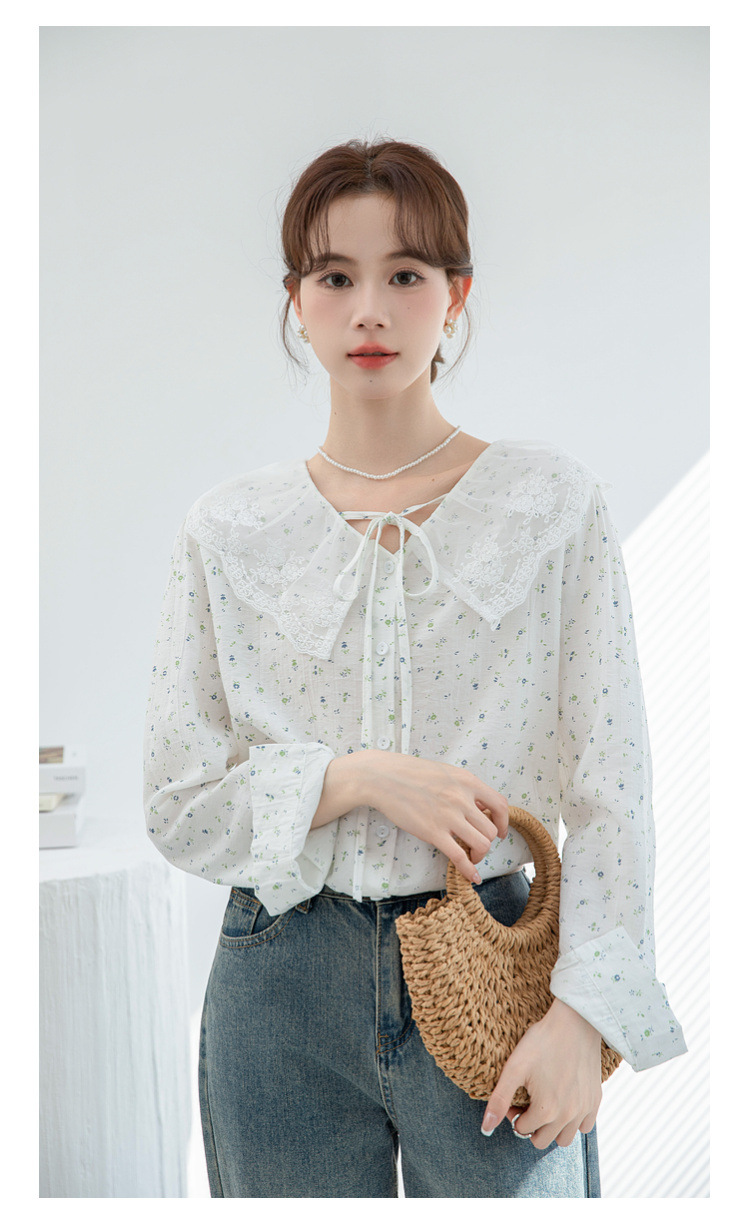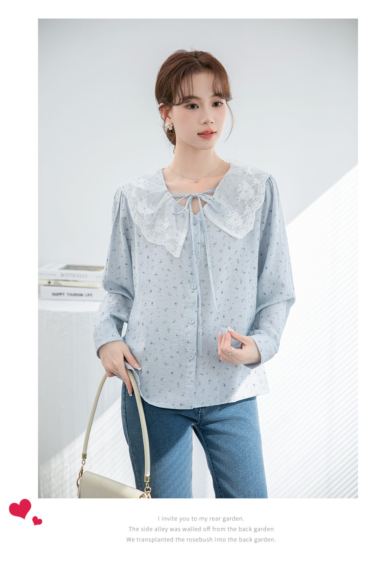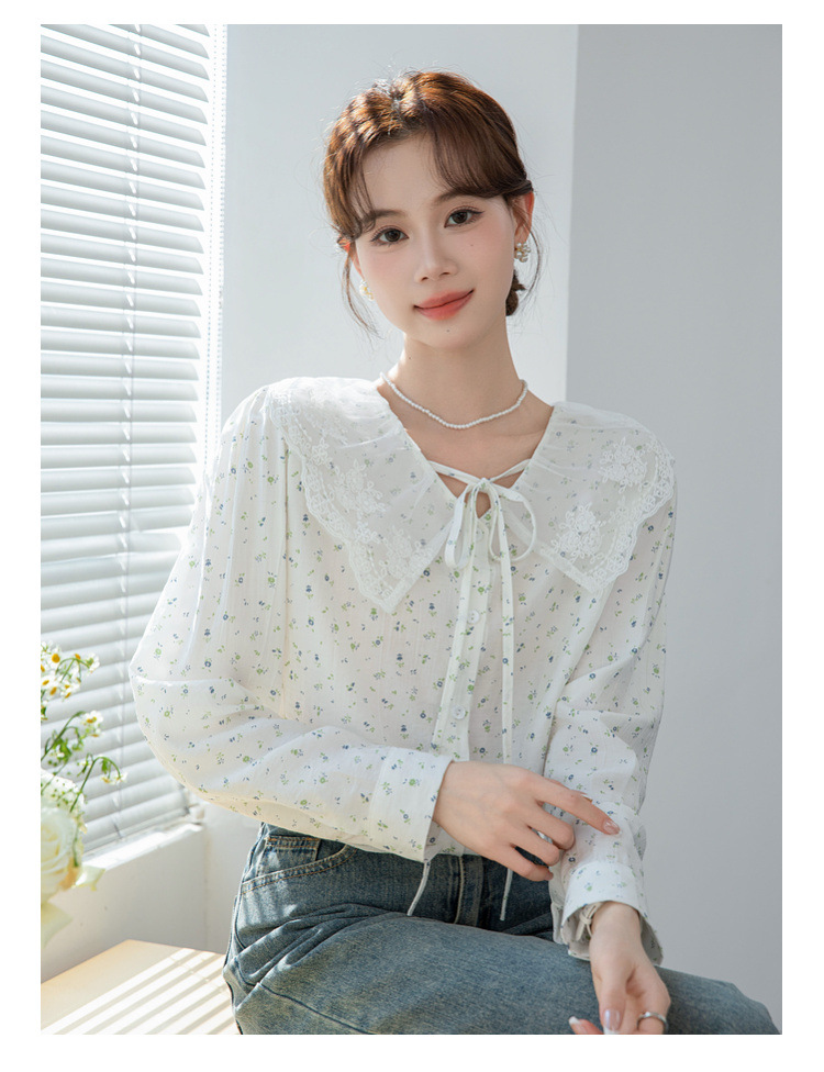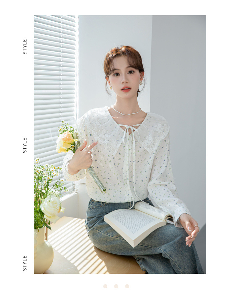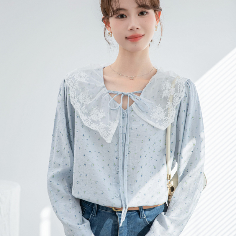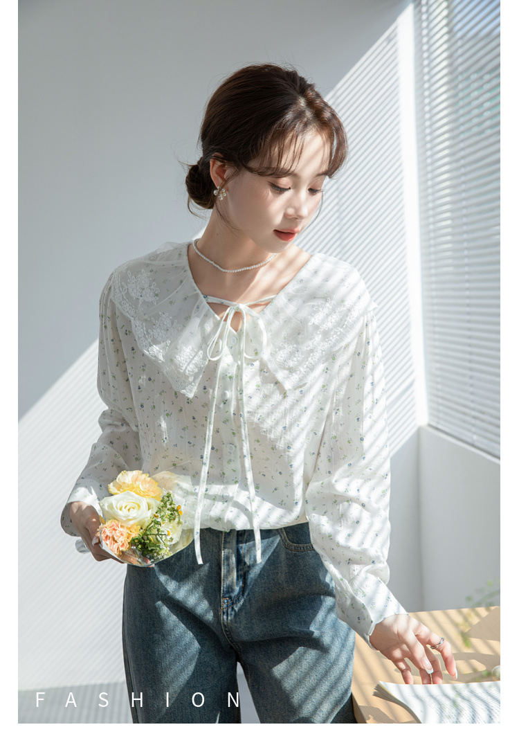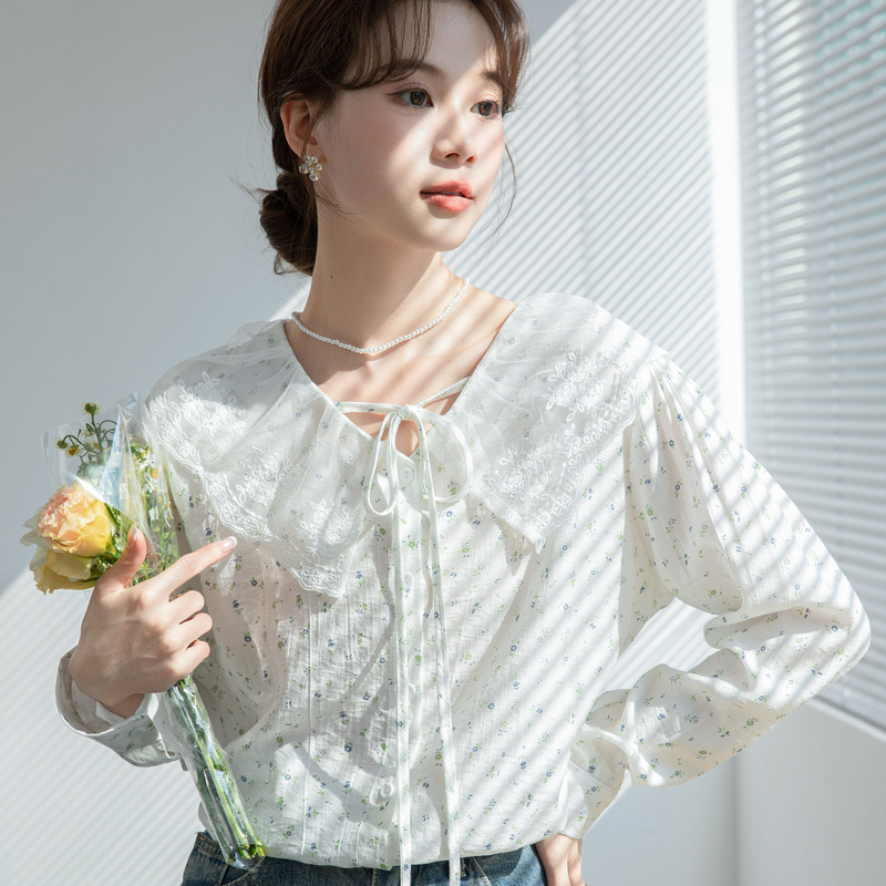 2025 봄 새로운 디자인 센스 니쉬 프랑스 달콤한 인형 셔츠 V 넥 레이스 업 긴 소매 꽃 셔츠스토어 가기