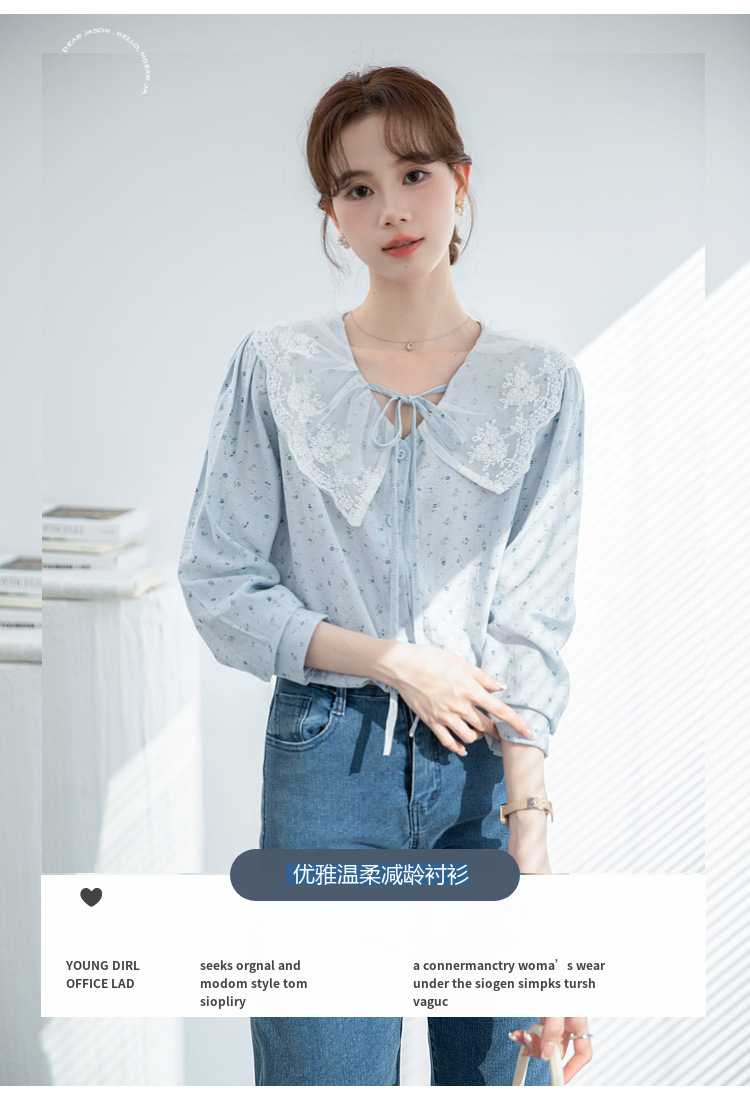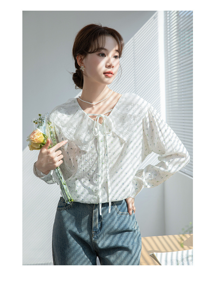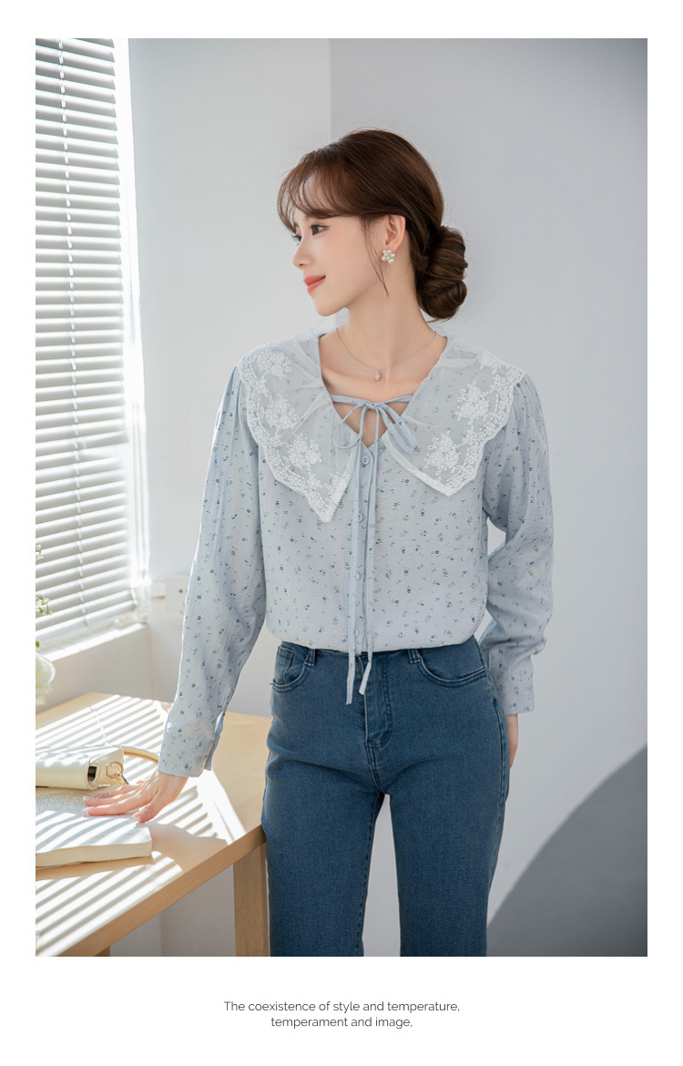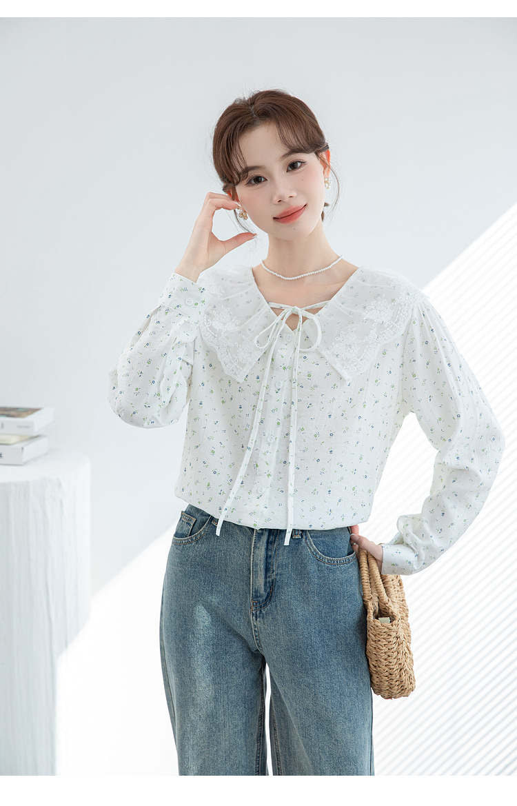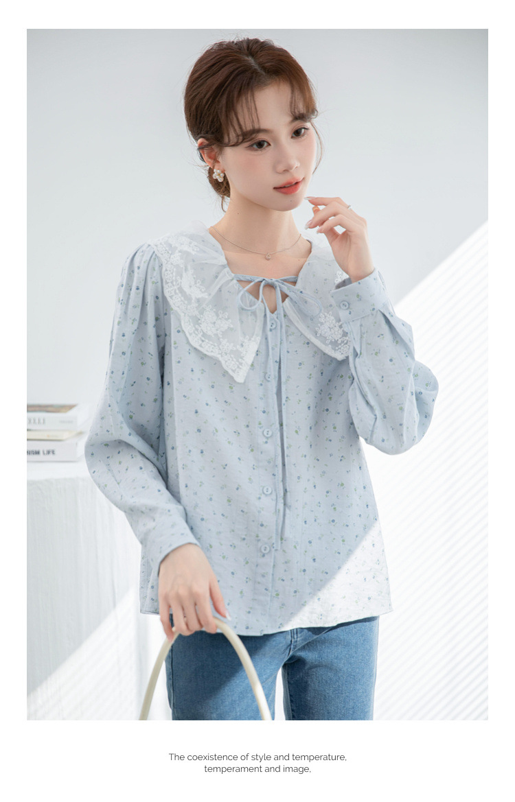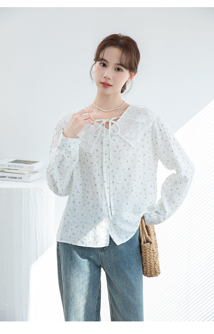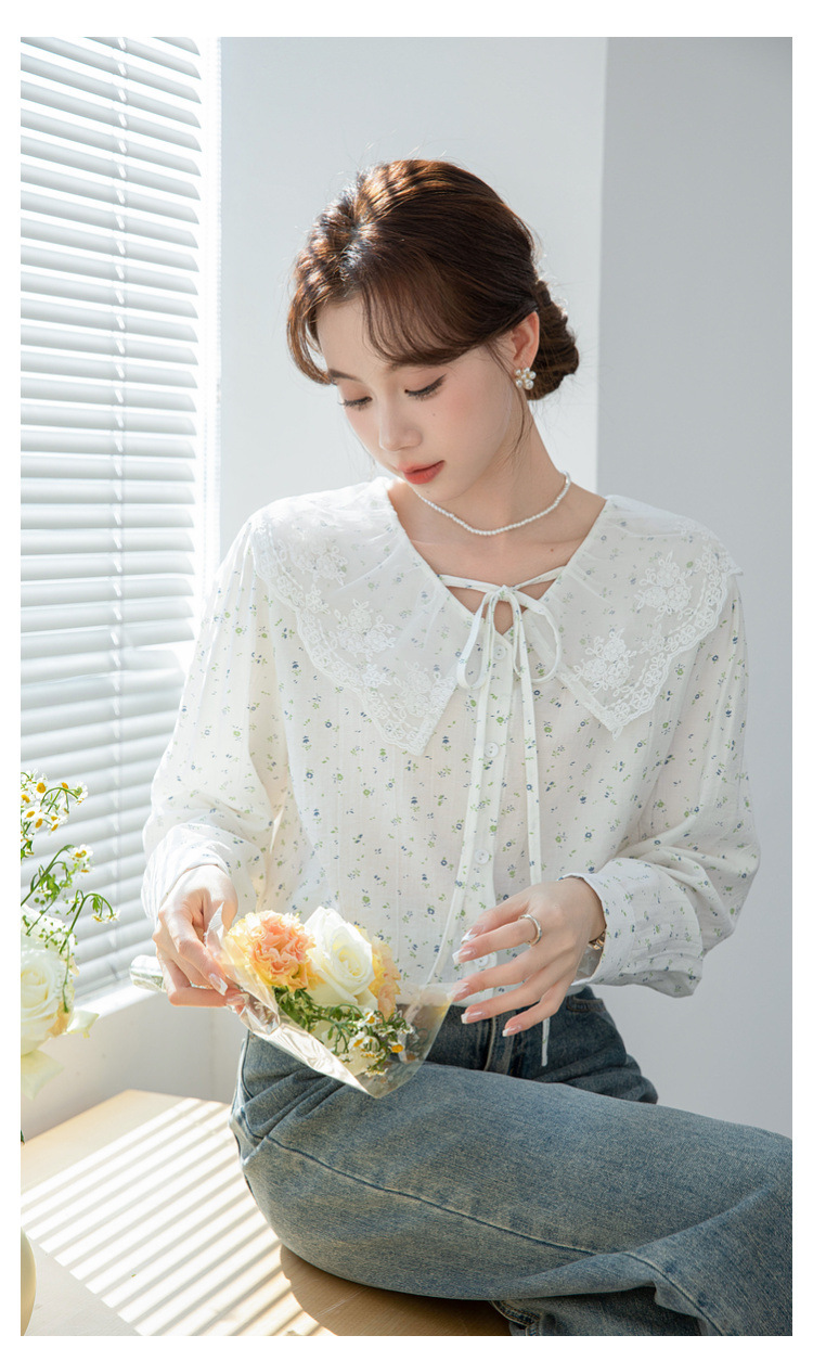 2025 봄 새로운 디자인 센스 니쉬 프랑스 달콤한 인형 셔츠 V 넥 레이스 업 긴 소매 꽃 셔츠스토어 가기