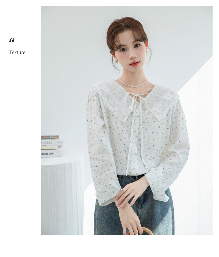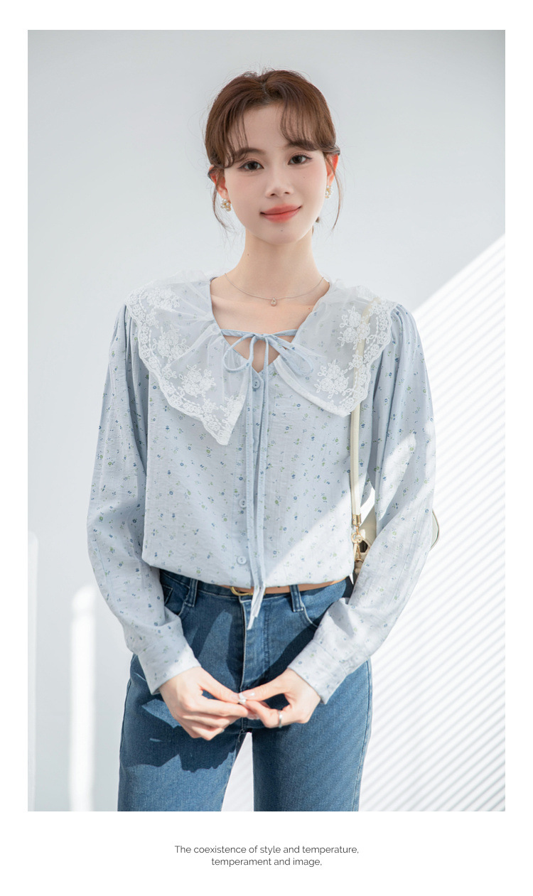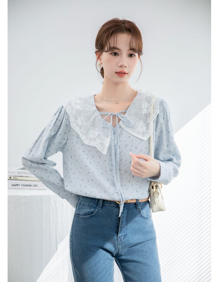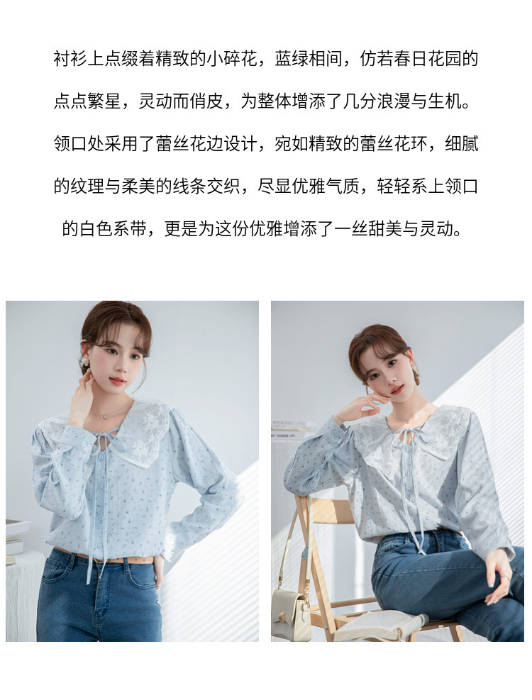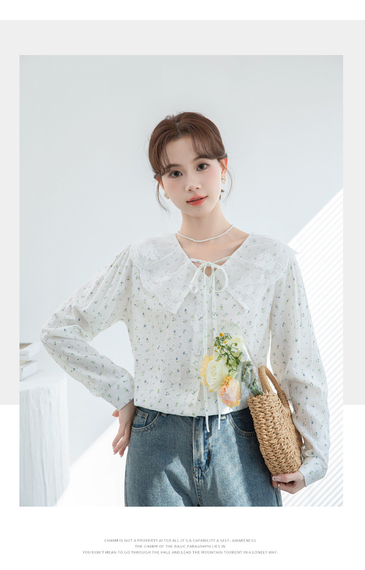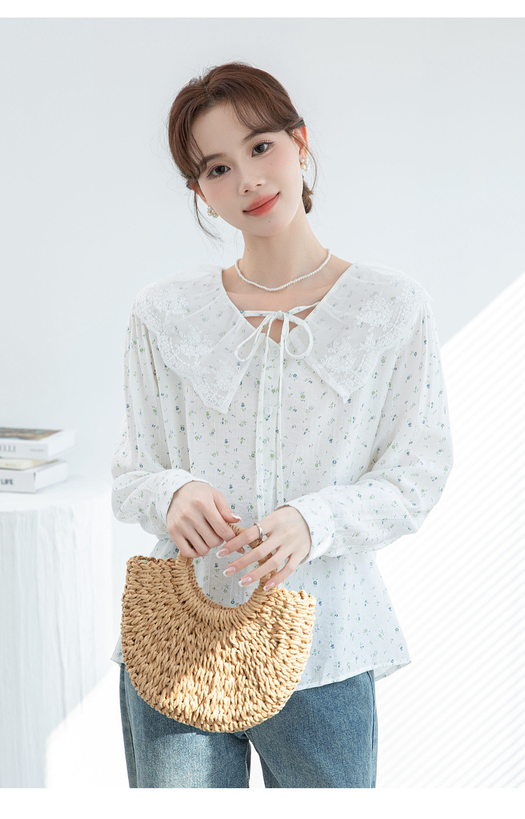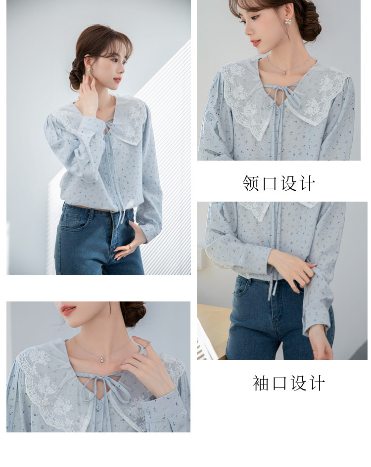2025 봄 새로운 디자인 센스 니쉬 프랑스 달콤한 인형 셔츠 V 넥 레이스 업 긴 소매 꽃 셔츠스토어 가기