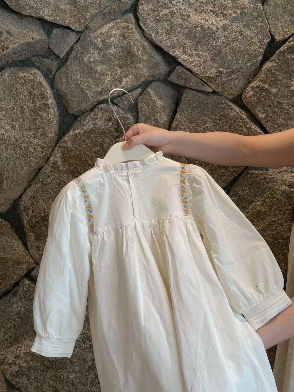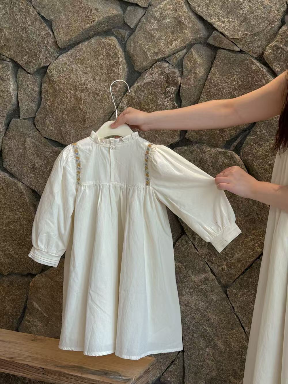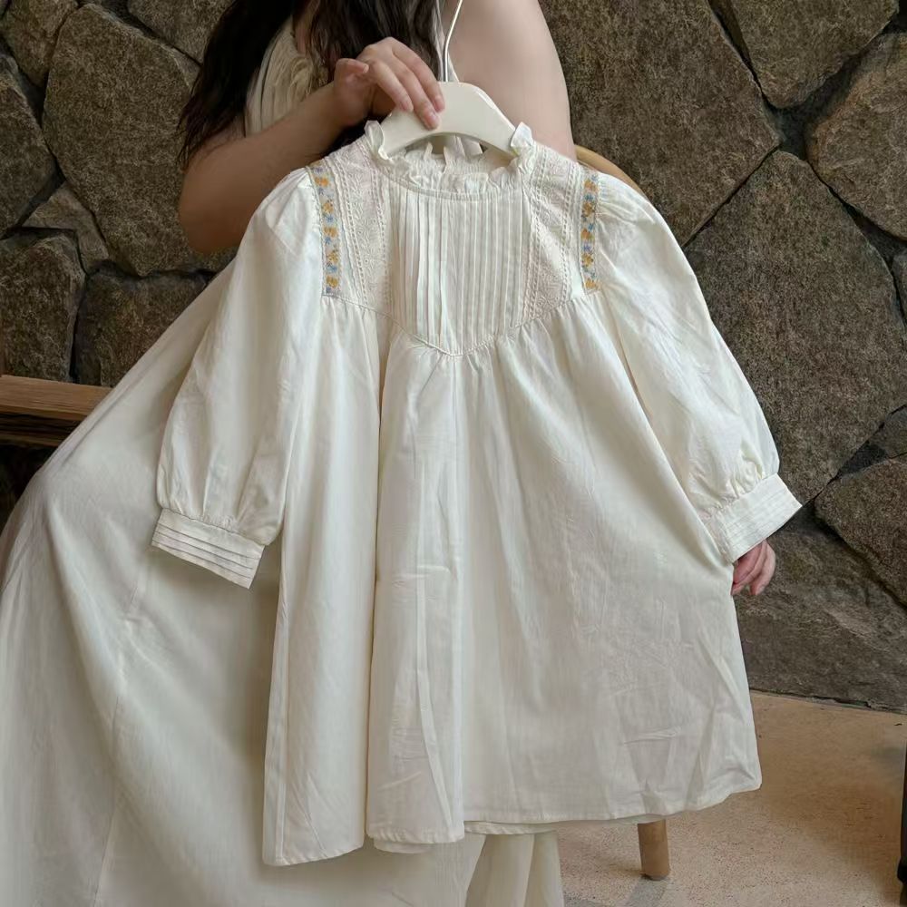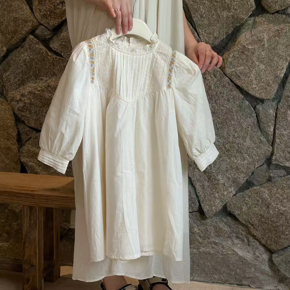 봄 아동복 새로운 소녀 프랑스 복고풍 틈새 헵번 스타일 주름 스탠드 칼라 화이트 퍼프 소매 원피스