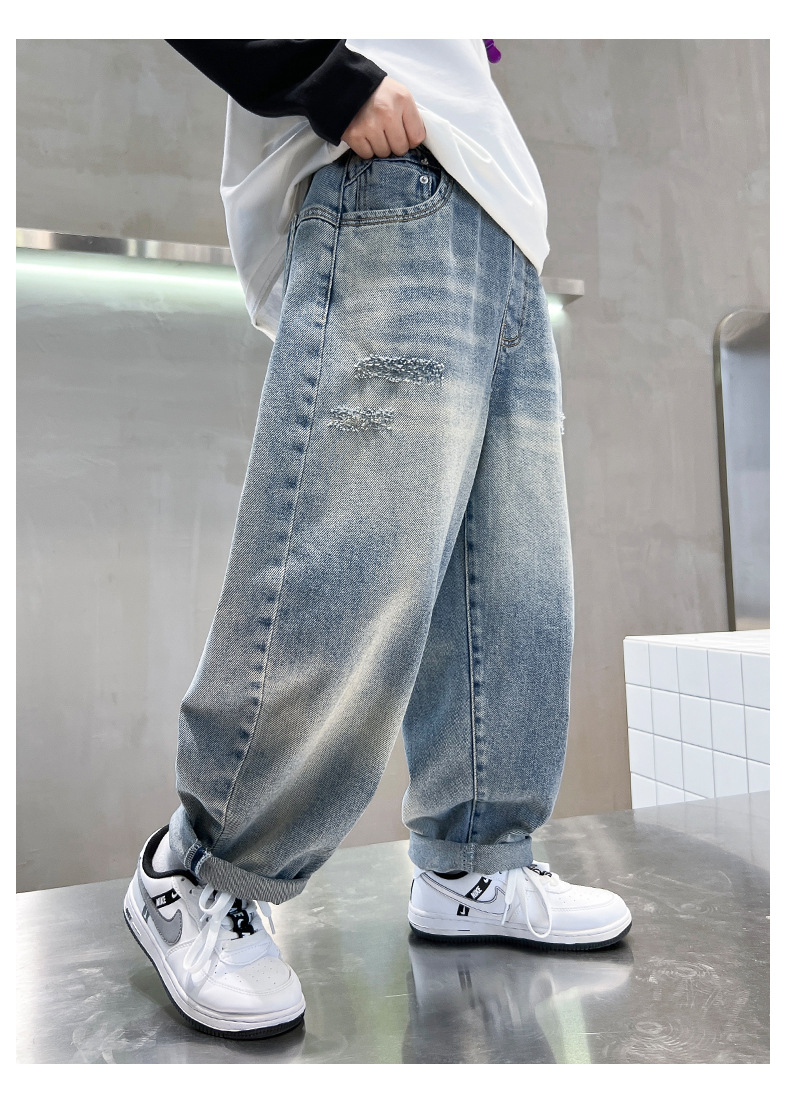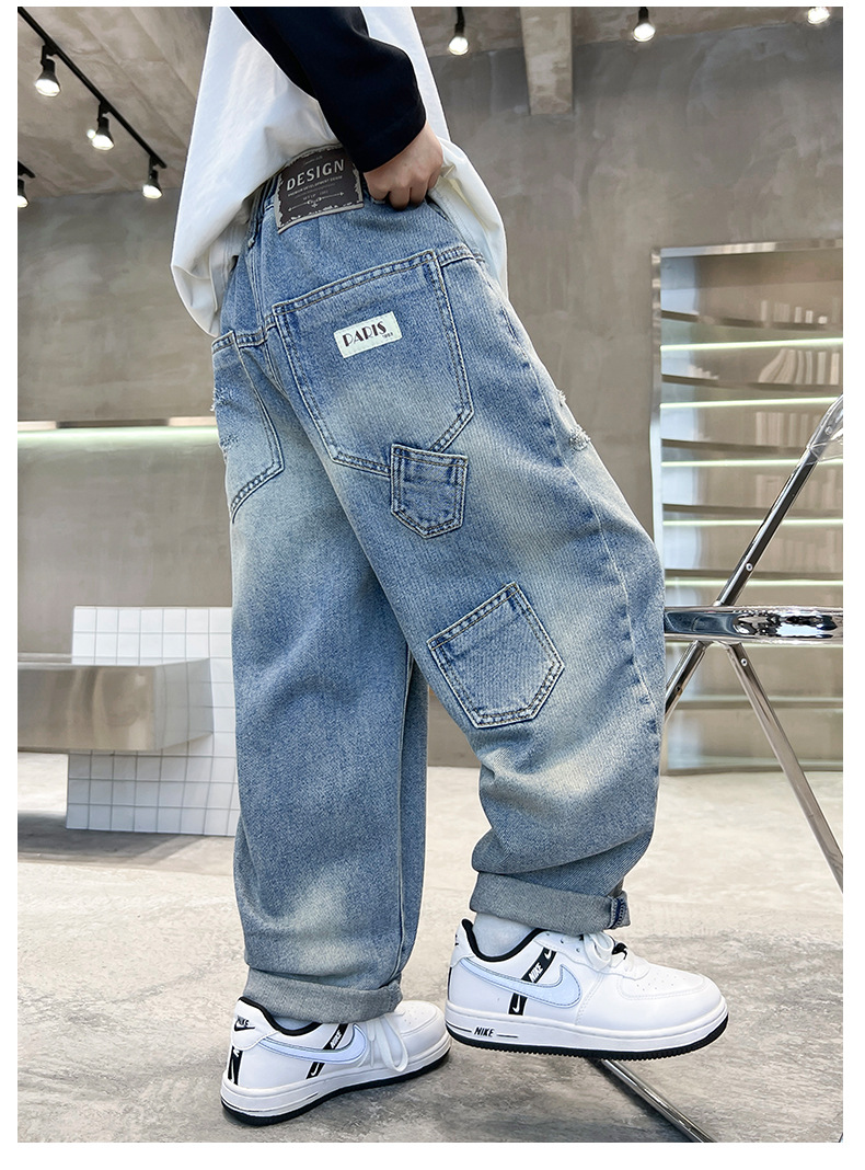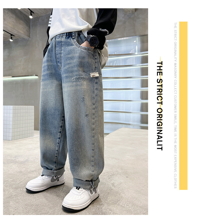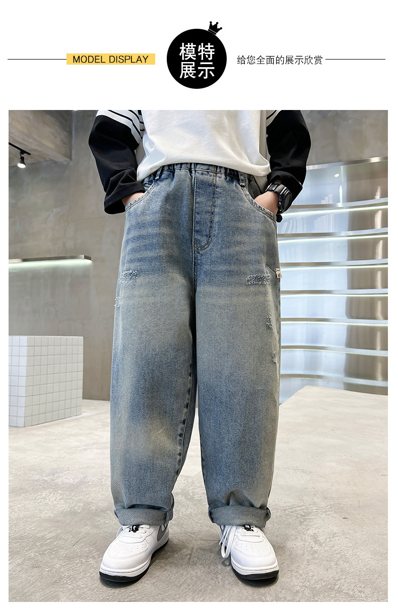 소년의 봄 데님 바지 2025 새로운 스타일 봄 느슨한 소년의 봄과 가을 스트레이트 바지스토어 가기