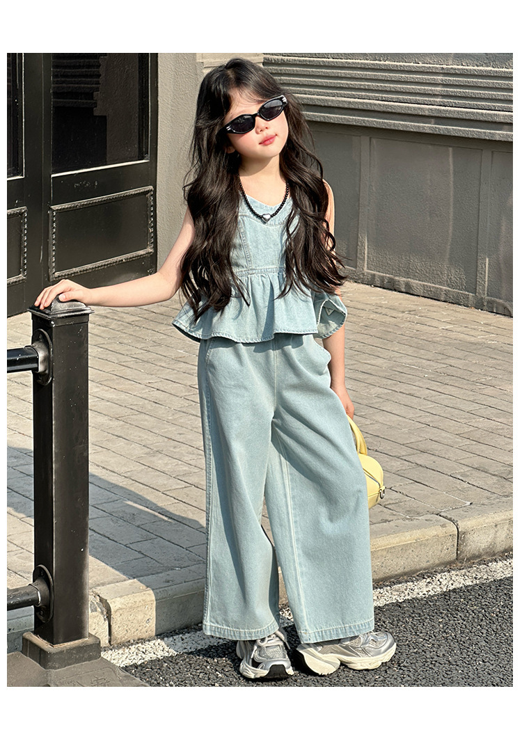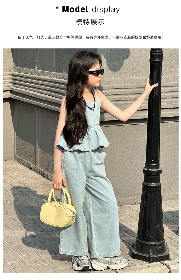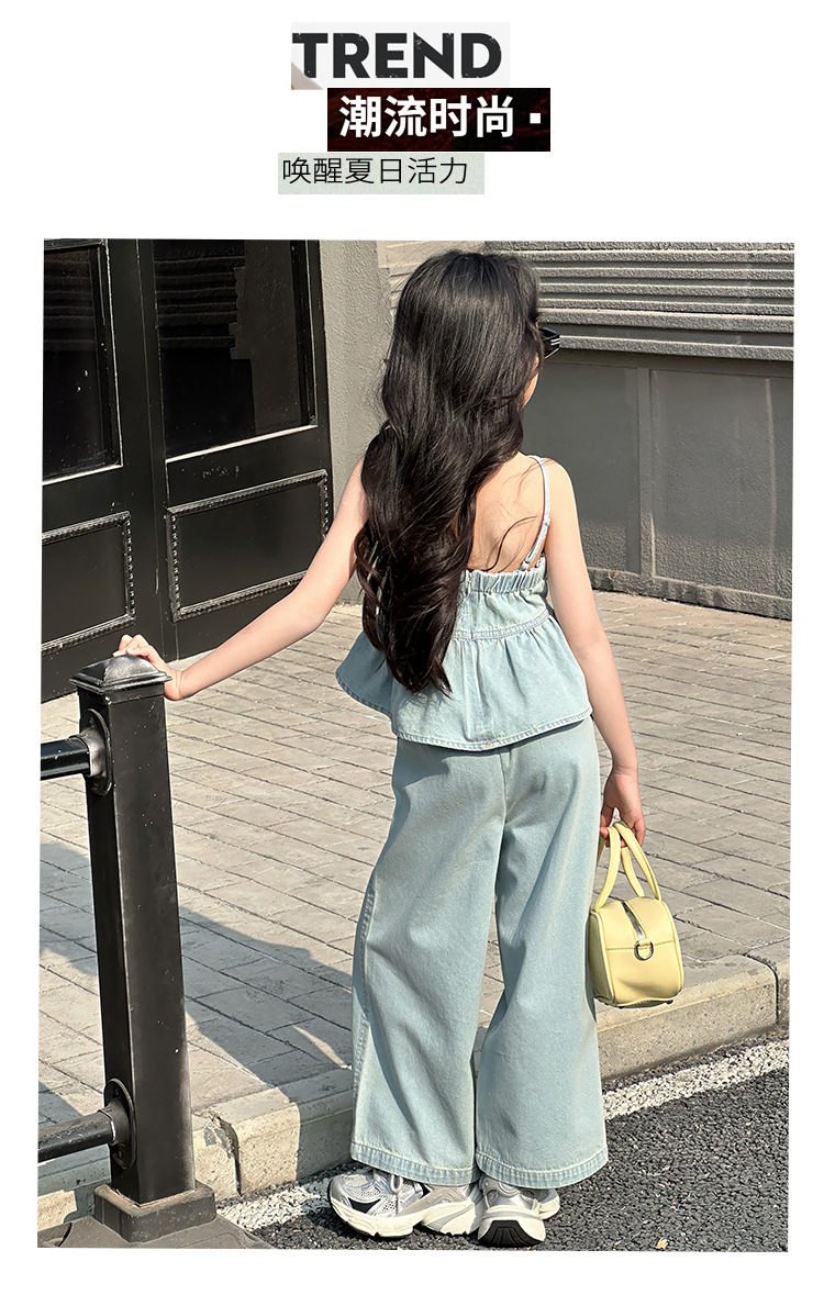 소녀 여름 세트 2025 새로운 스타일 서양식 얇은 어린이 슬링 여름 원피스 소녀 데님 바지 투피스 세트스토어 가기