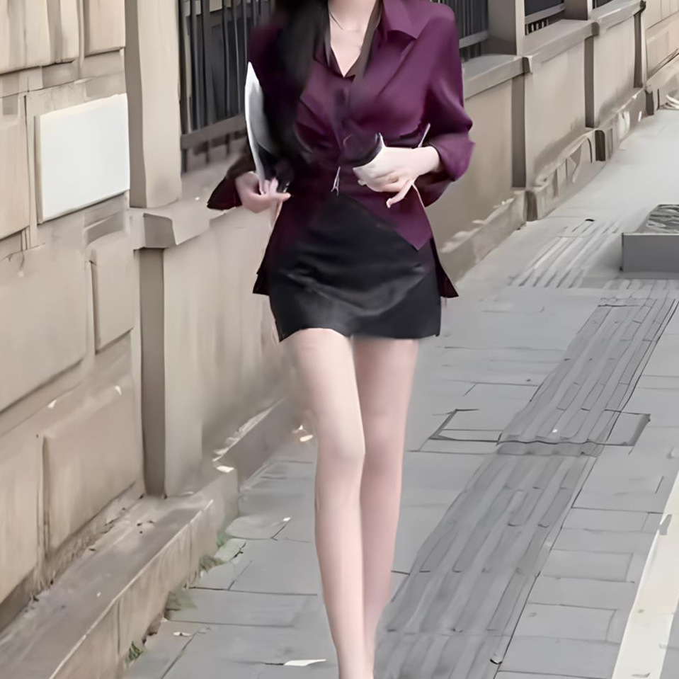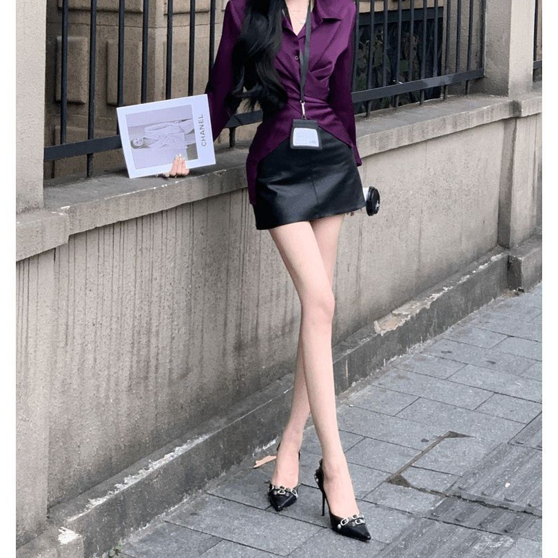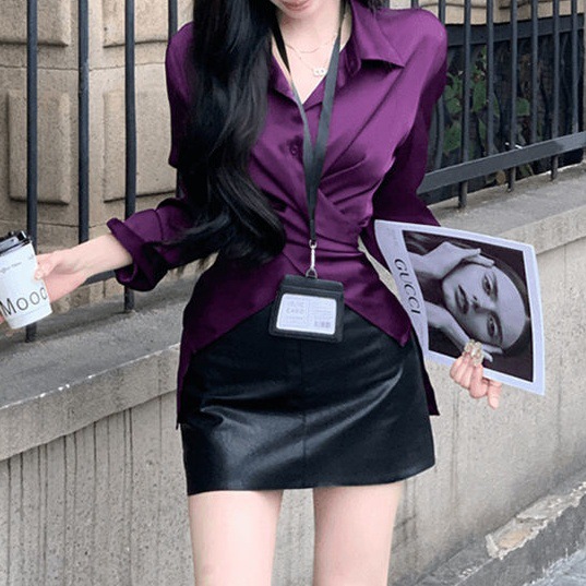 2026년 봄 프렌치 스타일 허리라인이 잘록한 긴팔 셔츠 여성용, 독특한 디자인, 세련되고 다재다능한 보라색 셔츠와 블랙 스커트스토어 가기