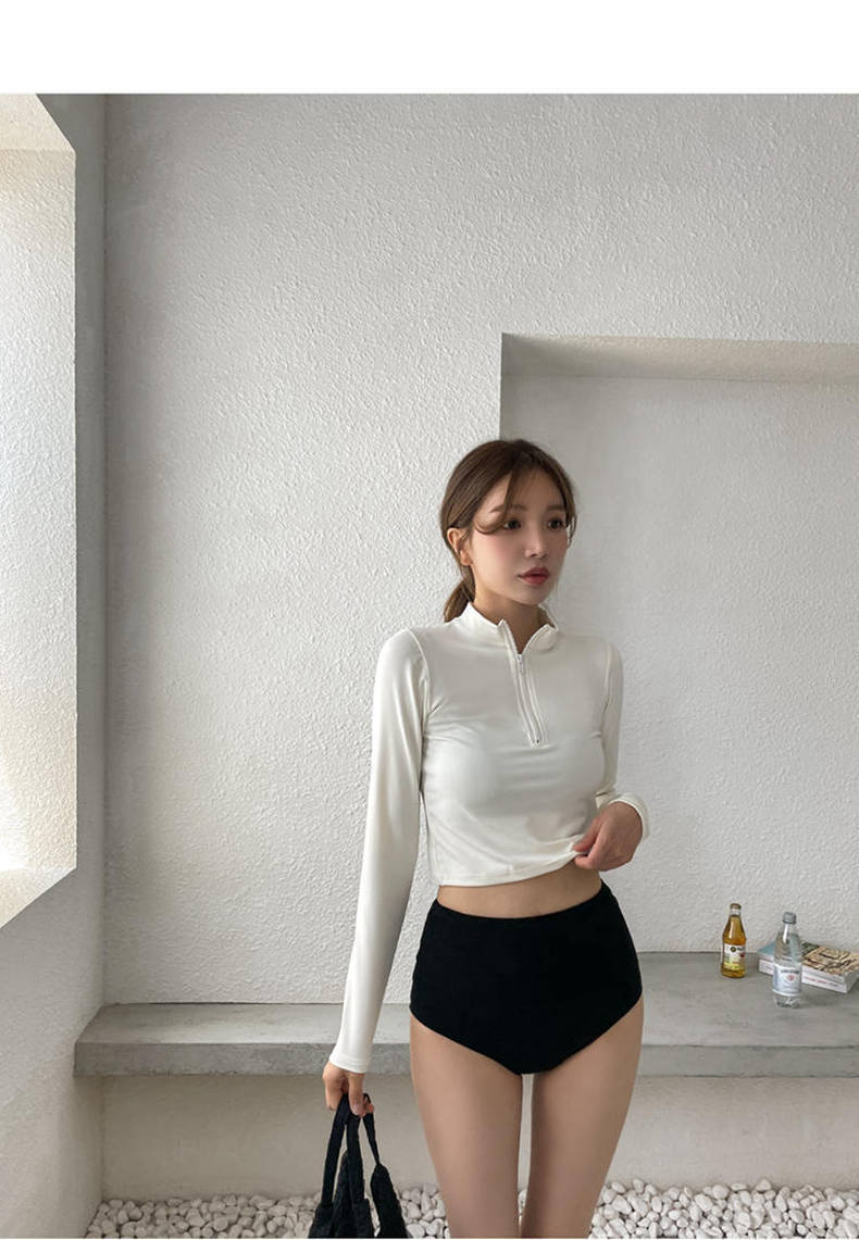 2025韩国新款泳装性感修身长袖外套保守高腰遮肚分体泳衣女三件套