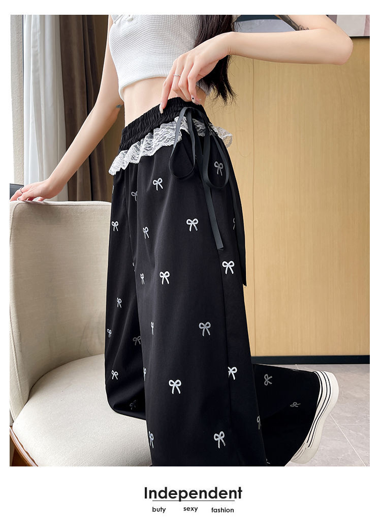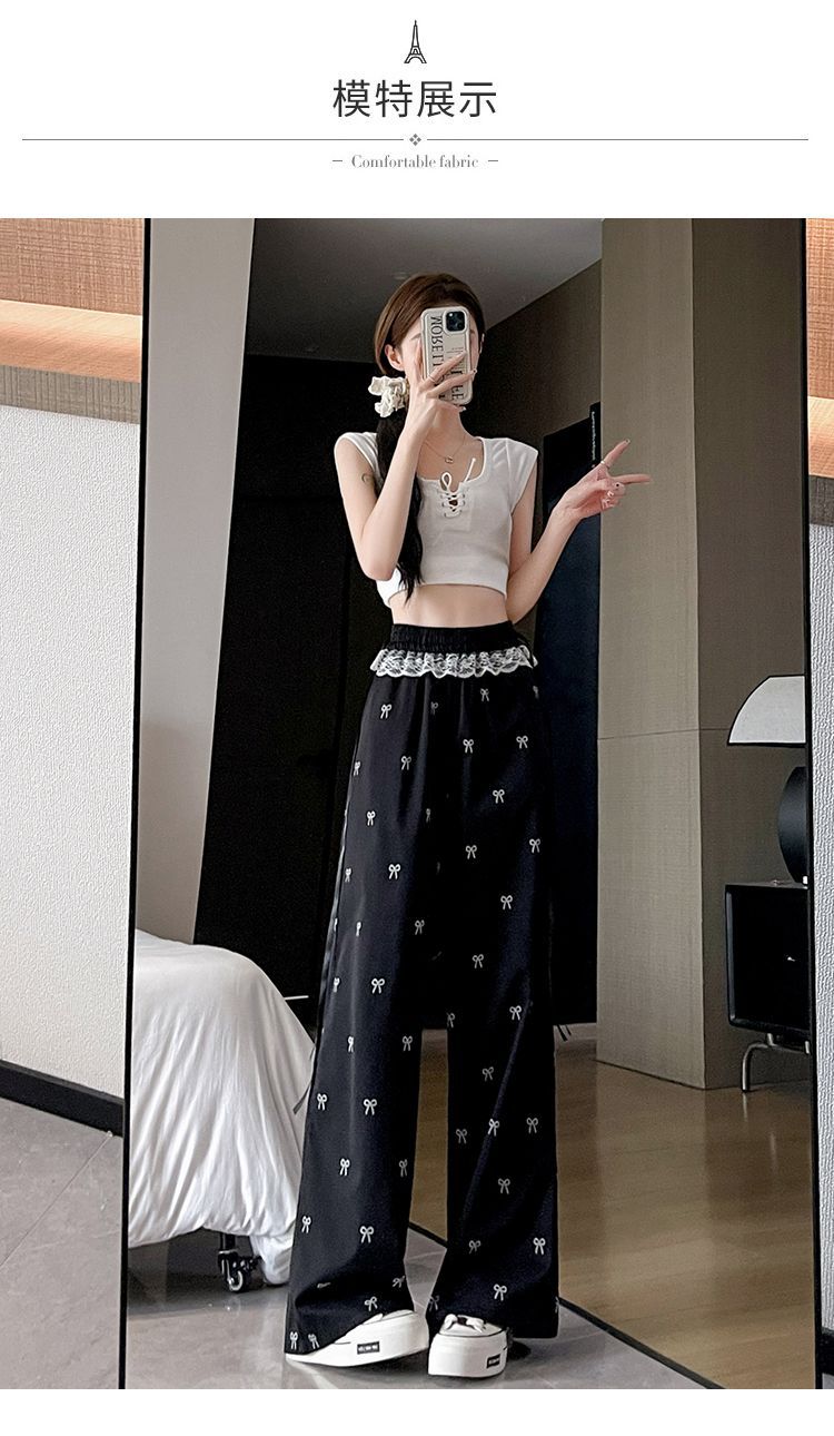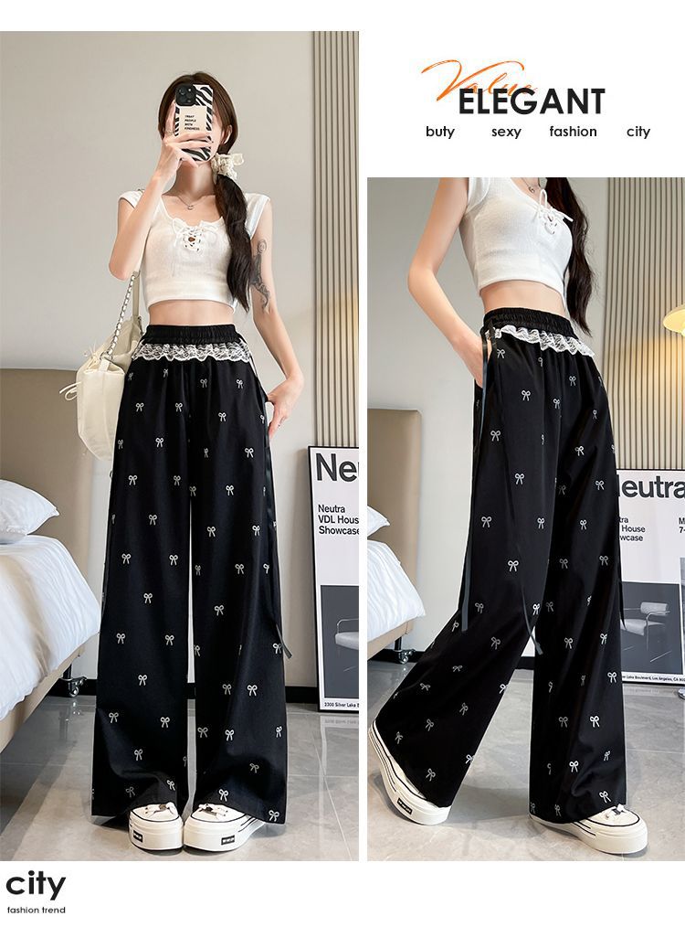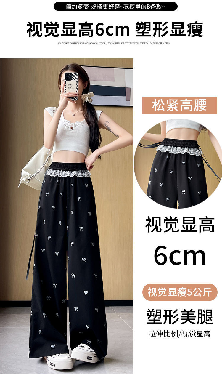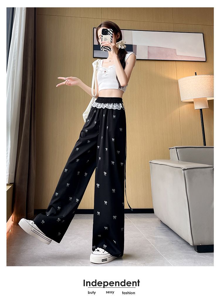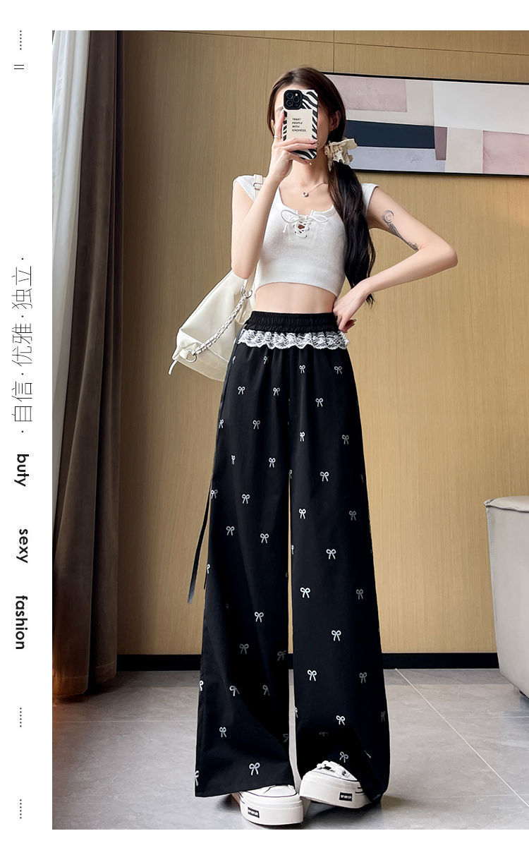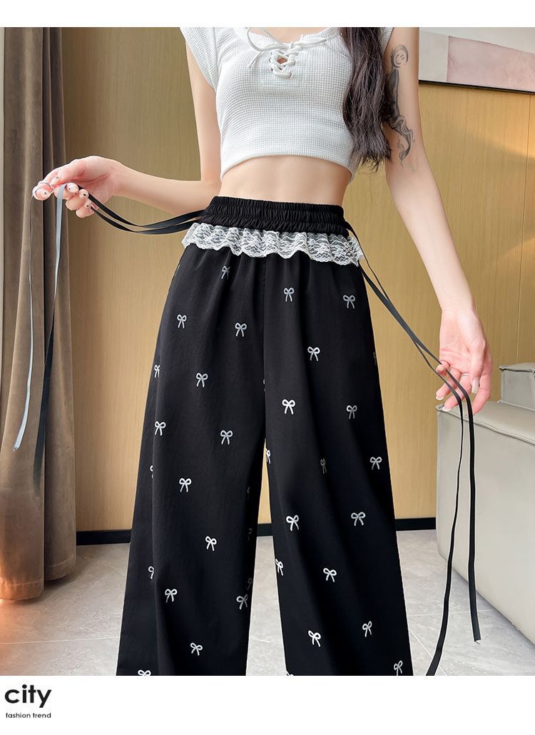레이스 스티칭 활 레이스 와이드 다리 바지 여성용 여름 얇은 2024 새로운 높은 허리 데프 스트레이트 캐주얼 바지스토어 가기