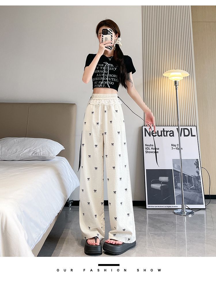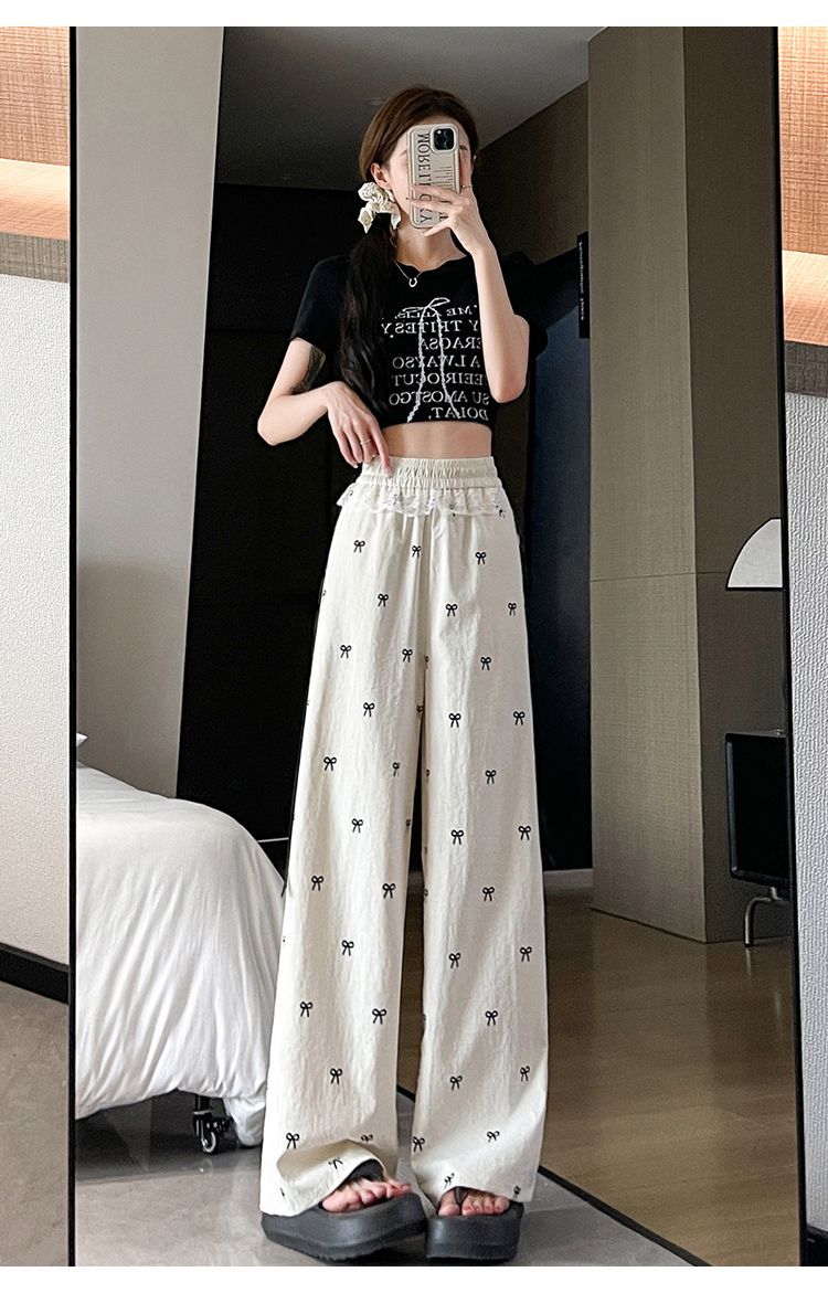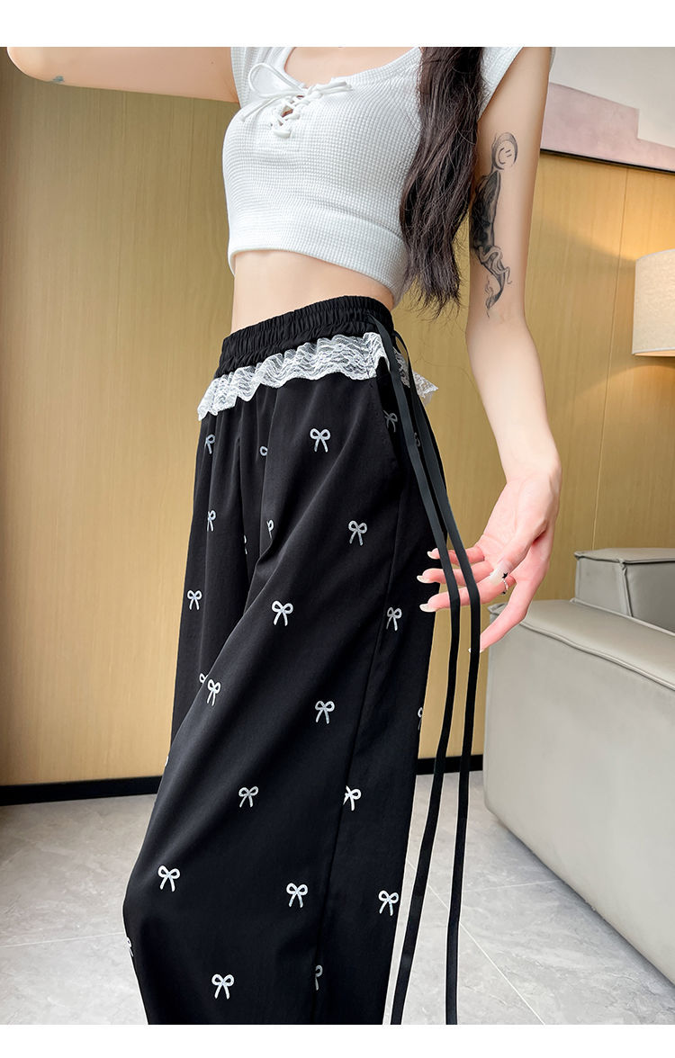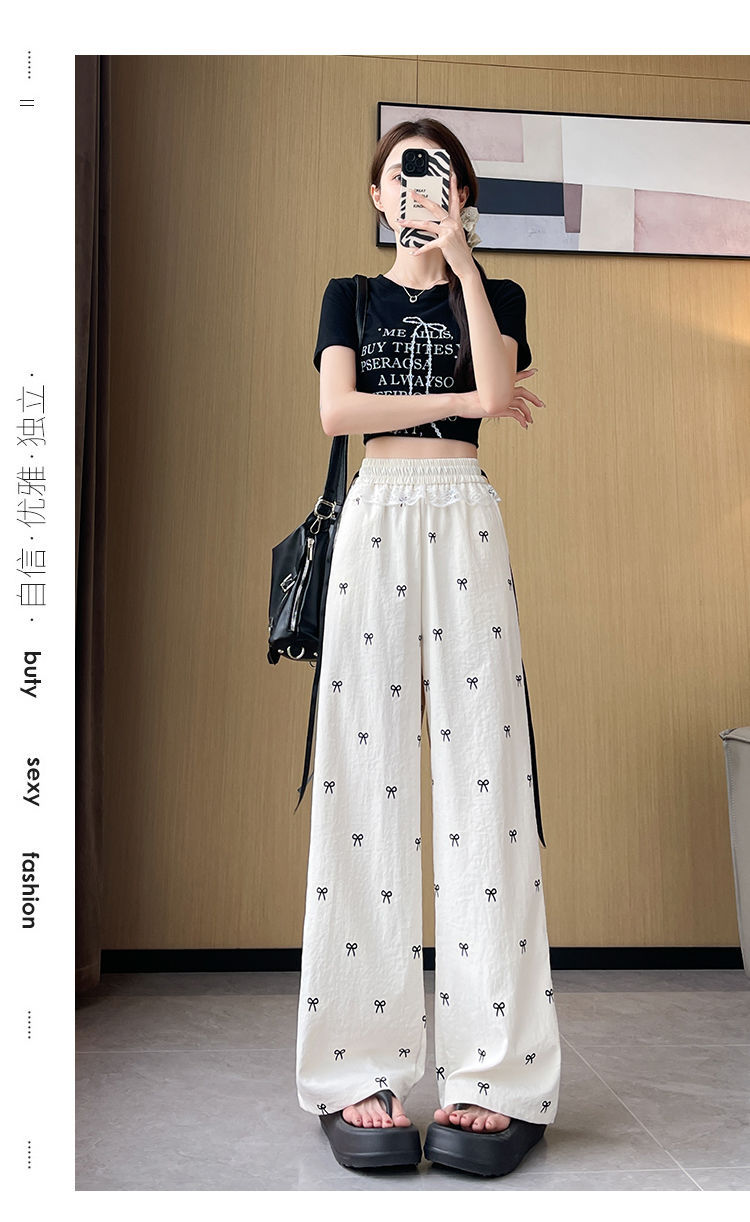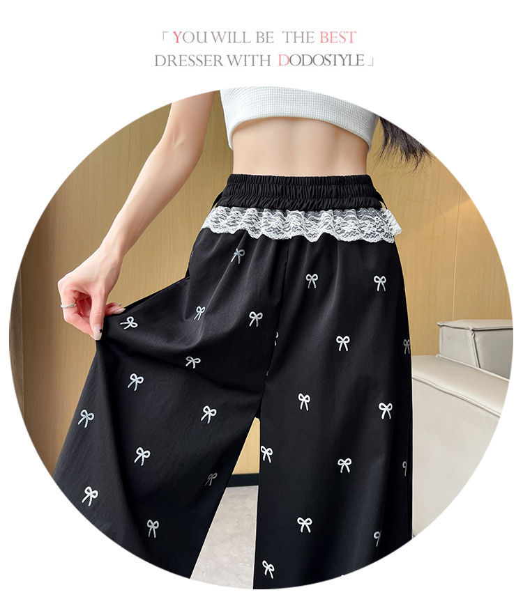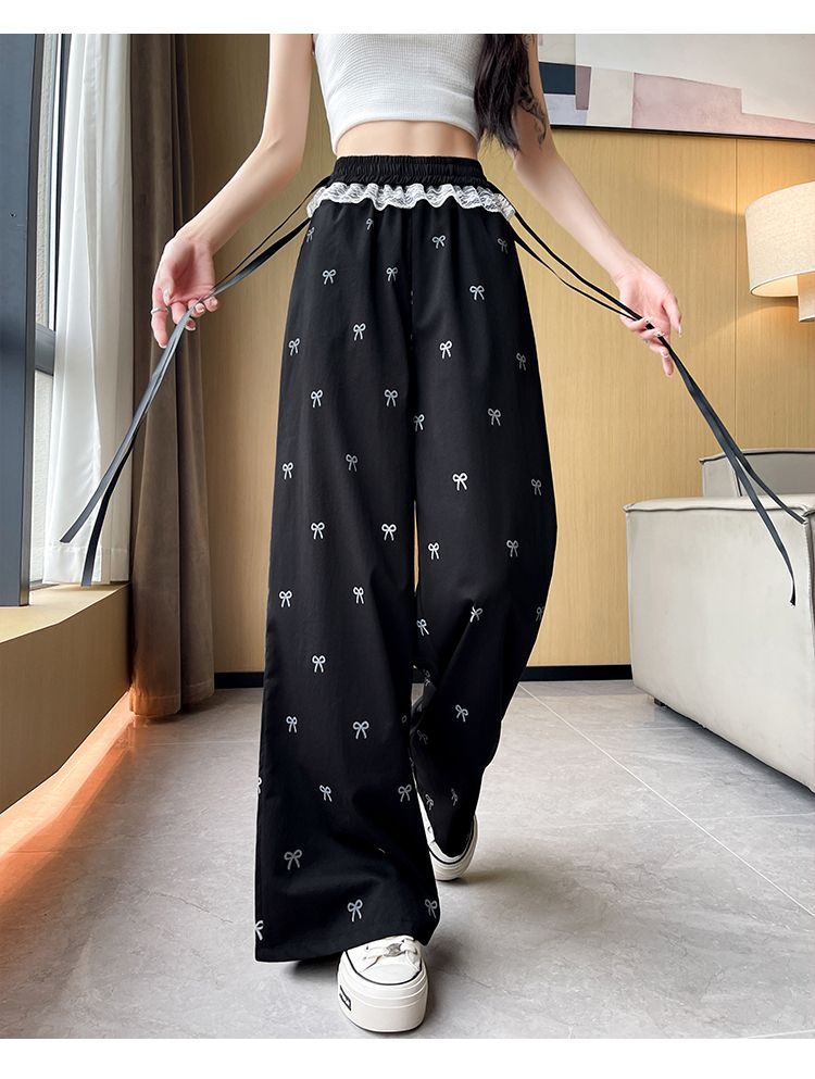 레이스 스티칭 활 레이스 와이드 다리 바지 여성용 여름 얇은 2024 새로운 높은 허리 데프 스트레이트 캐주얼 바지스토어 가기