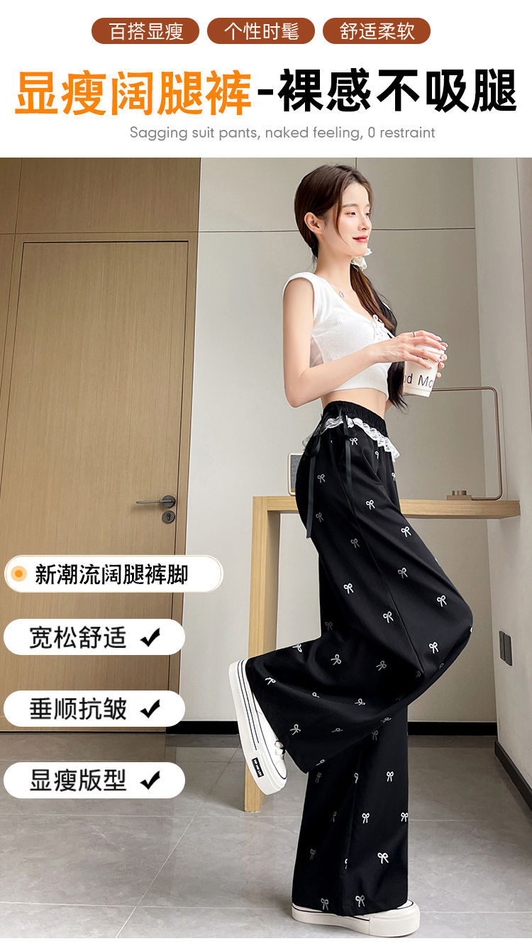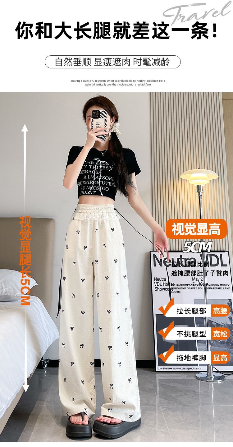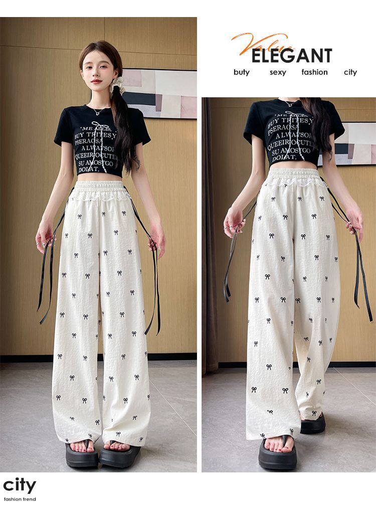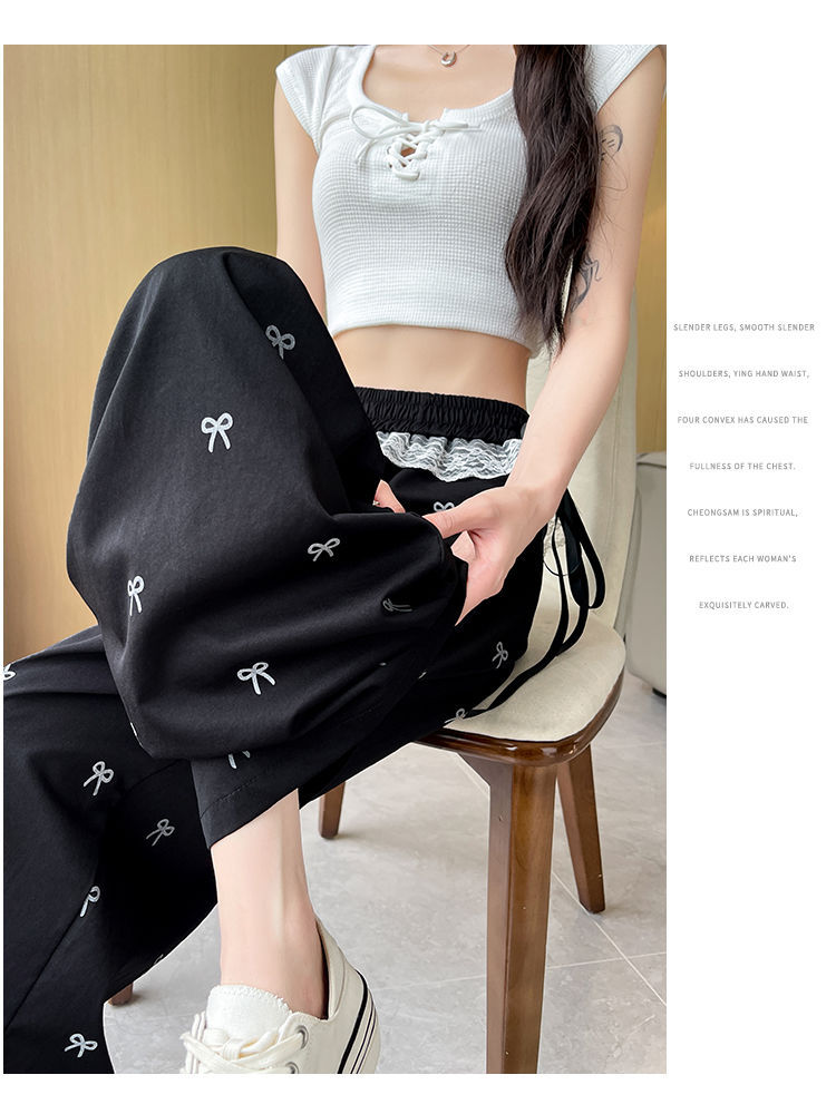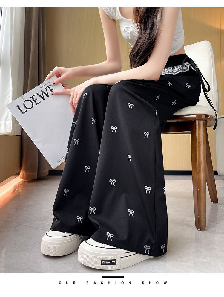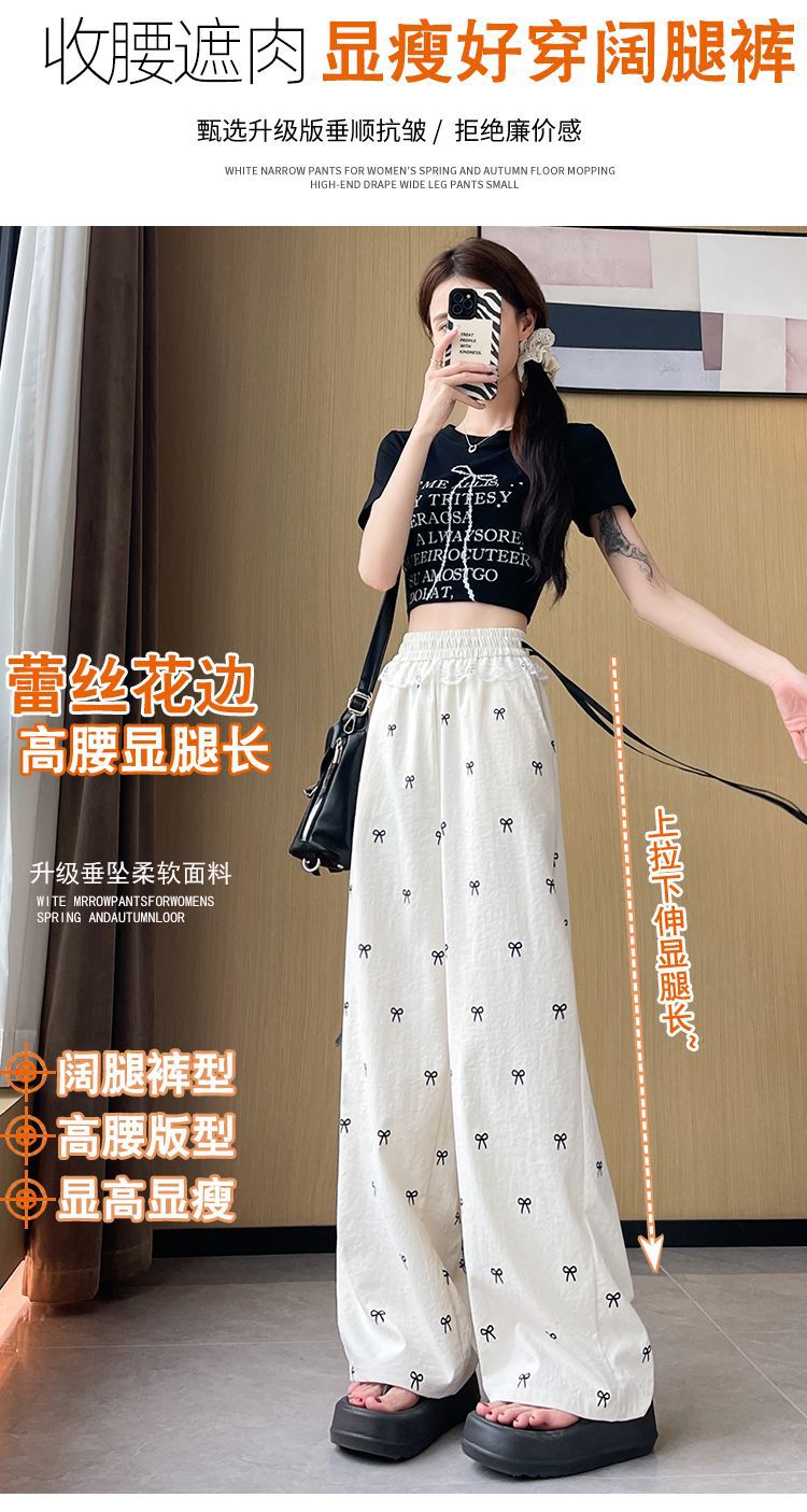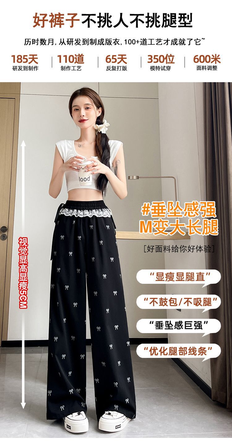 레이스 스티칭 활 레이스 와이드 다리 바지 여성용 여름 얇은 2024 새로운 높은 허리 데프 스트레이트 캐주얼 바지스토어 가기