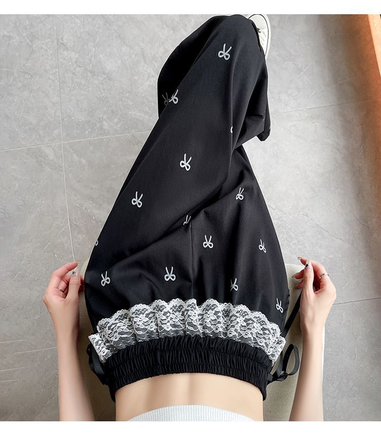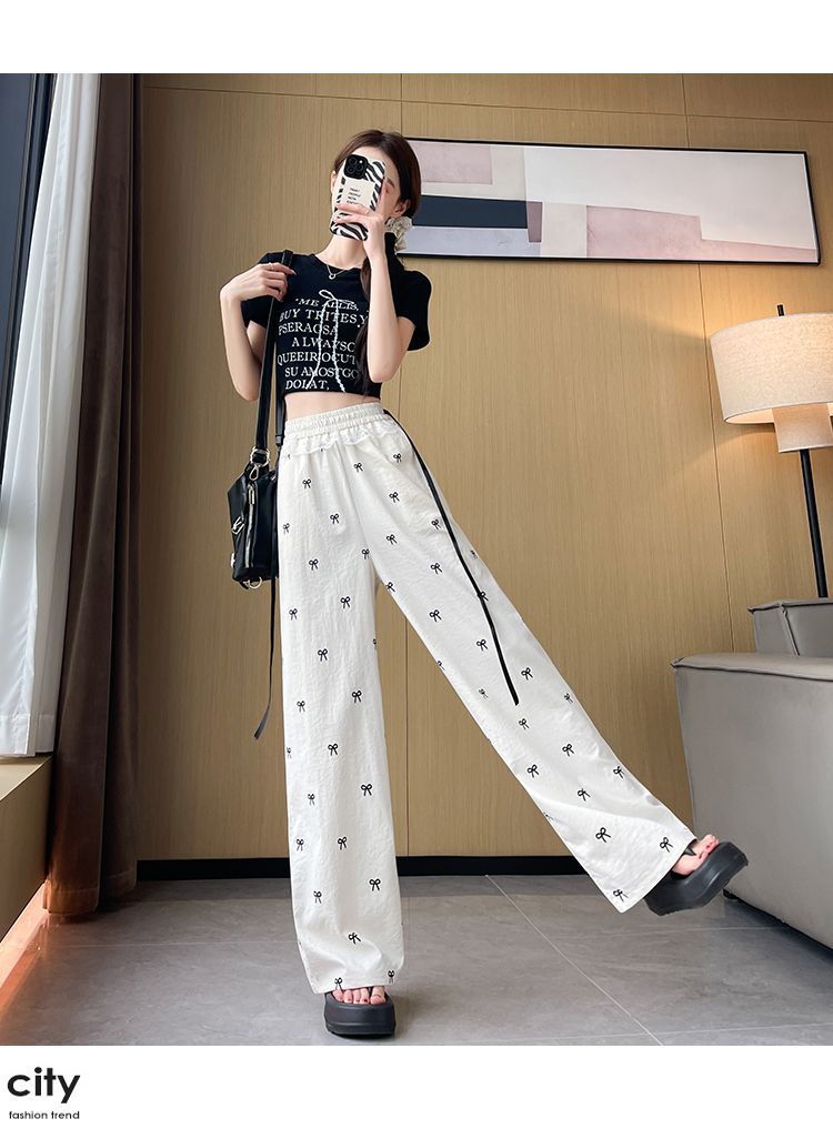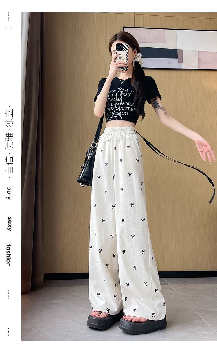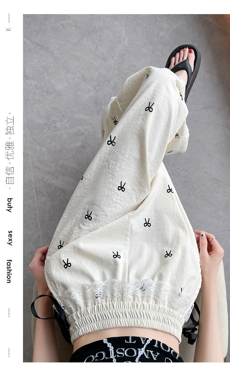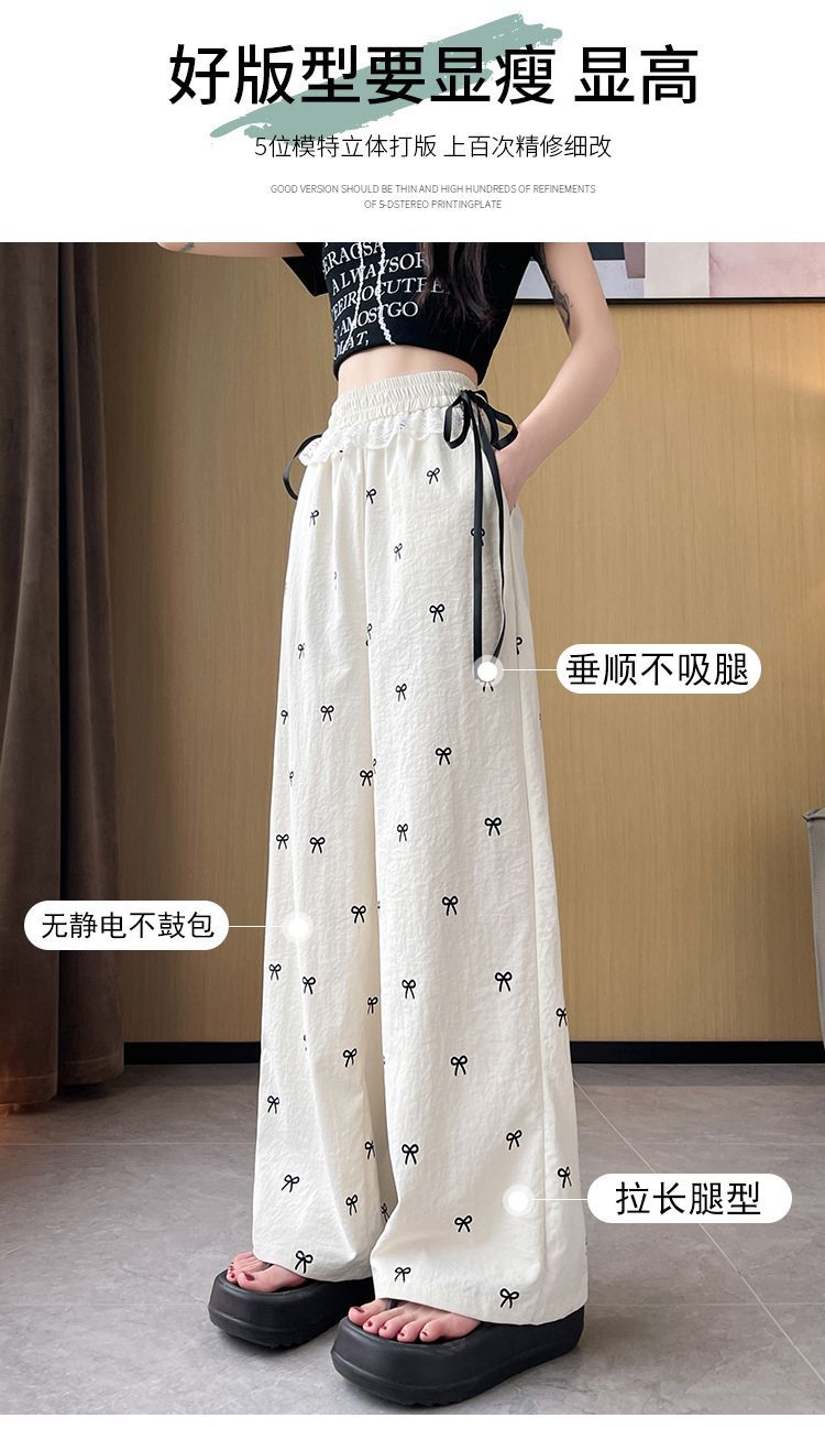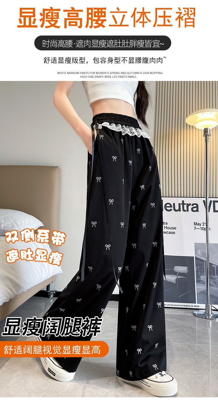 레이스 스티칭 활 레이스 와이드 다리 바지 여성용 여름 얇은 2024 새로운 높은 허리 데프 스트레이트 캐주얼 바지스토어 가기