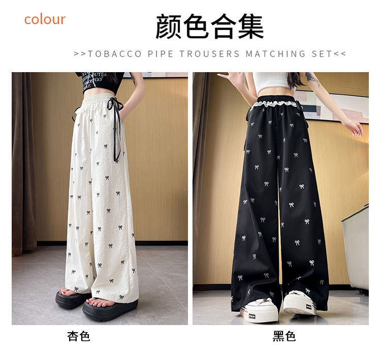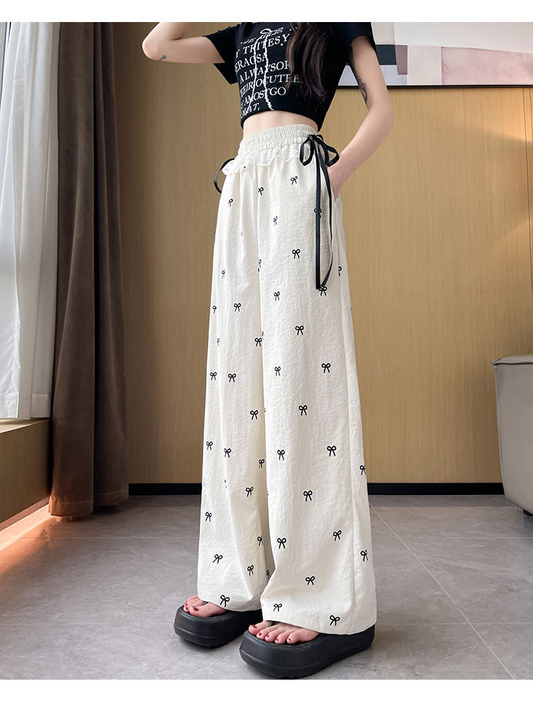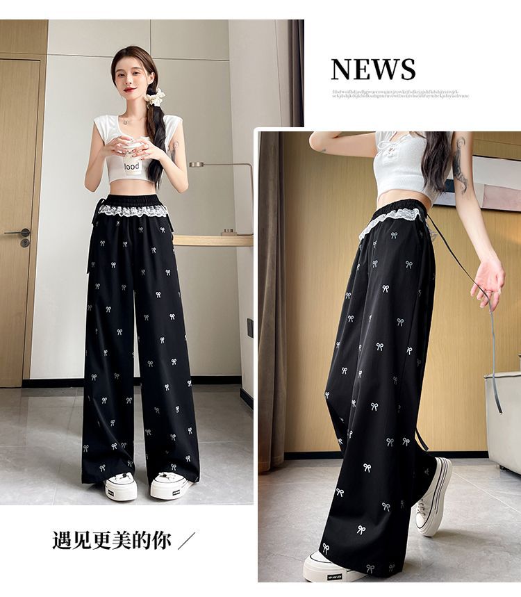 레이스 스티칭 활 레이스 와이드 다리 바지 여성용 여름 얇은 2024 새로운 높은 허리 데프 스트레이트 캐주얼 바지