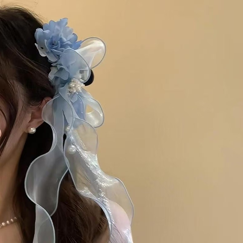 슈퍼 요정 블루 플라워 클립 여성의 달콤한 독특한 리본 활 머리 상어 클립 틈새 올 매치 헤어 액세서리 트렌디