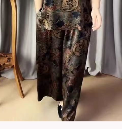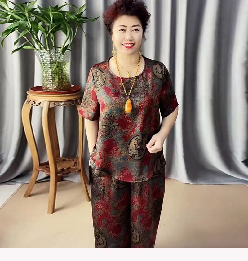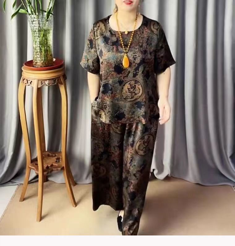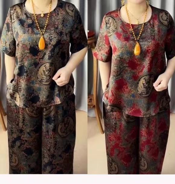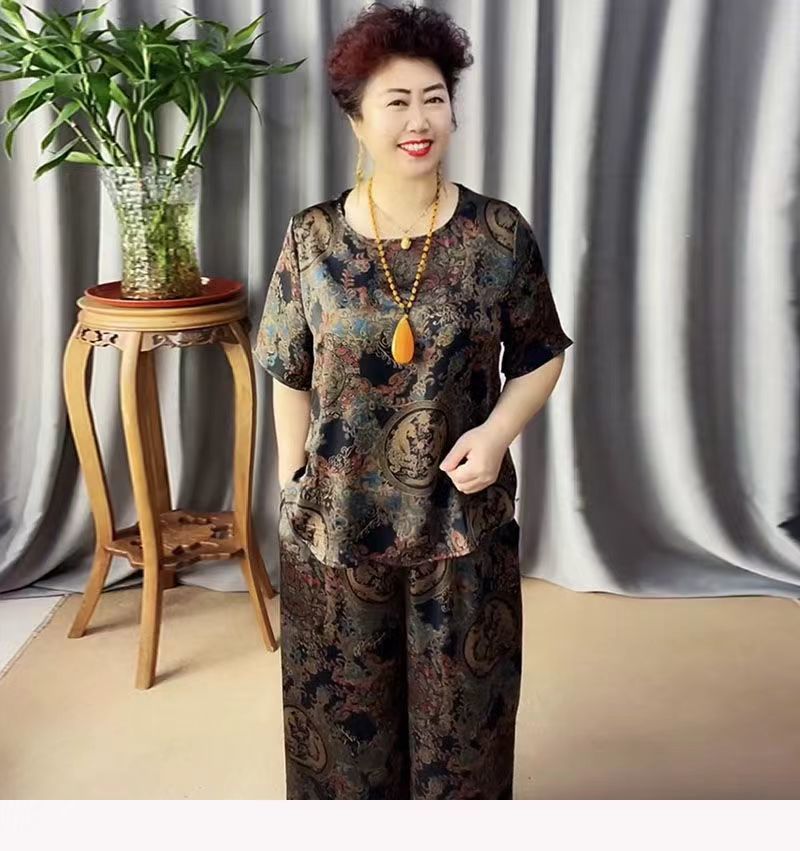 중년 및 노인 어머니 여름 원피스 외국 스타일 세트 2025 새로운 패션 느슨한 슬리밍 복고풍 인쇄 할머니 투피스 세트