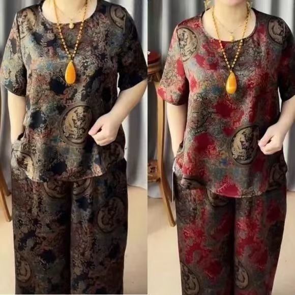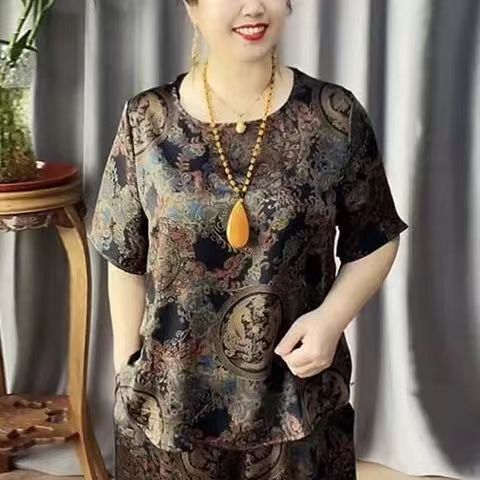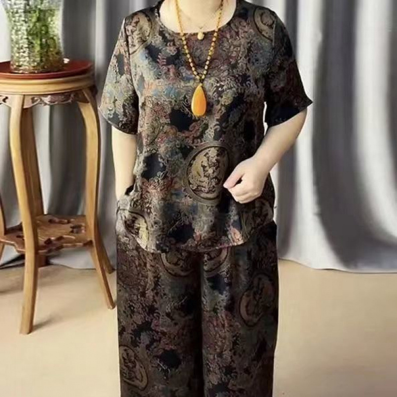중년 및 노인 어머니 여름 원피스 외국 스타일 세트 2025 새로운 패션 느슨한 슬리밍 복고풍 인쇄 할머니 투피스 세트스토어 가기