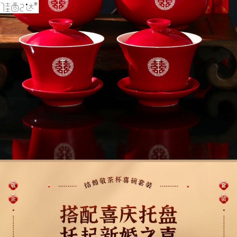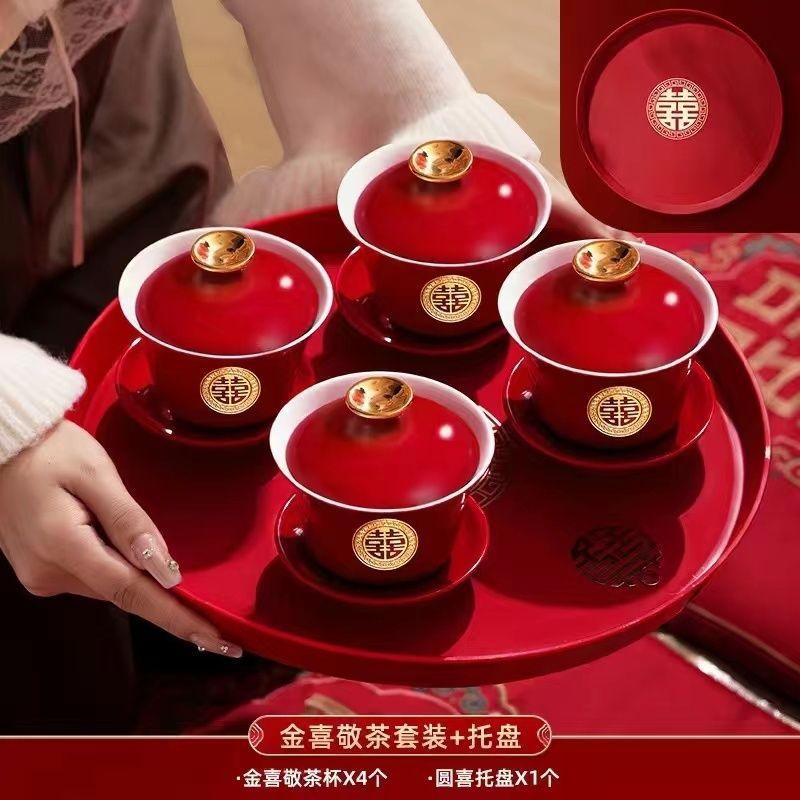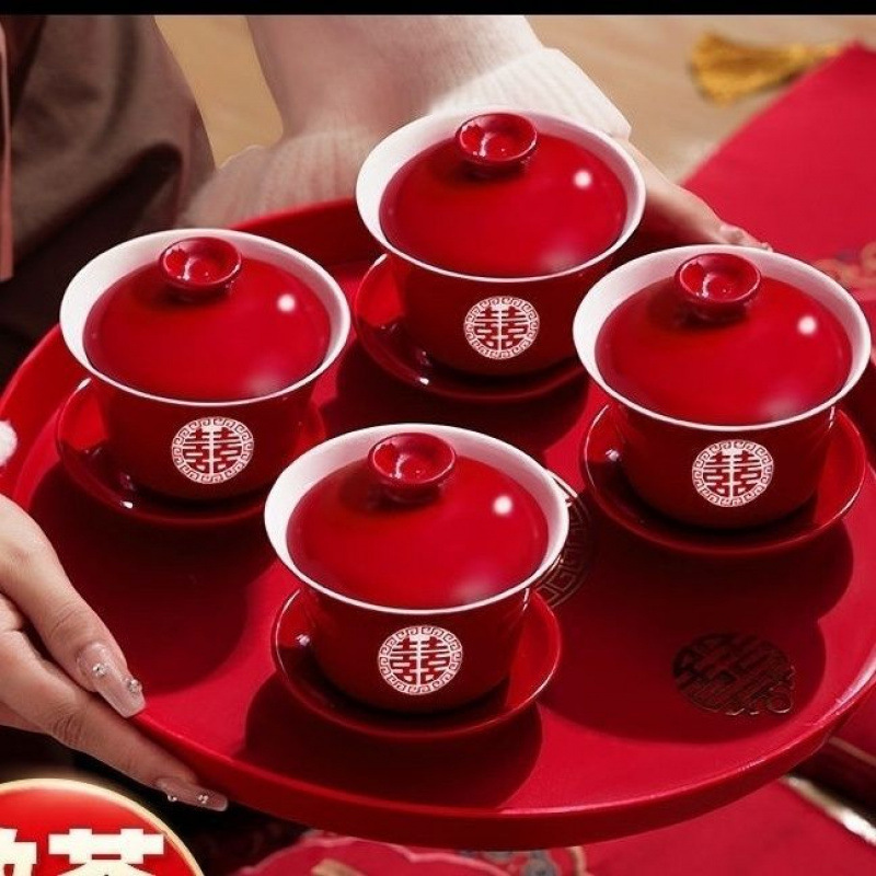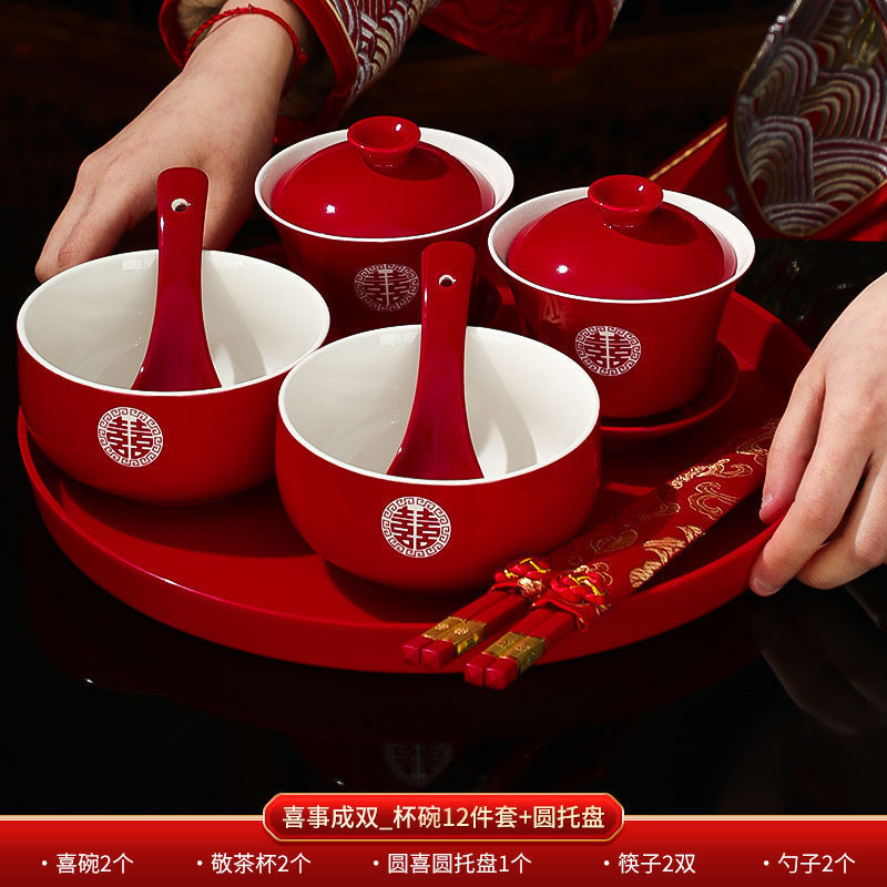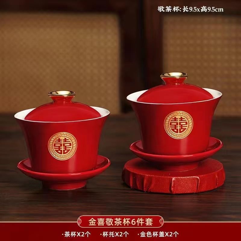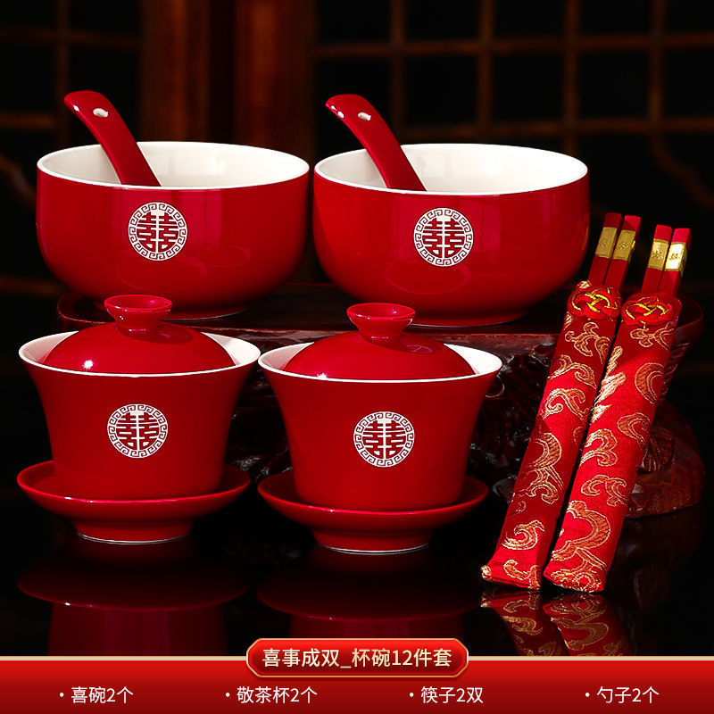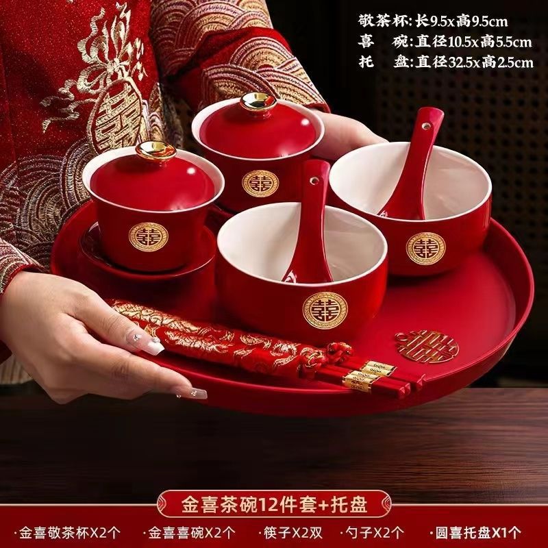 수정 된 토스트 컵 결혼식 세트 덮인 그릇 젓가락 빨간 축제 그릇 웨딩 티 세트 토스트 컵