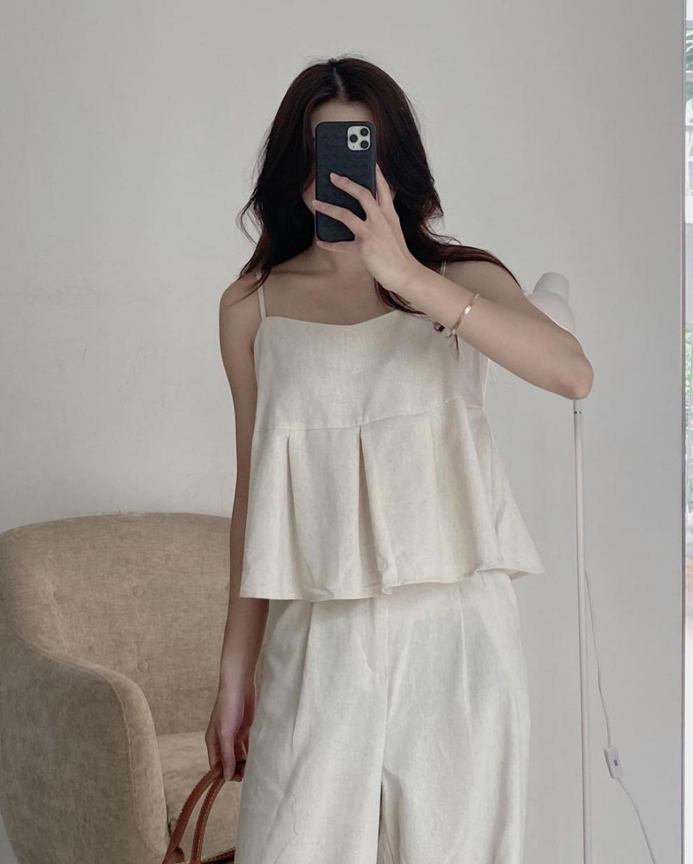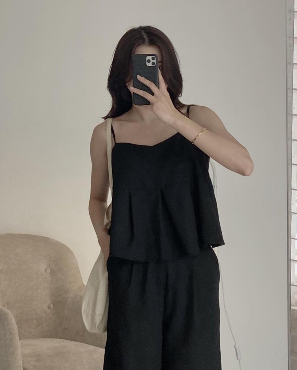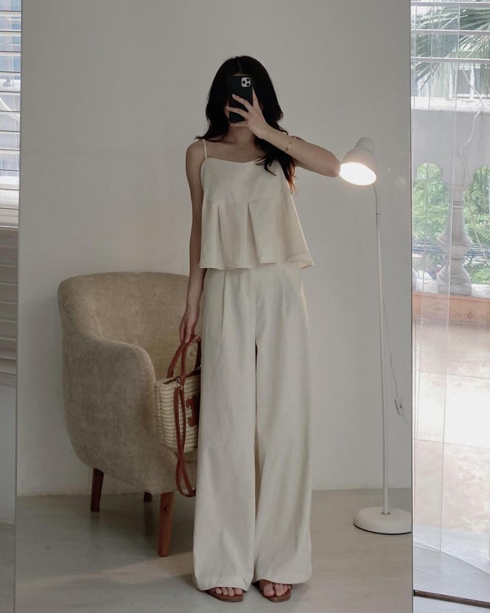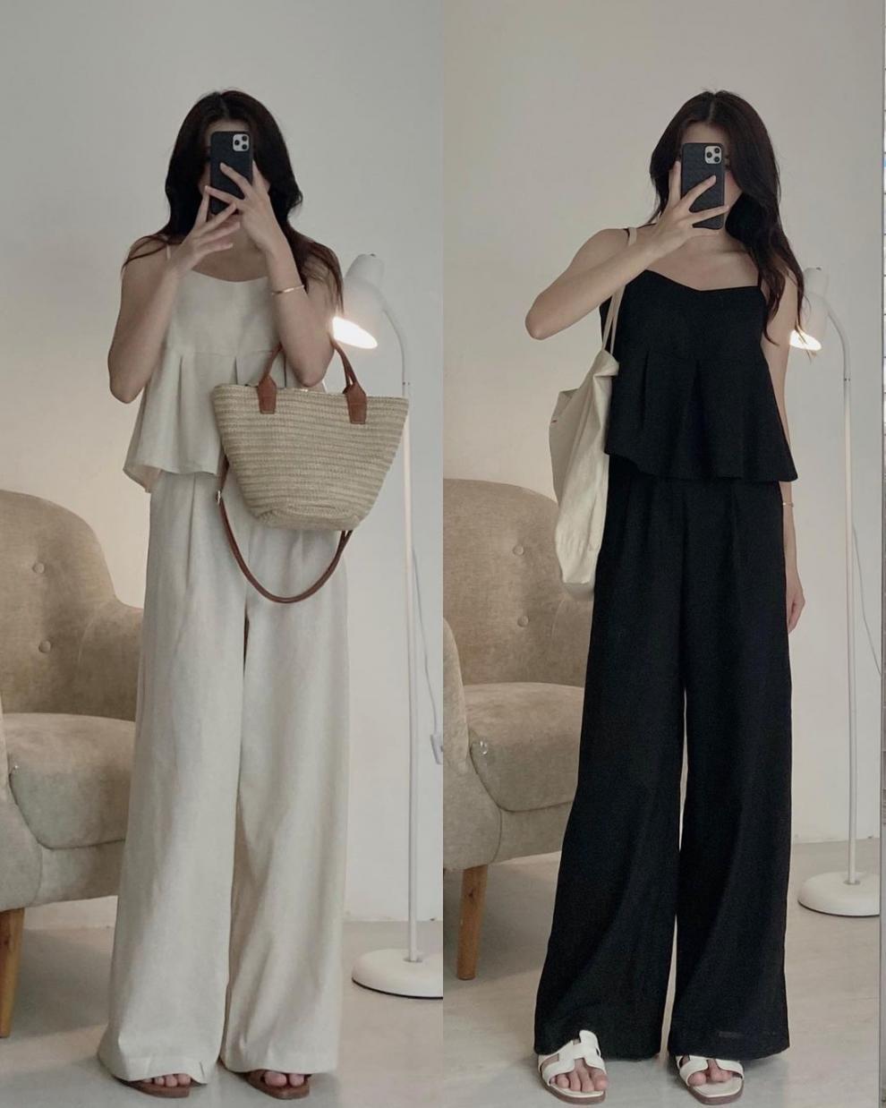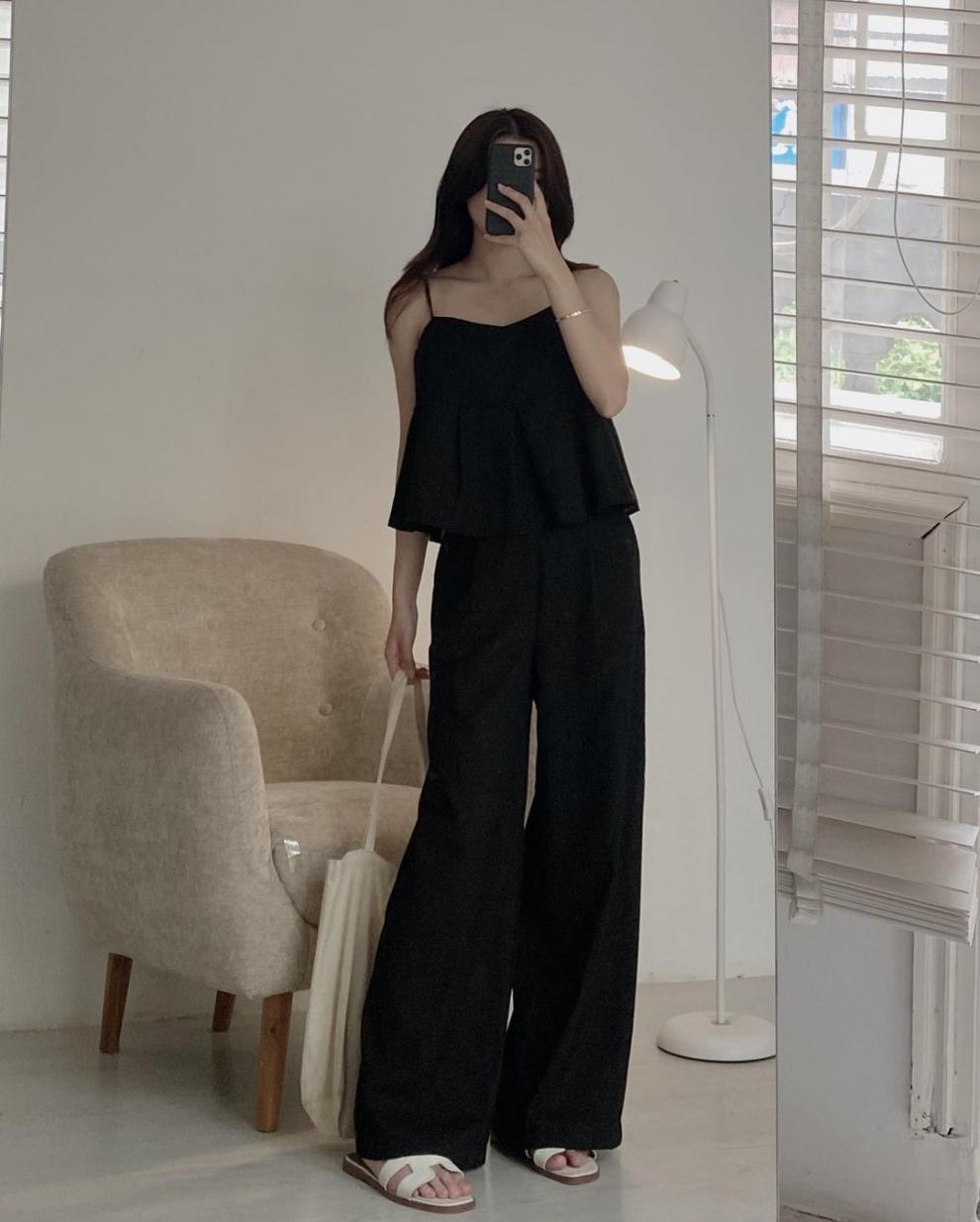 여름 2025 프랑스 심플 스퀘어 칼라 솔리드 컬러 카미솔 하이 허리 올 매치 와이드 레그 캐주얼 바지 세트 트렌디스토어 가기