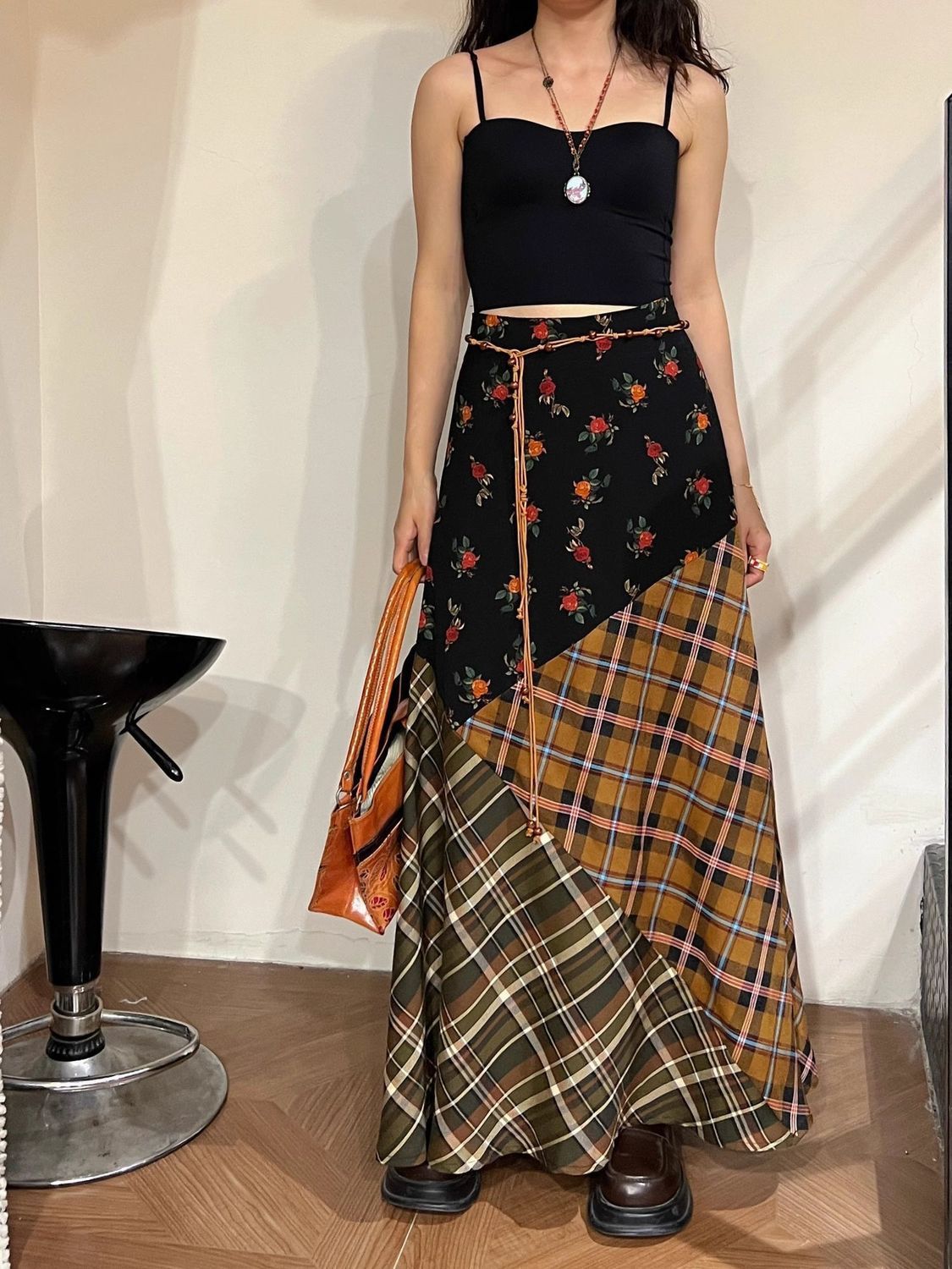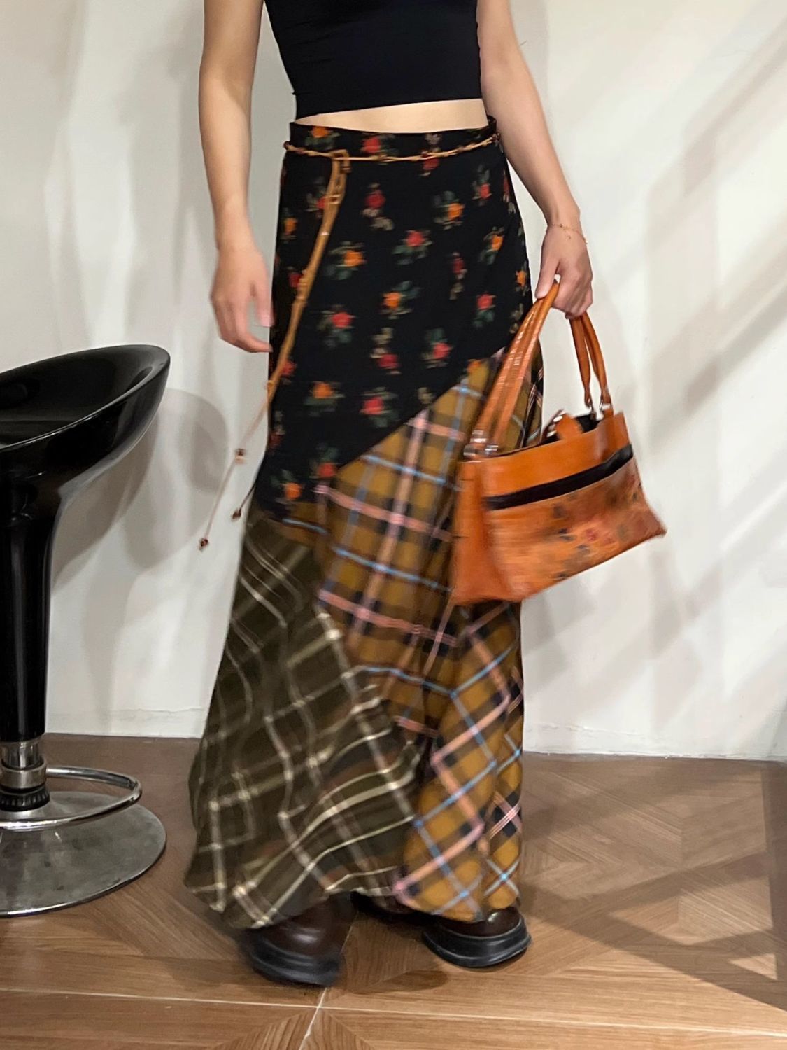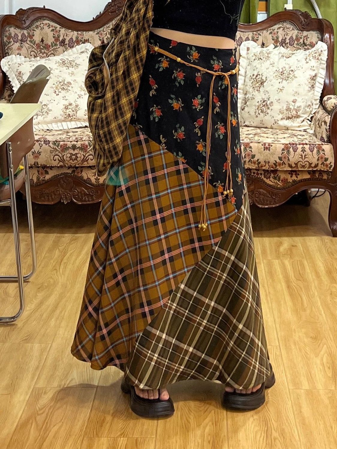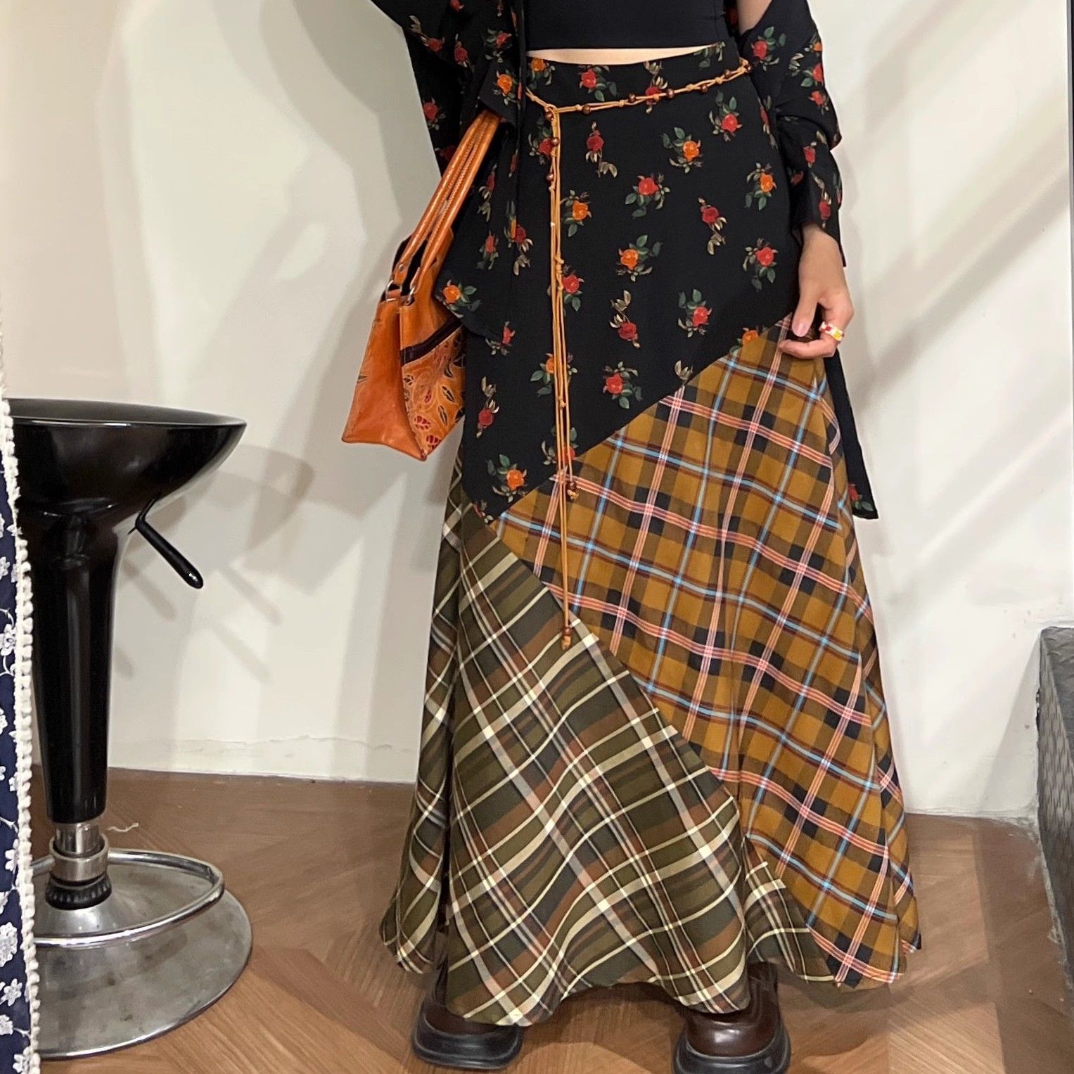 빈티지 스티칭 격자 무늬 스커트 퍼지 슈퍼 슬림 A-라인 롱 스커트스토어 가기