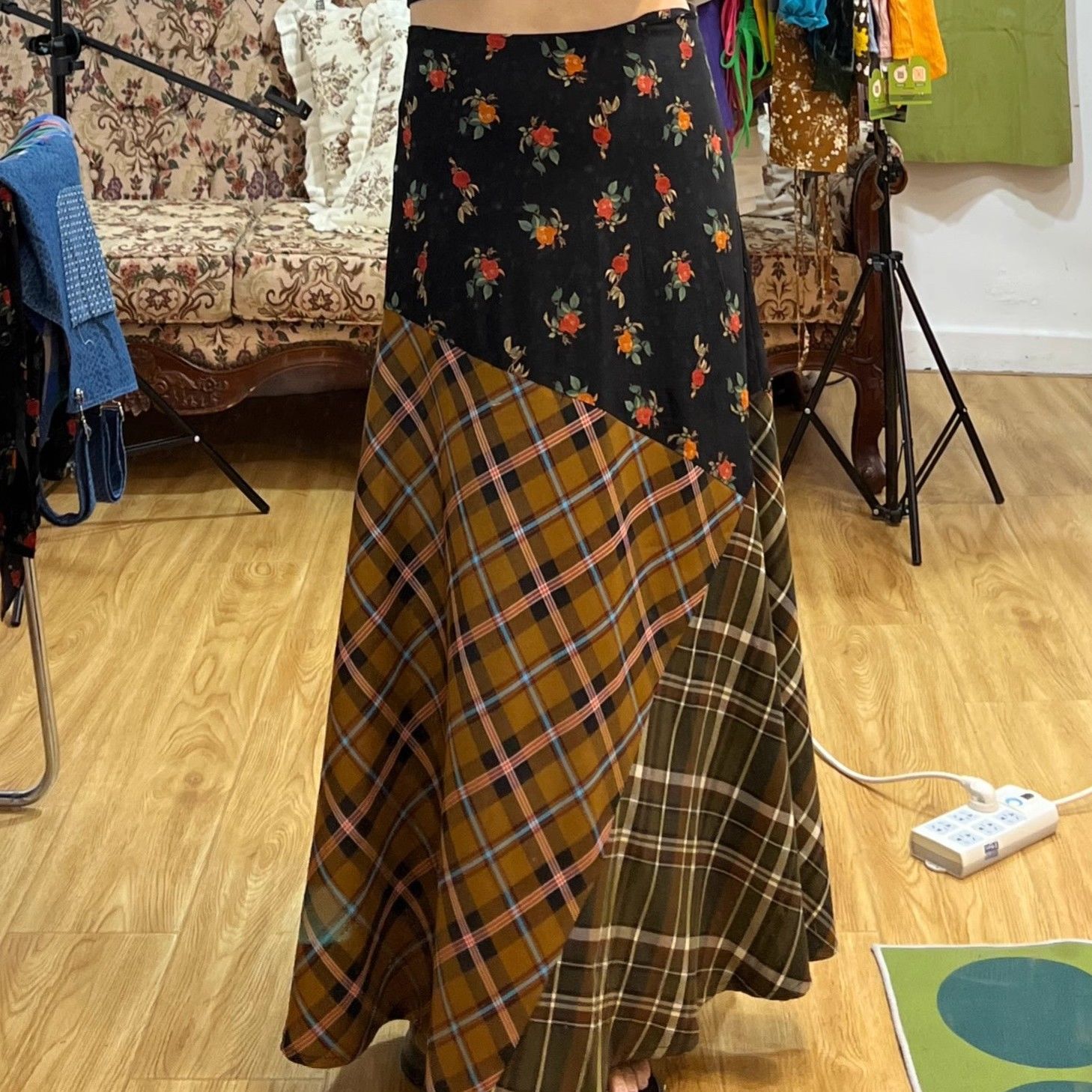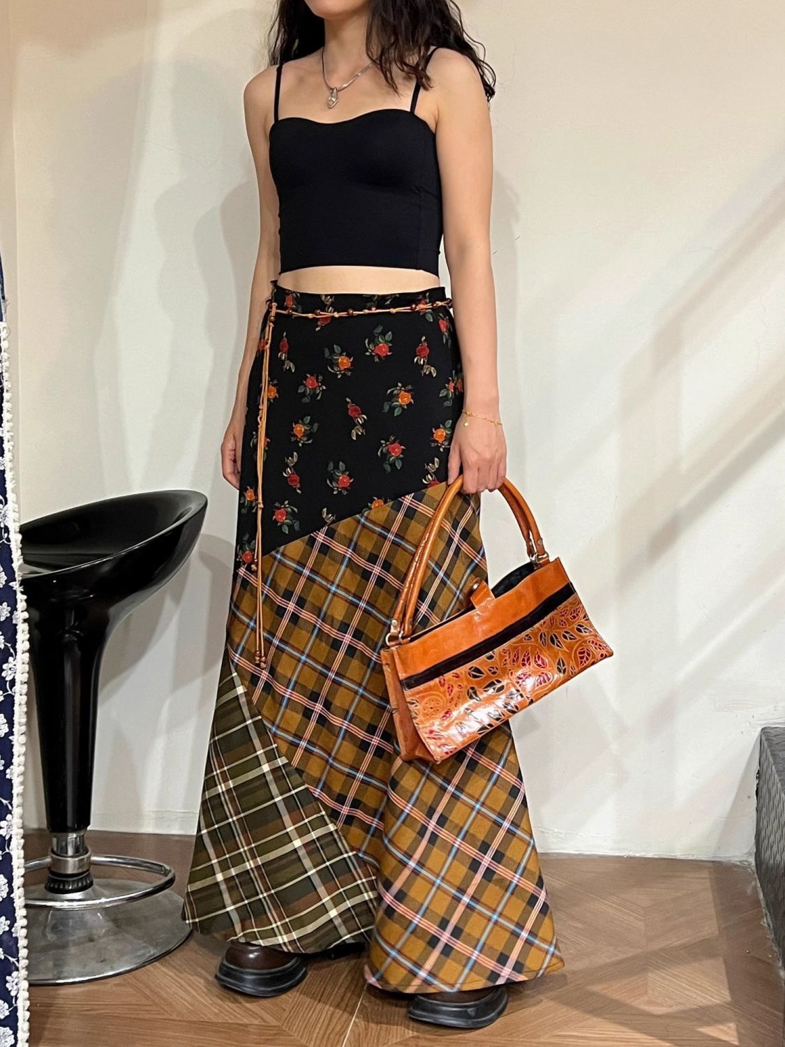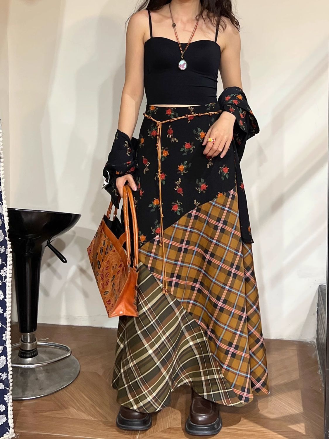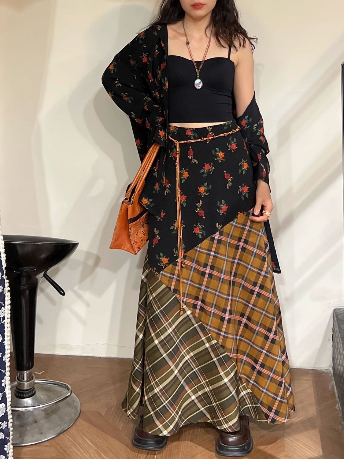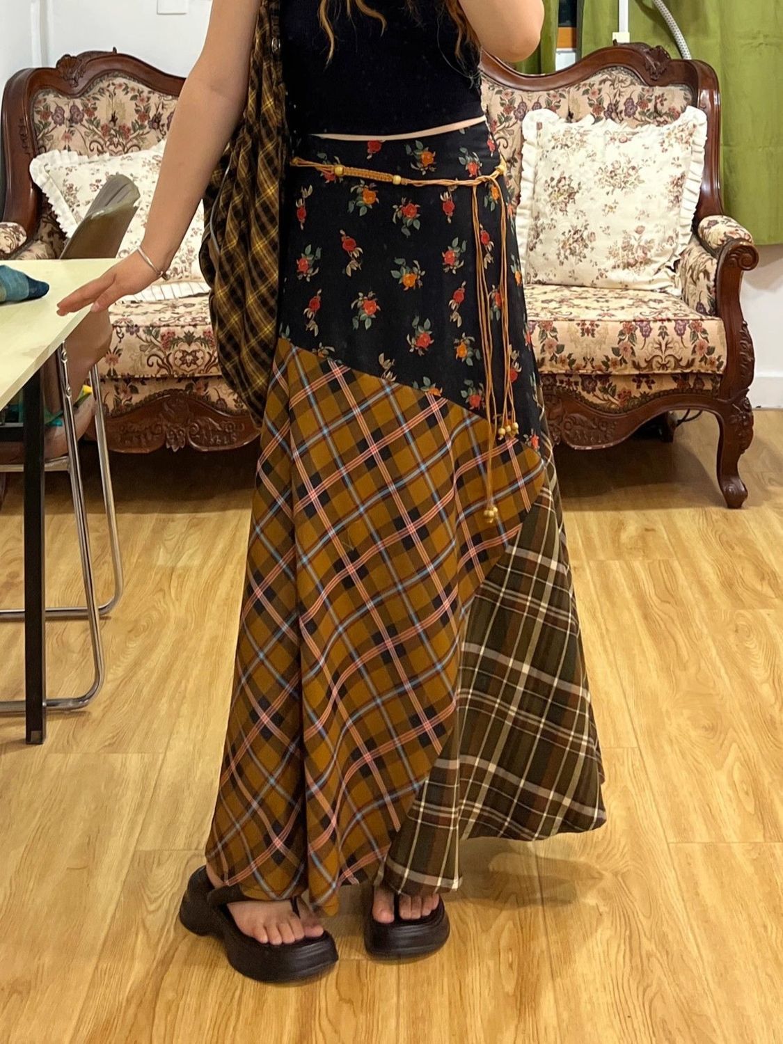 빈티지 스티칭 격자 무늬 스커트 퍼지 슈퍼 슬림 A-라인 롱 스커트스토어 가기