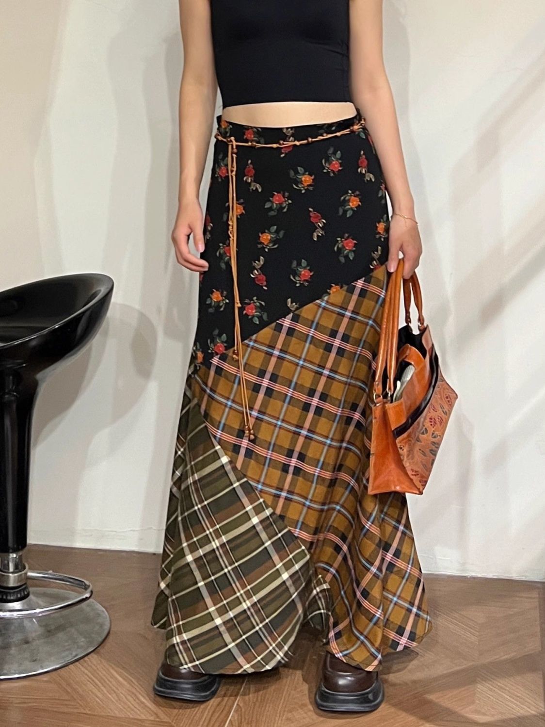빈티지 스티칭 격자 무늬 스커트 퍼지 슈퍼 슬림 A-라인 롱 스커트