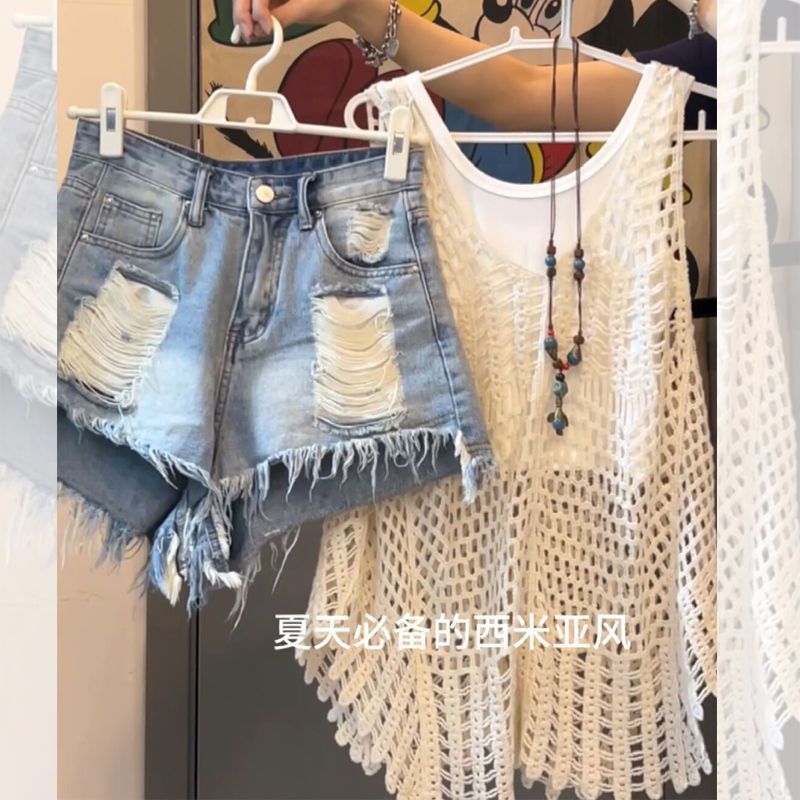 여름은 여성의 2025 새로운 한국식 속이 빈 블라우스 버 홀 데님 반바지 3 피스 패션 세트 세트를 착용합니다.스토어 가기