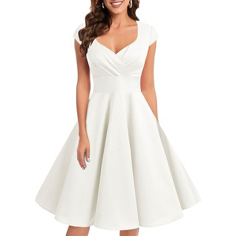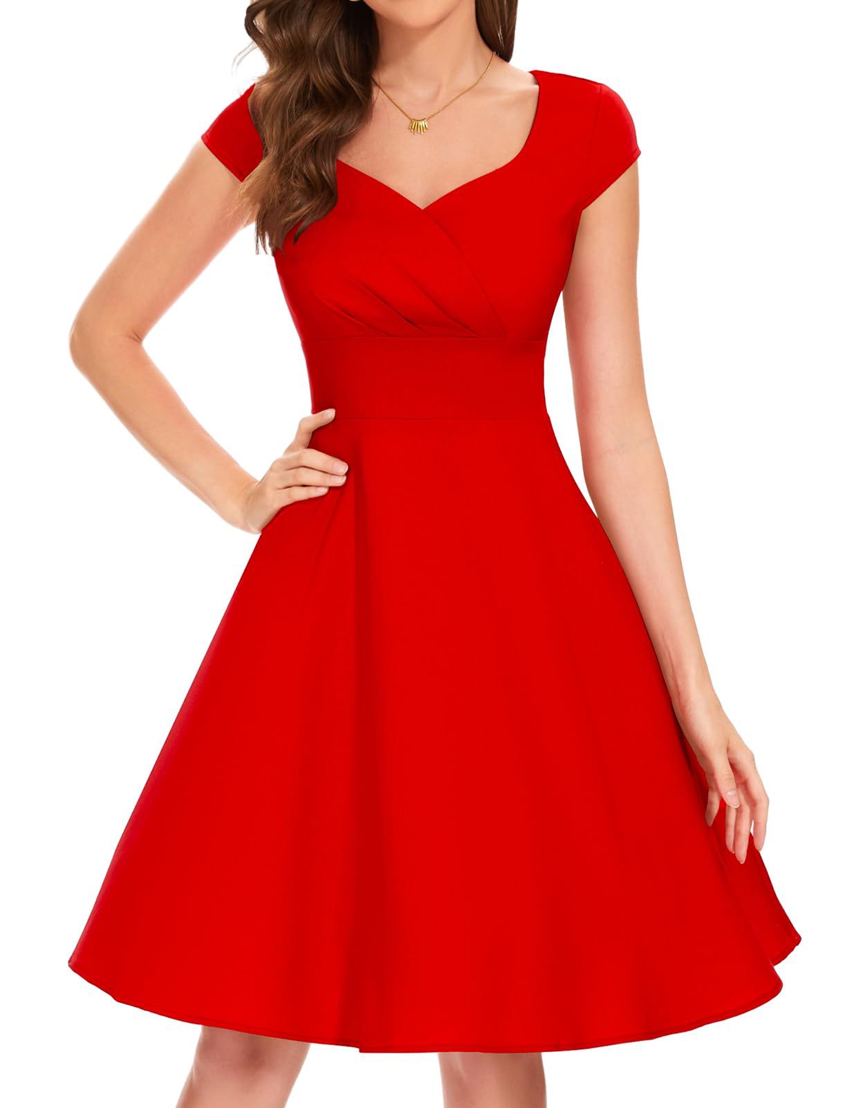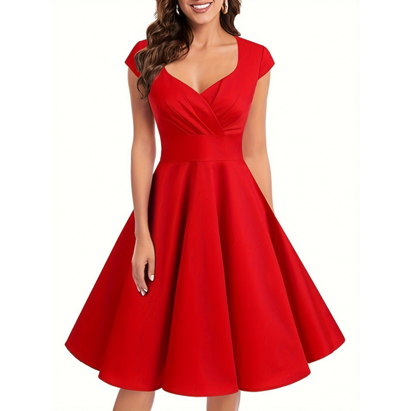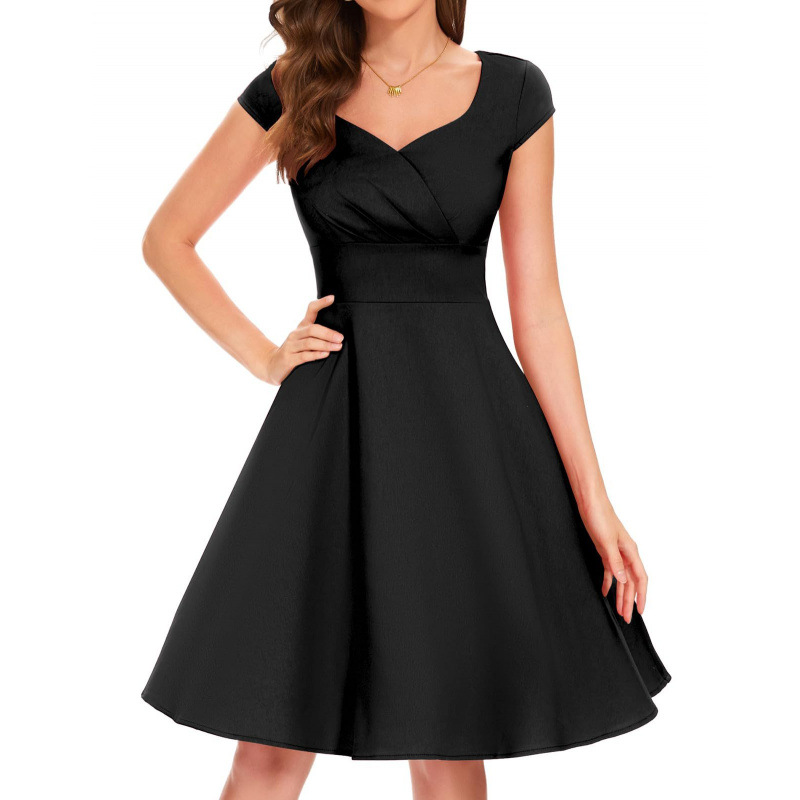 핫 세일 새로운 레트로 여성 의류 V-넥 반소매 타이트 허리 단색 대형 스윙 원피스 패션 라이트 럭셔리 우아함