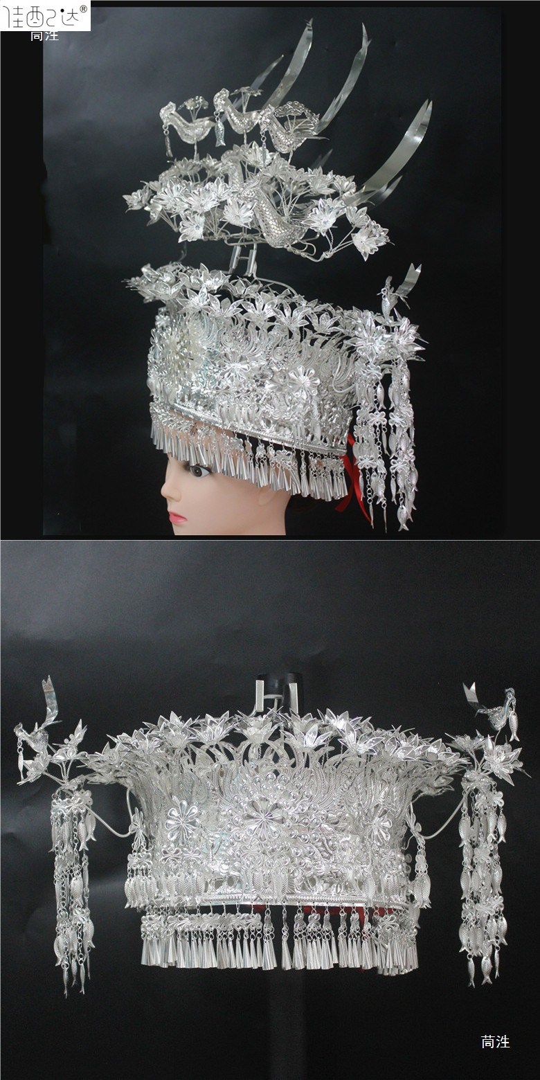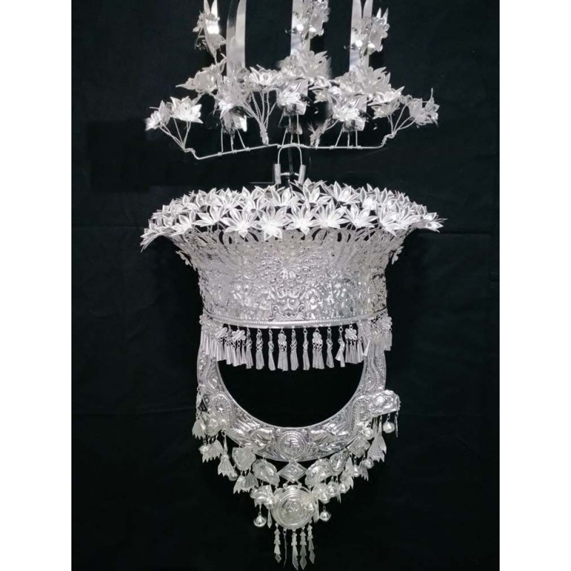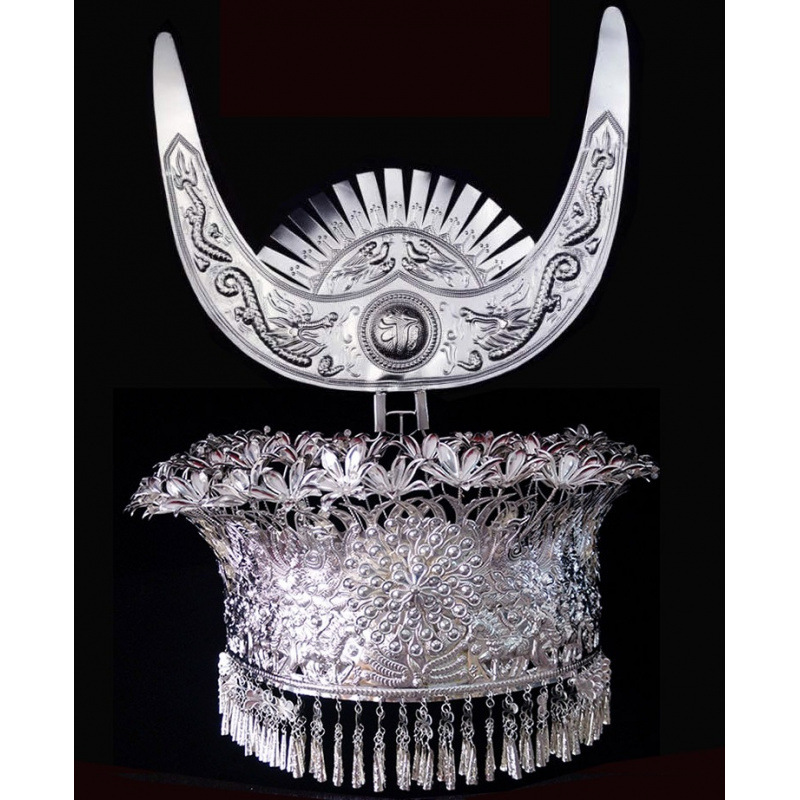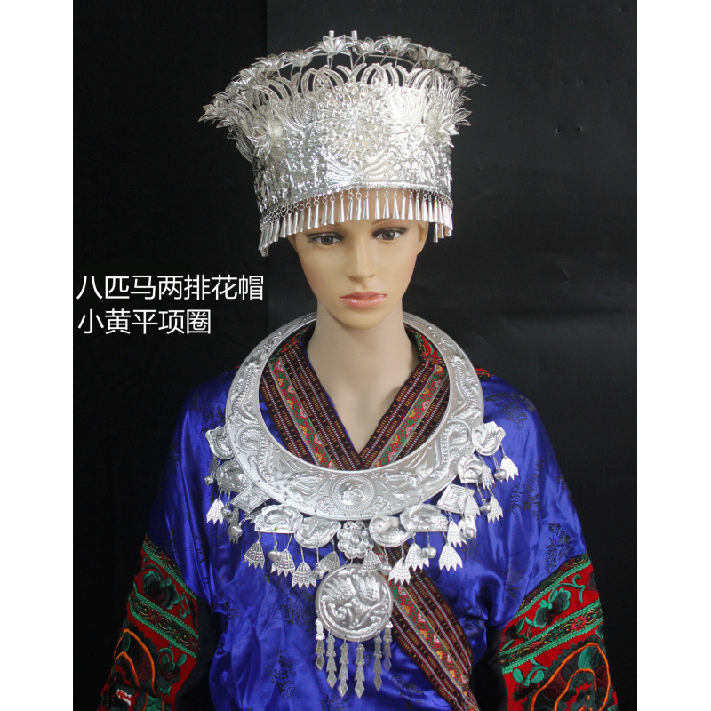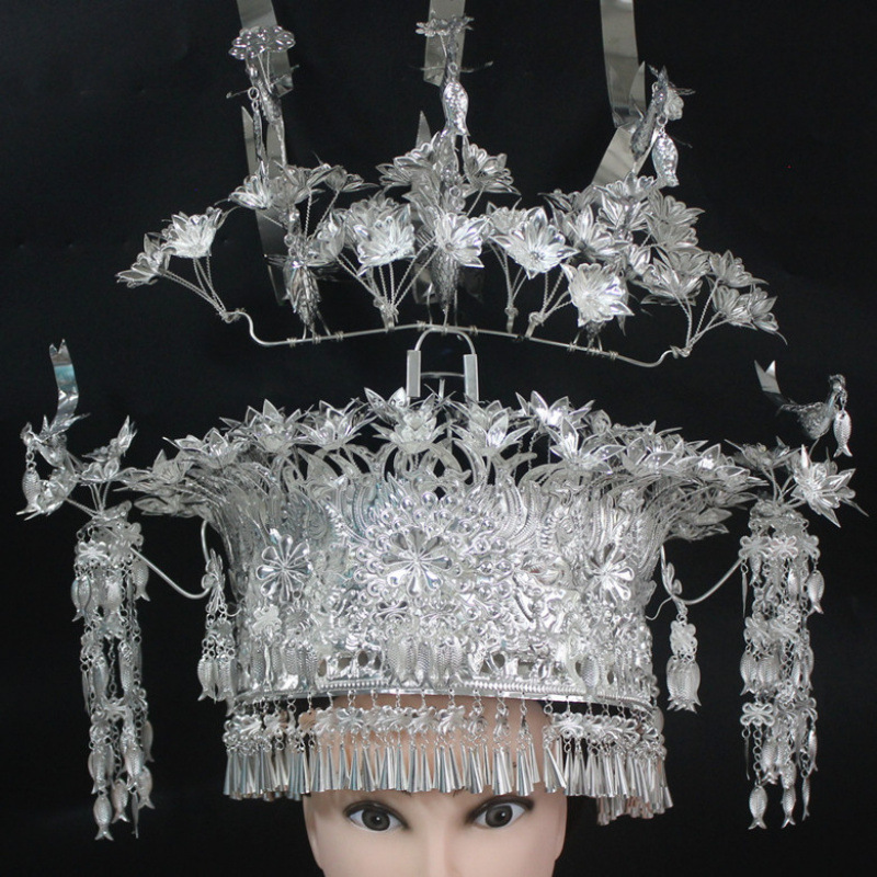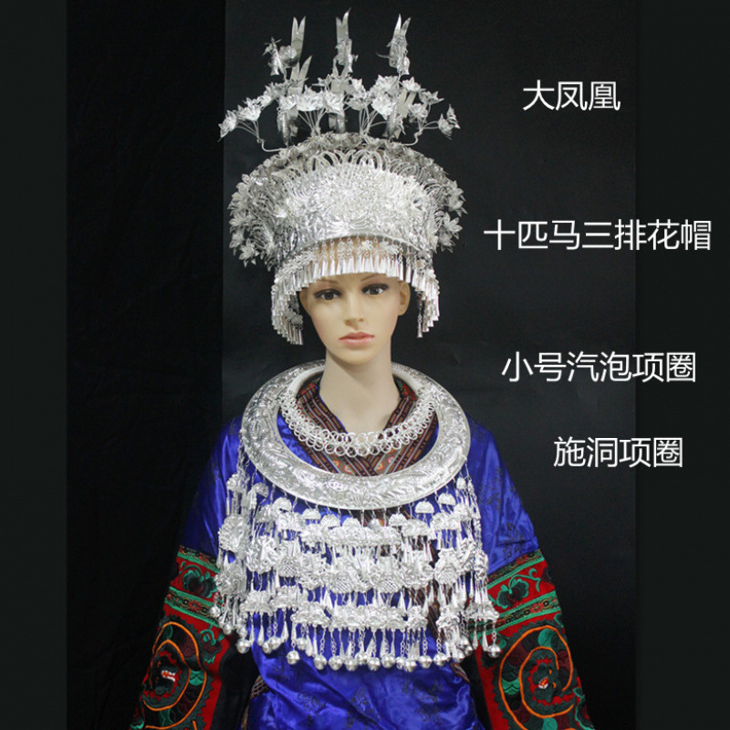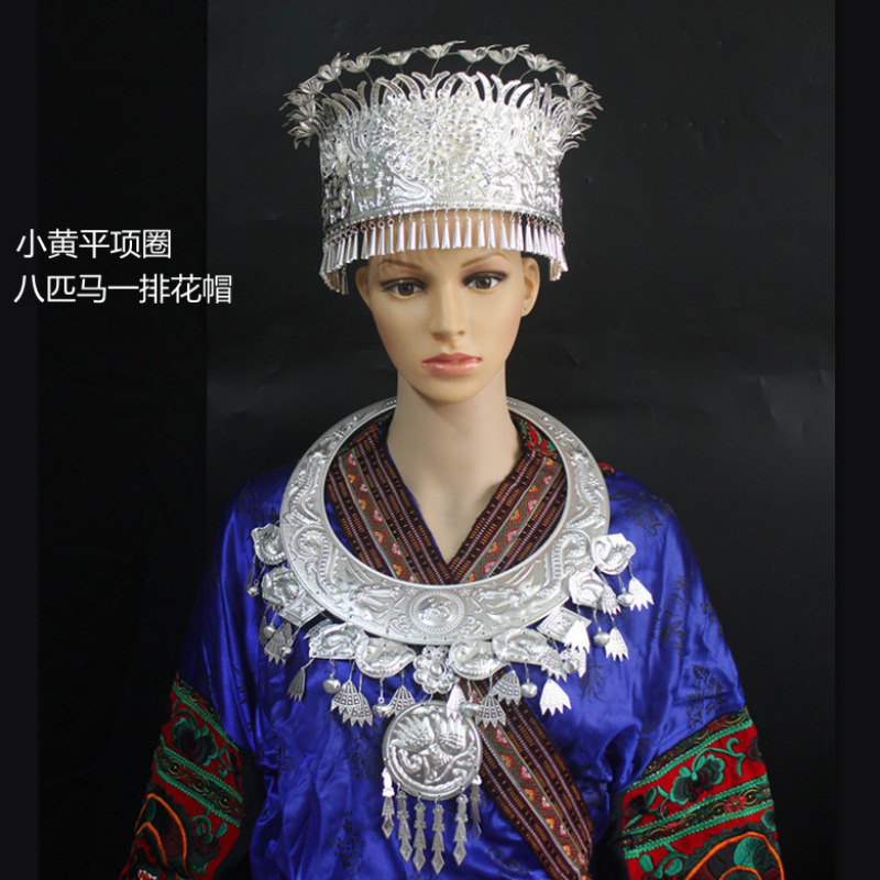 Guizhou 소수 실버 액세서리 공연 의류 액세서리 Miao 여성 축제 착용 원피스 모자 세트