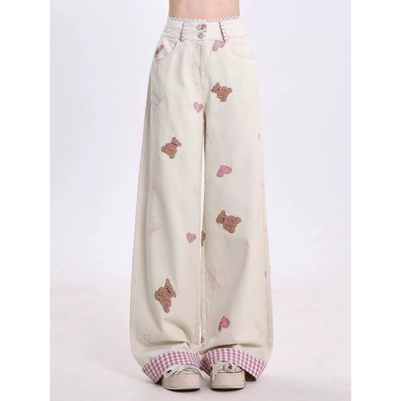 곰 자수 레이스 바느질 넓은 다리 청바지 여성용 봄 2025 높은 허리 느슨한 스트레이트 플레이드 컬링 바지