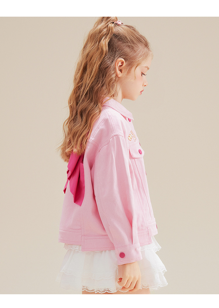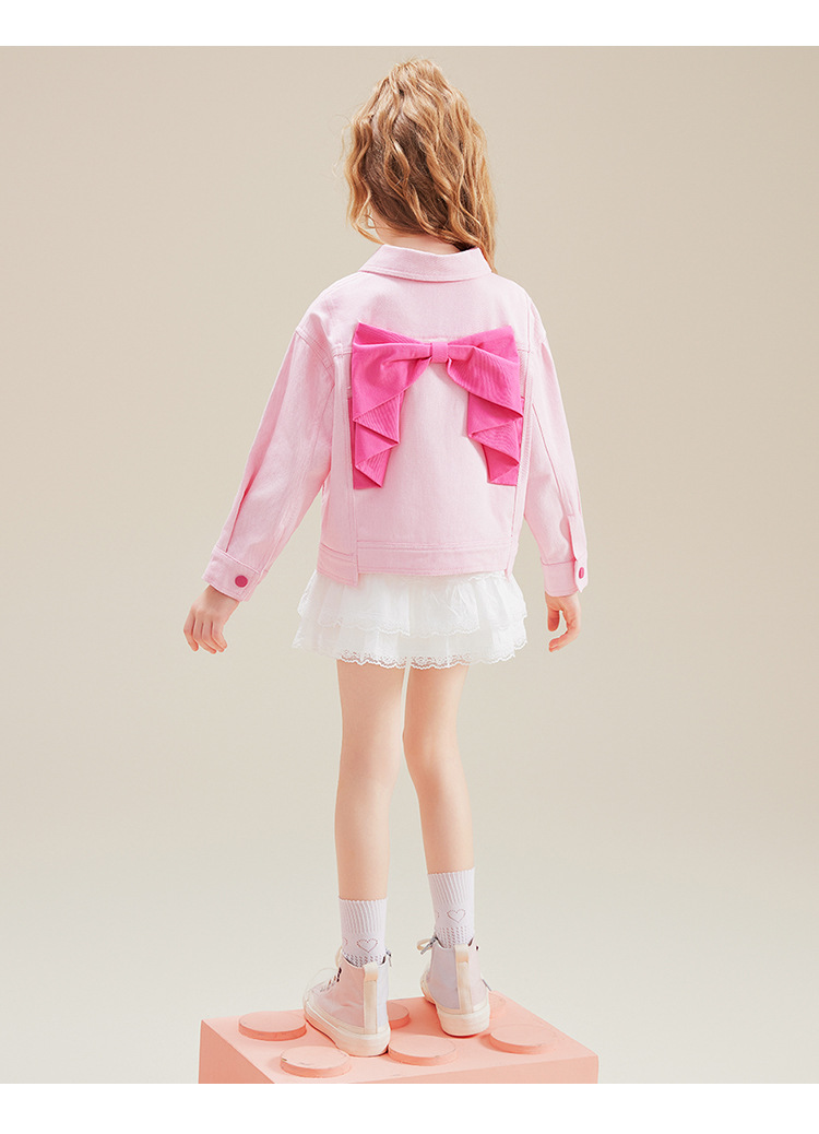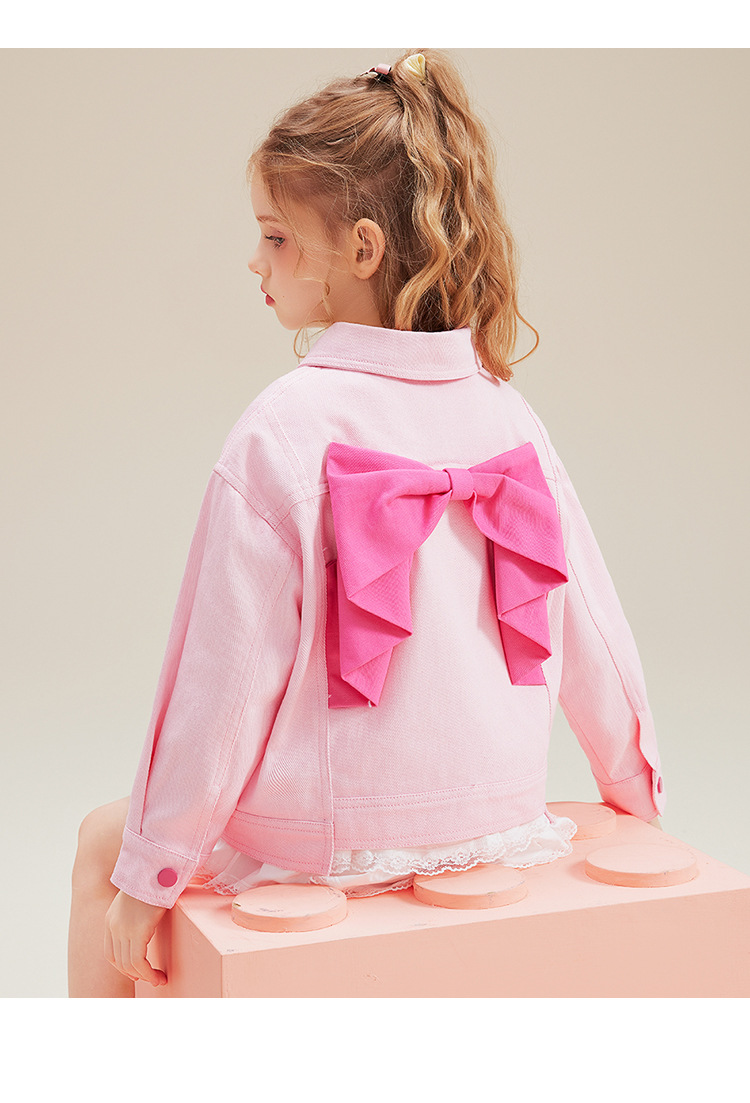 HelloKitt Girls 가을 핑크 데님 재킷 새로운 중대형 아동복 뒷면 큰 리본 코트