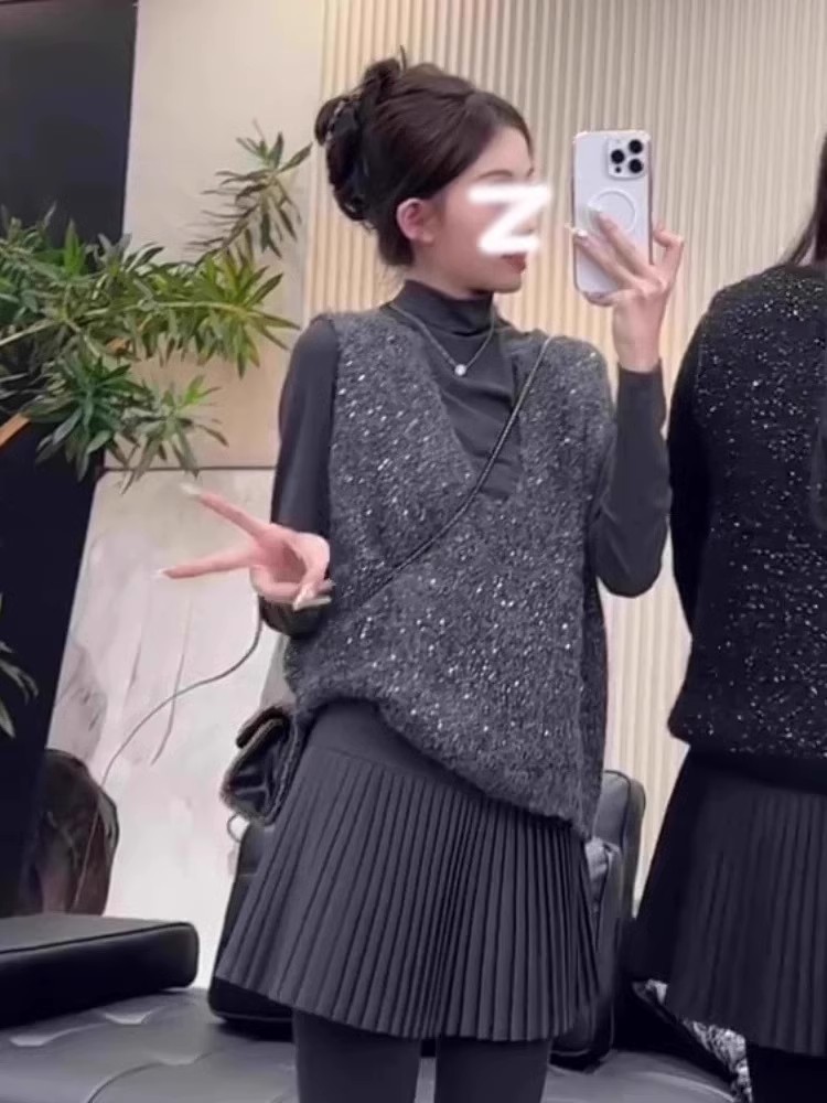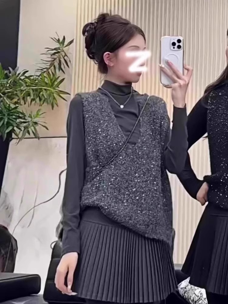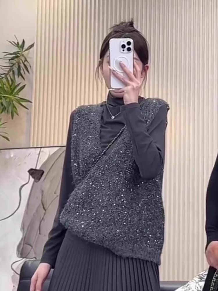 V-Neck 중공업 Sequin Sweater Vest 가을과 겨울 새로운 플러스 사이즈 느슨한 슬림 슬림 슬림리스 스태킹 스웨터 여성 조끼스토어 가기