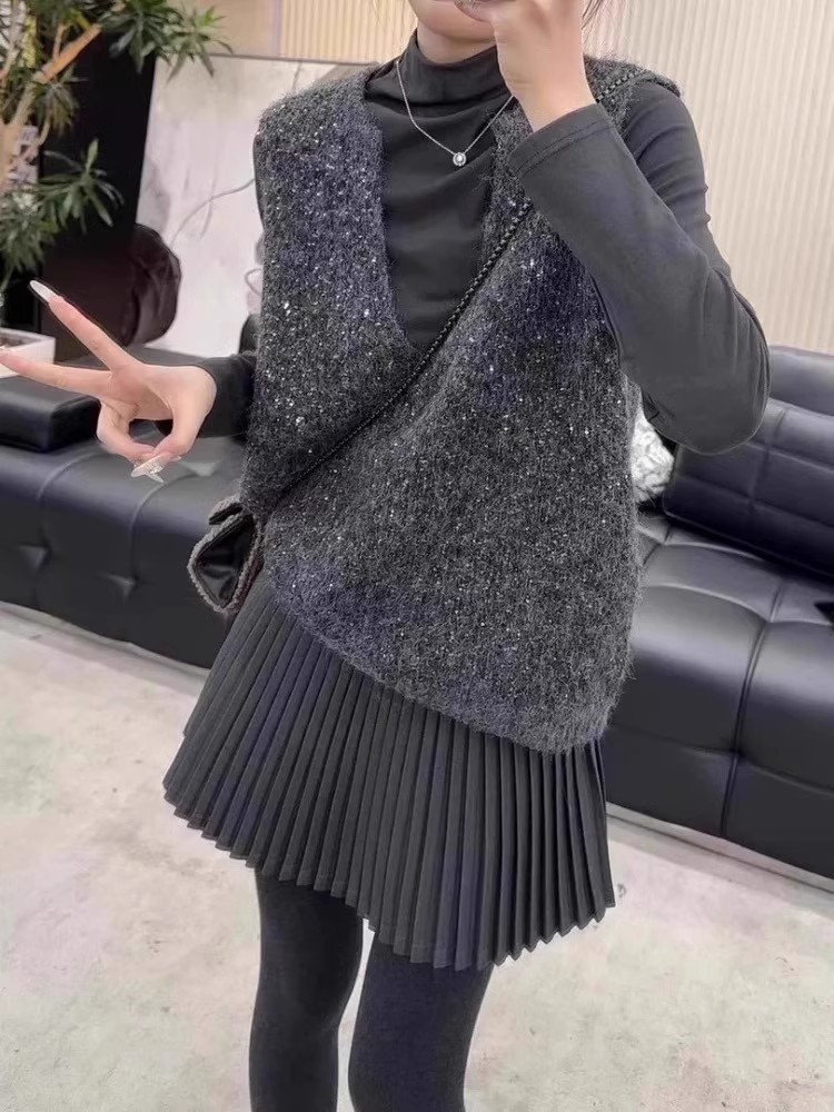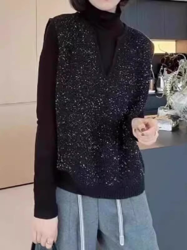 V-Neck 중공업 Sequin Sweater Vest 가을과 겨울 새로운 플러스 사이즈 느슨한 슬림 슬림 슬림리스 스태킹 스웨터 여성 조끼