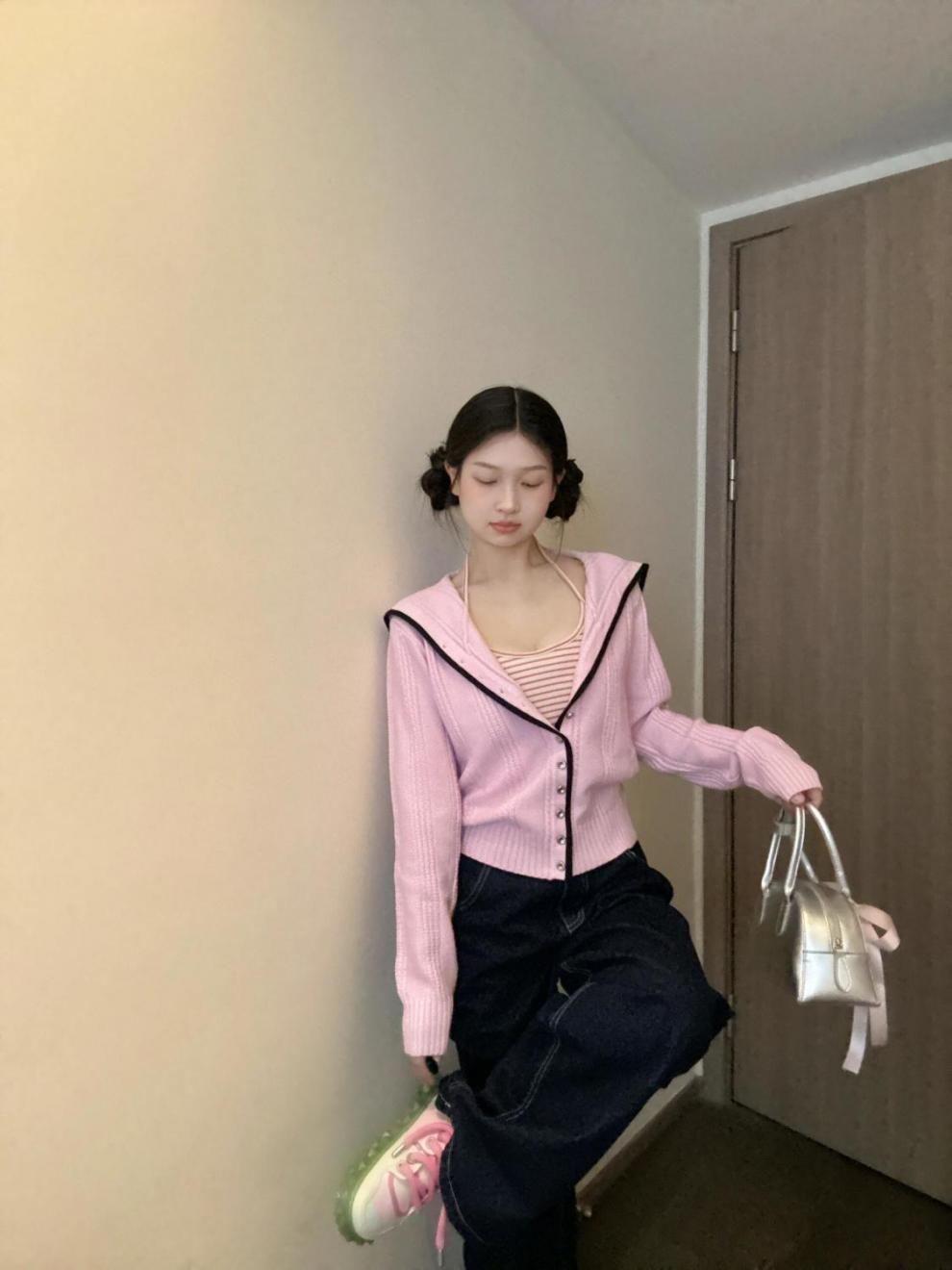 한국식 핑크 대조 컬러 엣지 게으른 칼리지 스타일 실록 니트 스웨터 카디건 슬리밍 우아한 탑 여성의 가을과 겨울스토어 가기