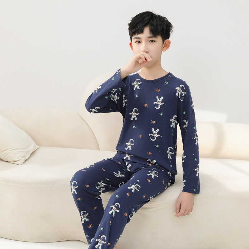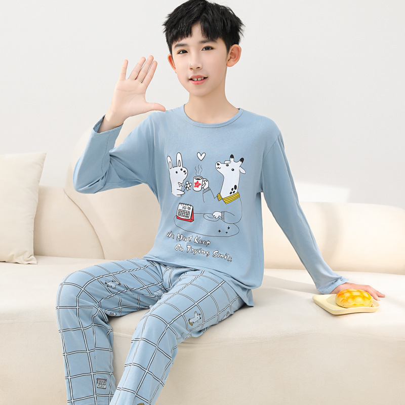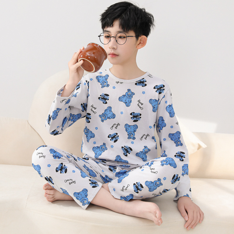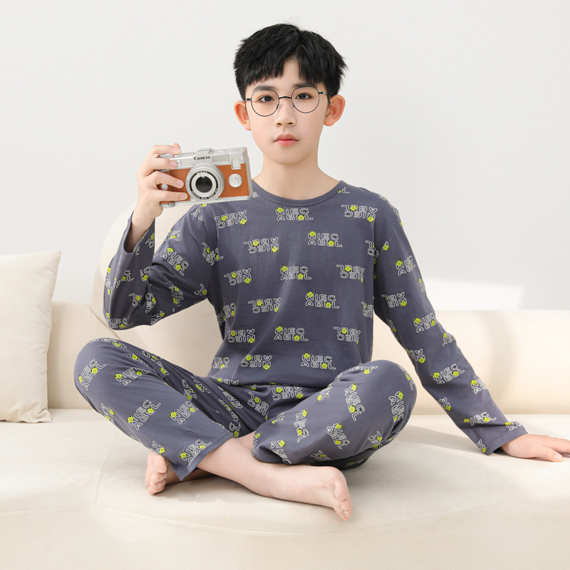 여름 어린이 잠옷 세트 소년의 순수한면 얇은 집 옷 십대 및 소년을위한 여름 긴 소매 에어컨 옷