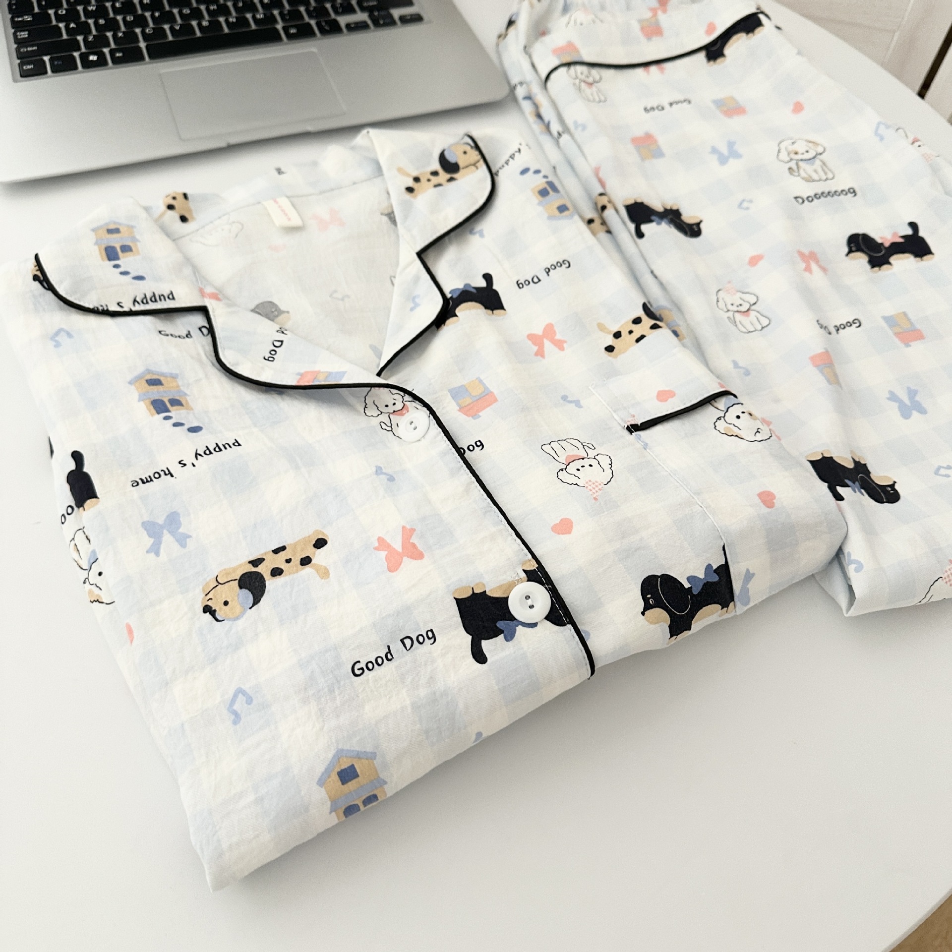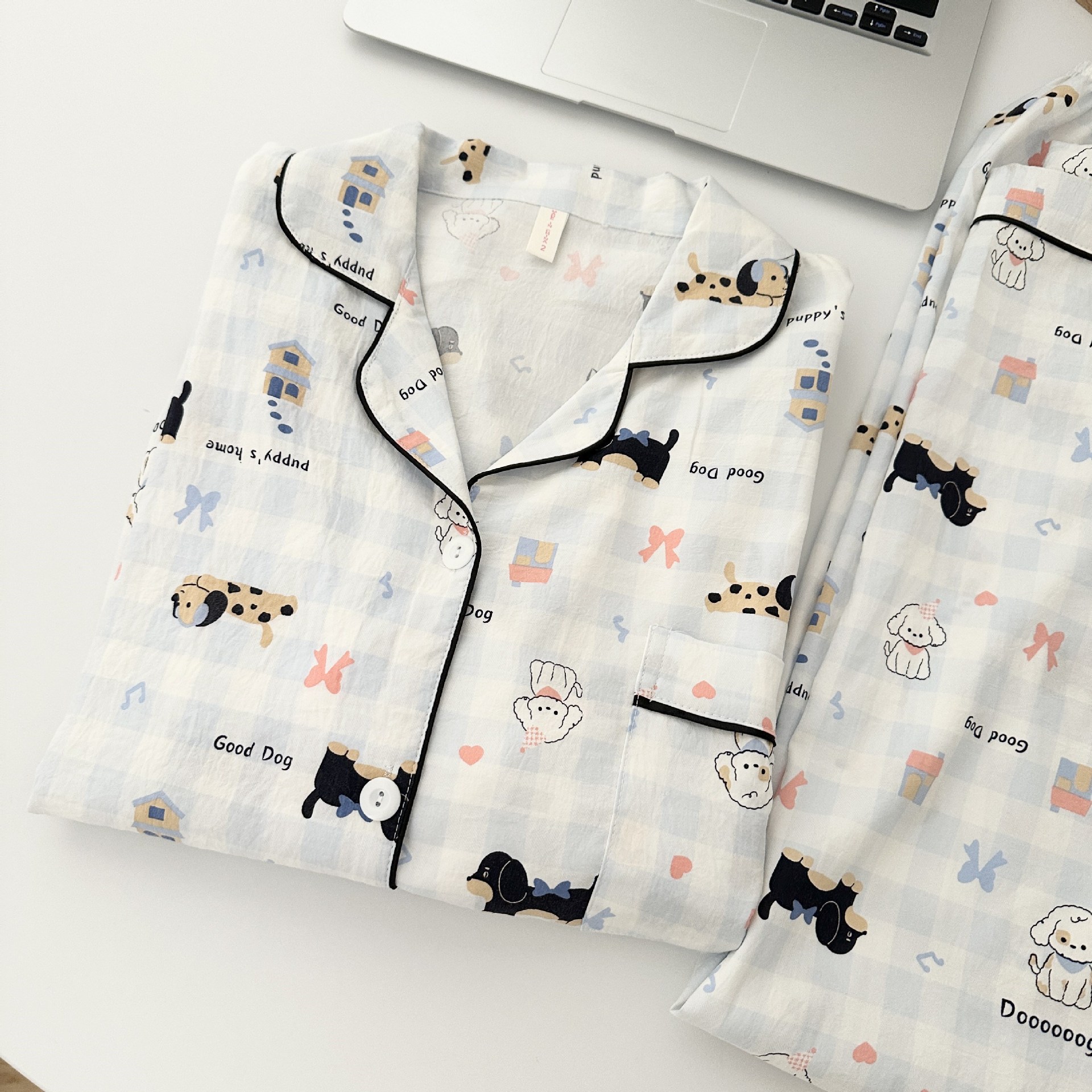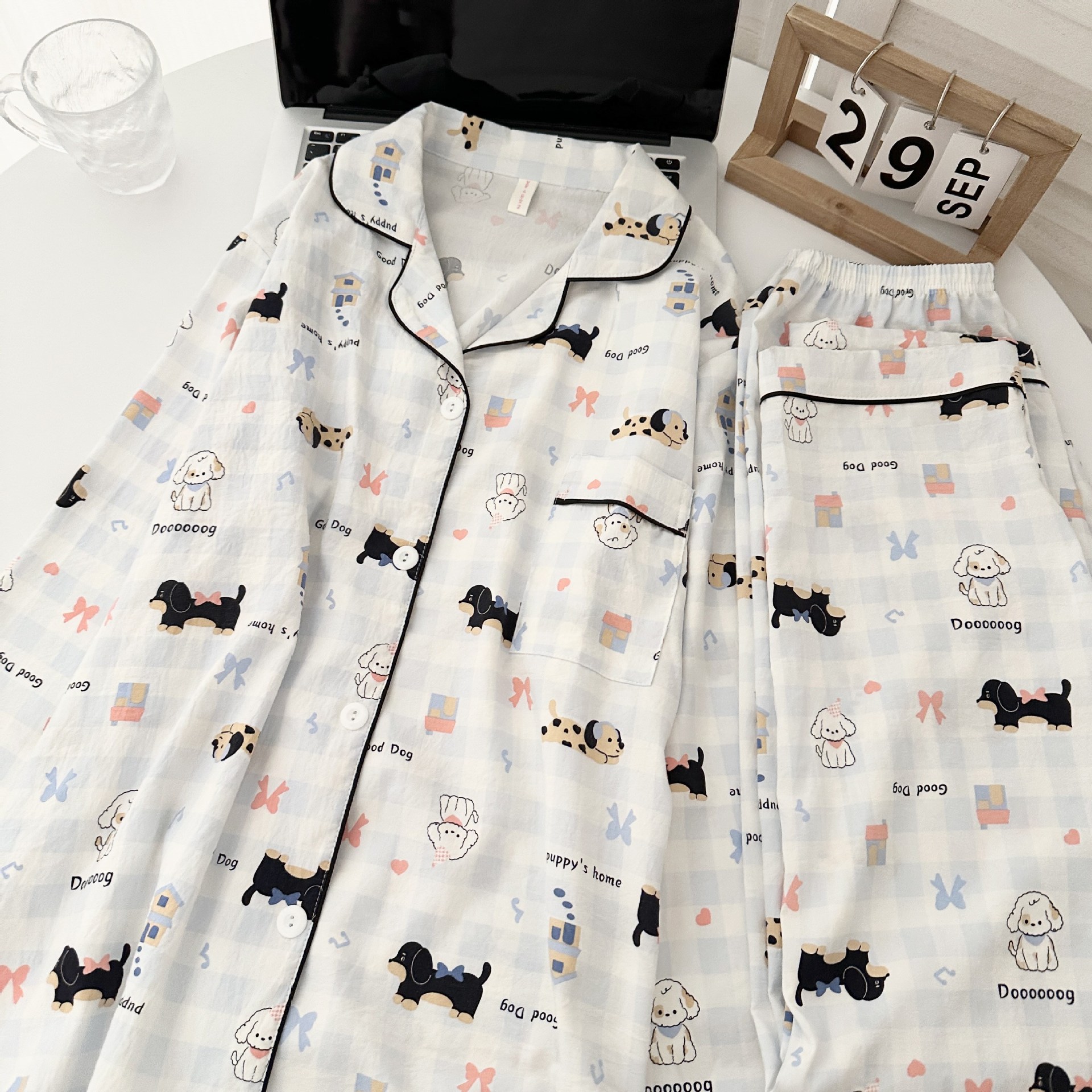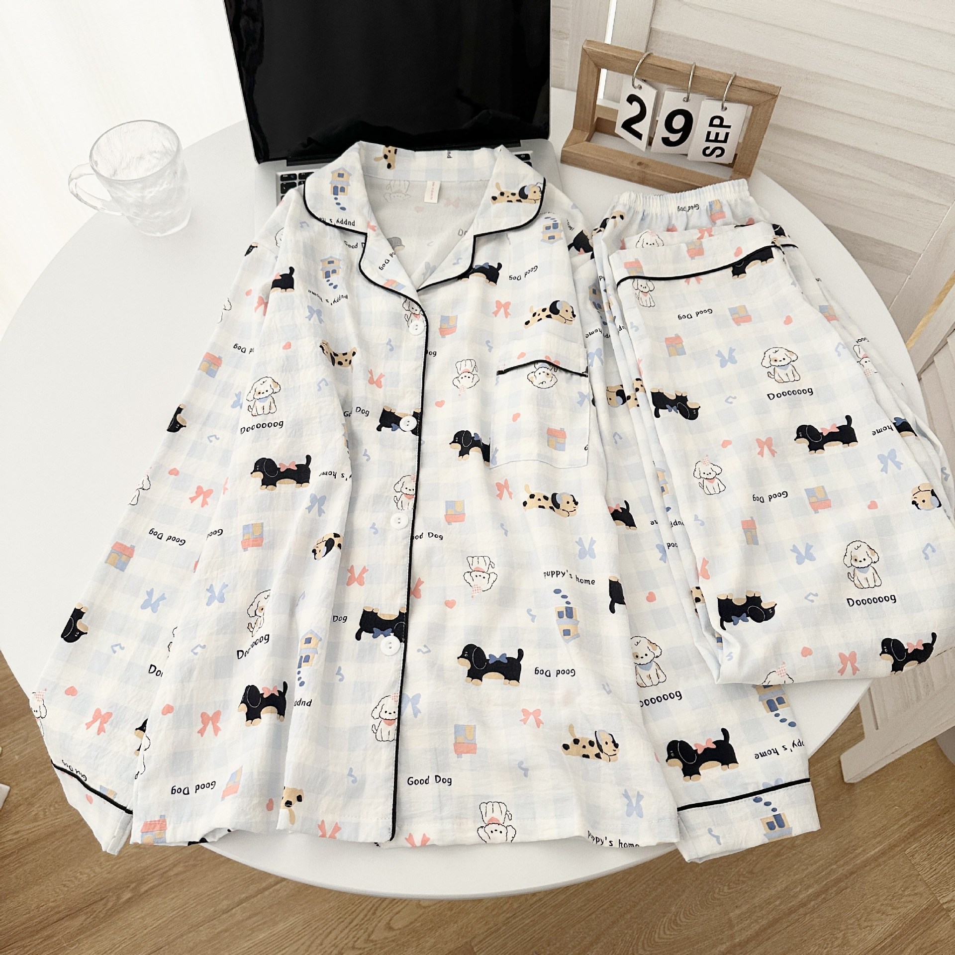 일본식 강아지 잠옷 여성의 봄과 가을 구름 면 긴팔 바지 귀여운 학생의 격자 무늬 외장스토어 가기